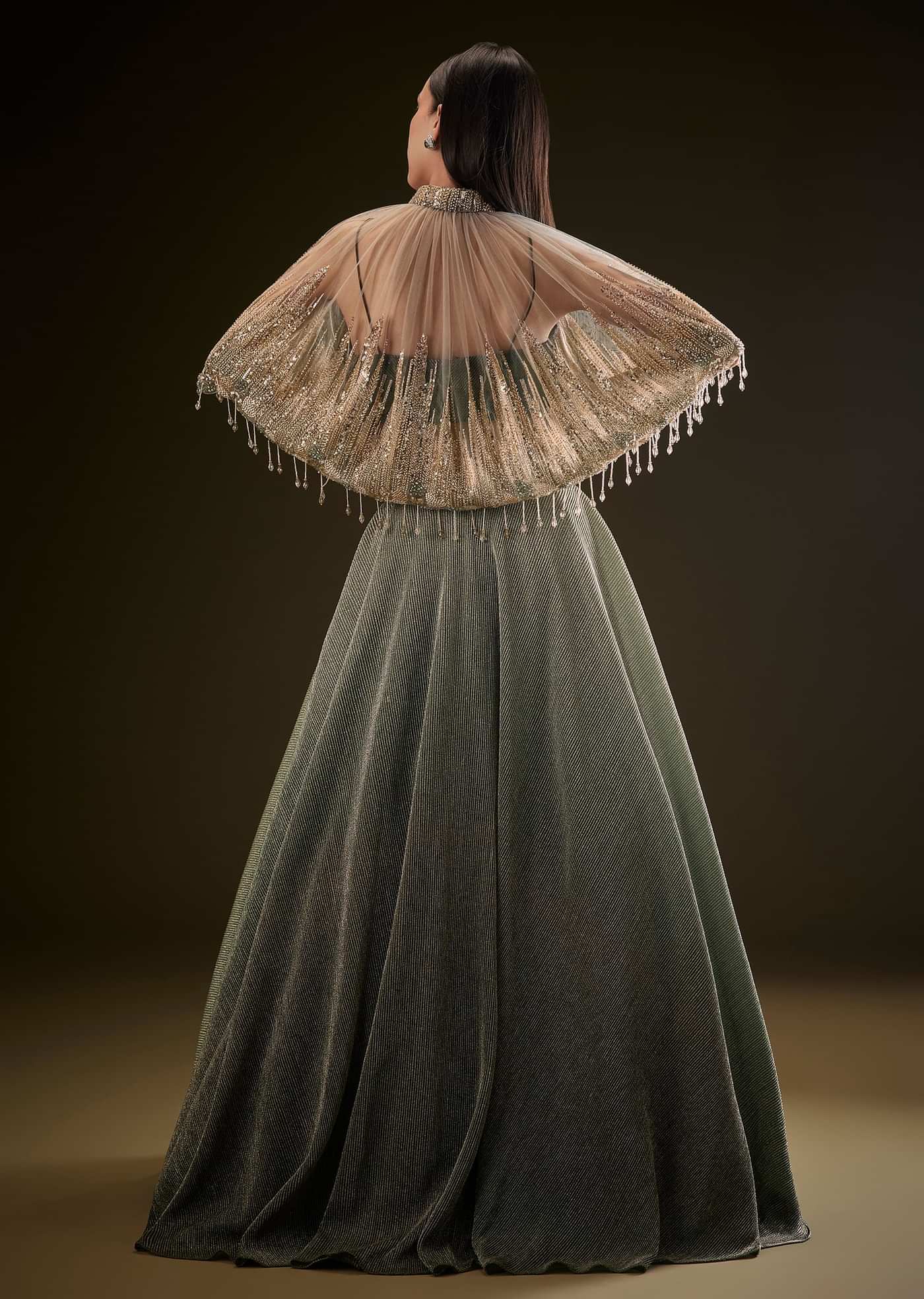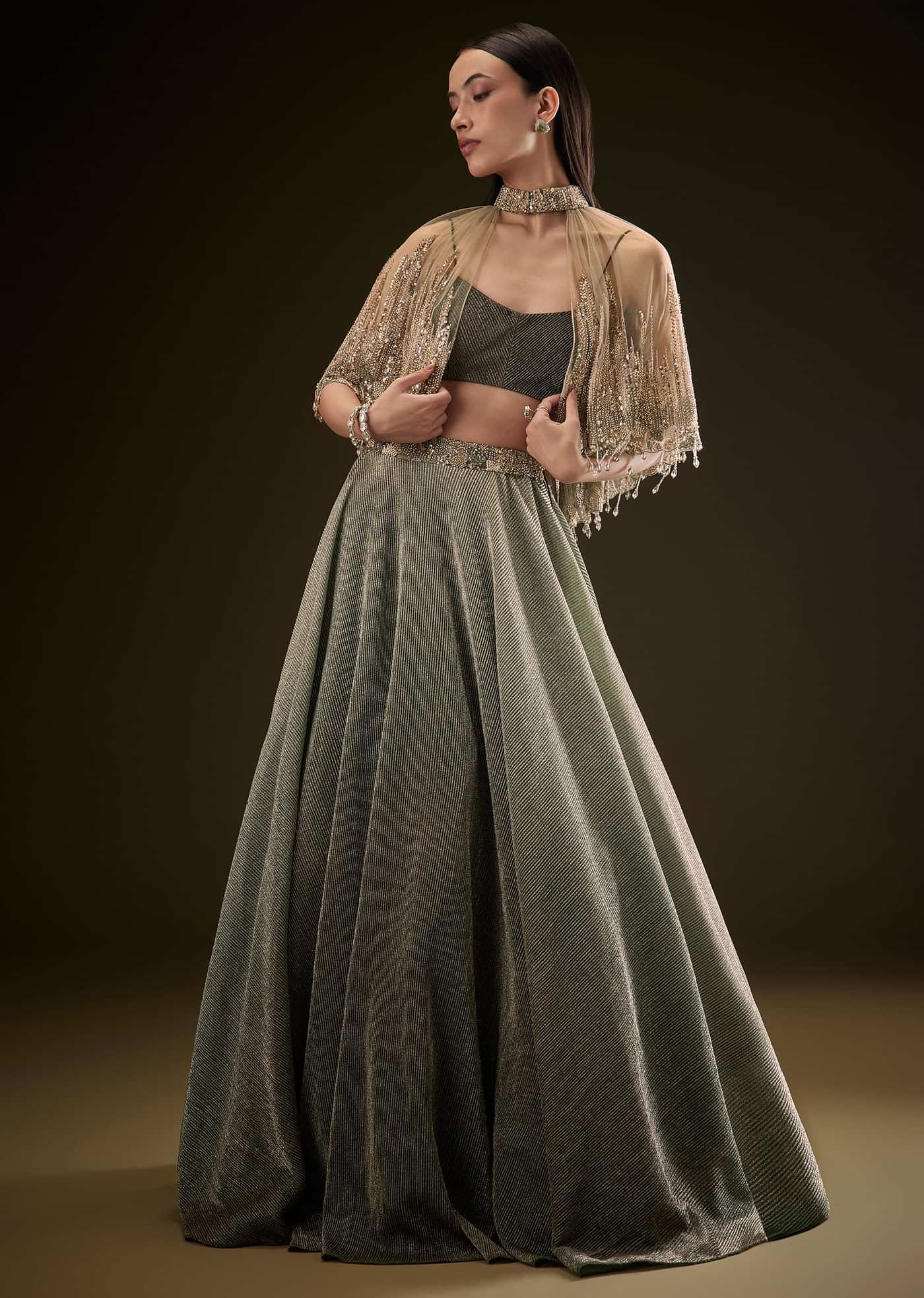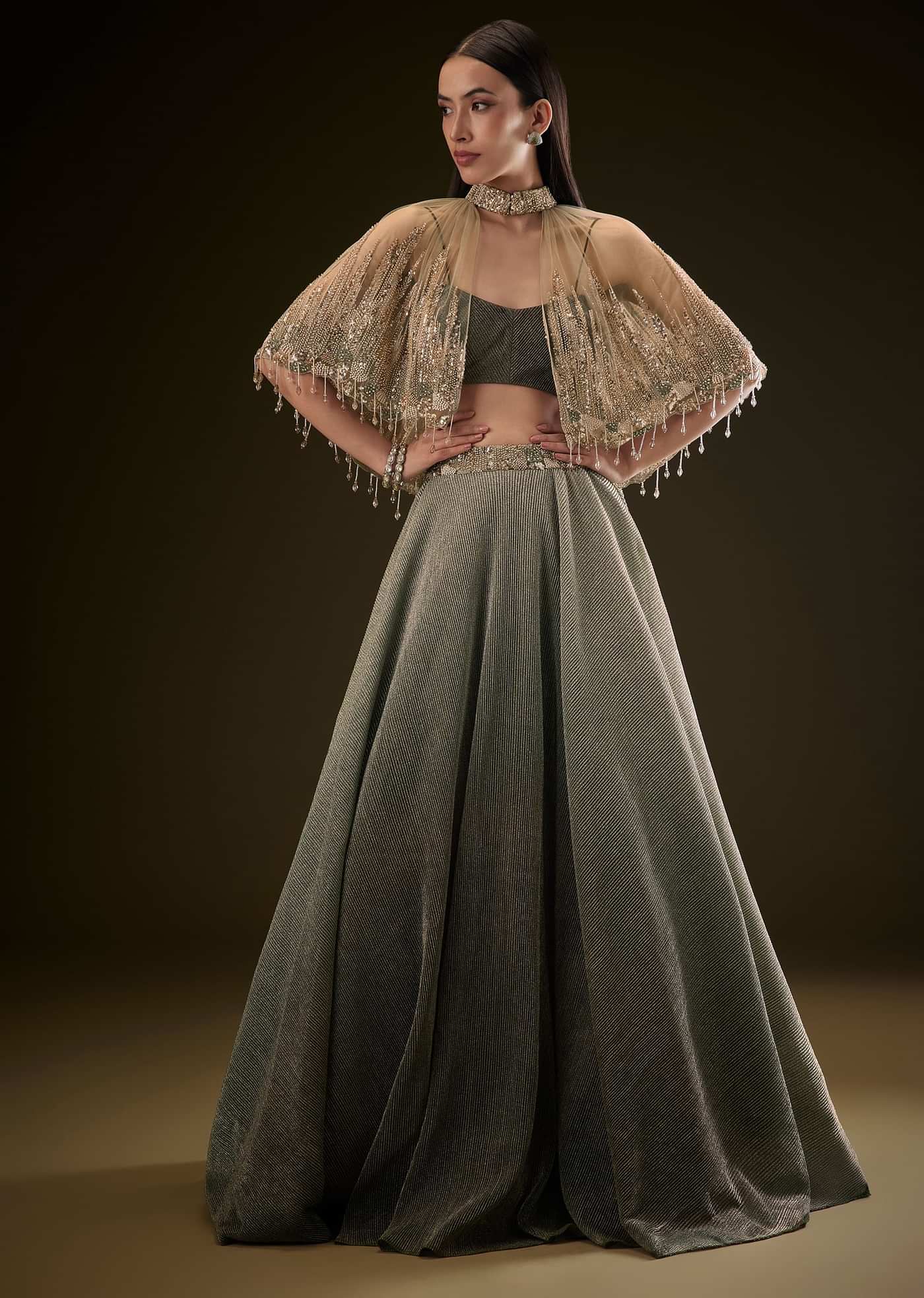 The Flared Lehenga Accentuates The Waistline While The Choker Cape Adds A Structured Elegance Ensuring A Flattering And Sophisticated Fit.