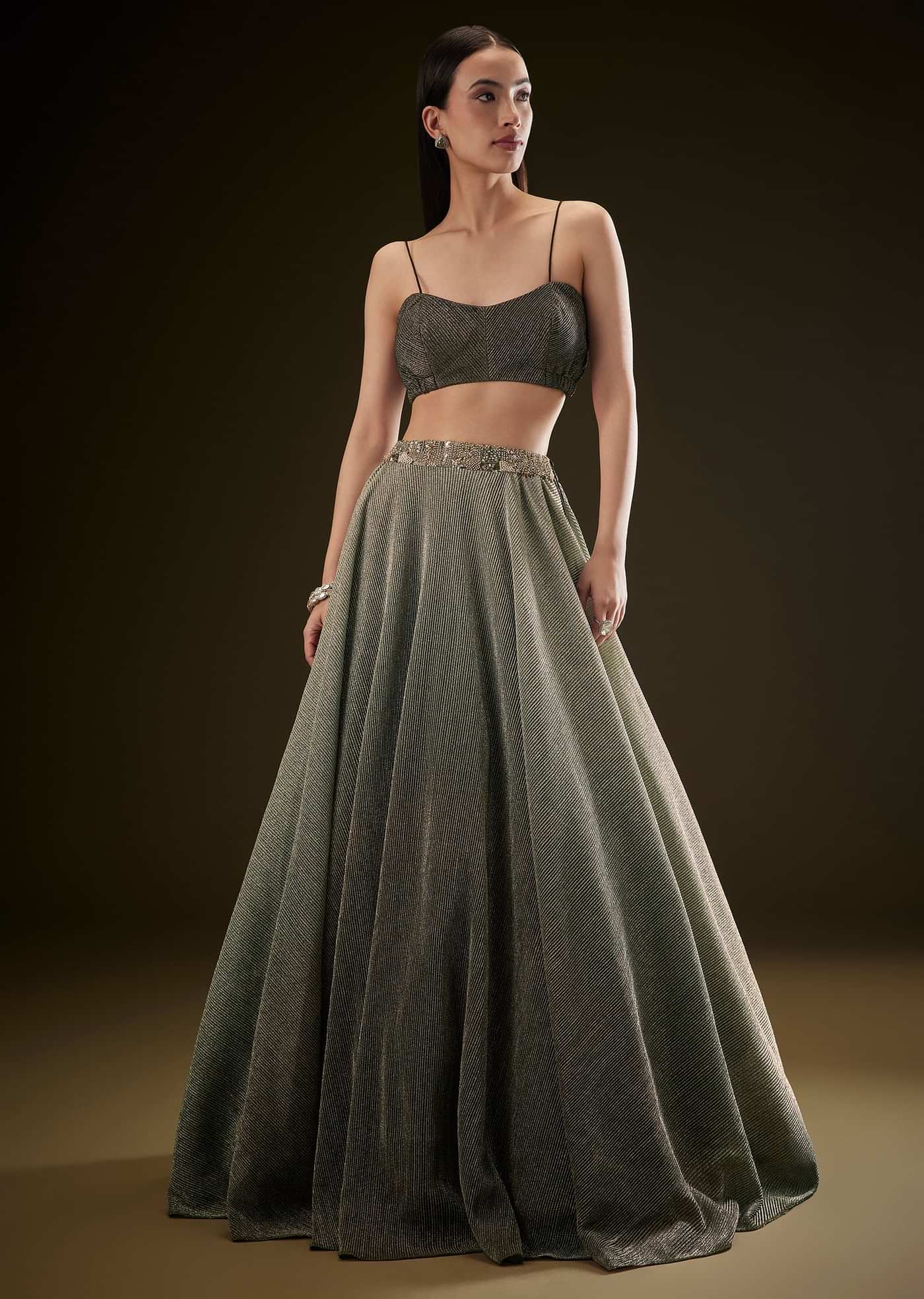 Step Into The Realm Of Majestic Elegance With This Bottle Green Crush Lehenga. Crafted With A Luxurious Textured Fabric Its Voluminous Flare Creates A Grand Silhouette. Paired With A Chic... More Product Details