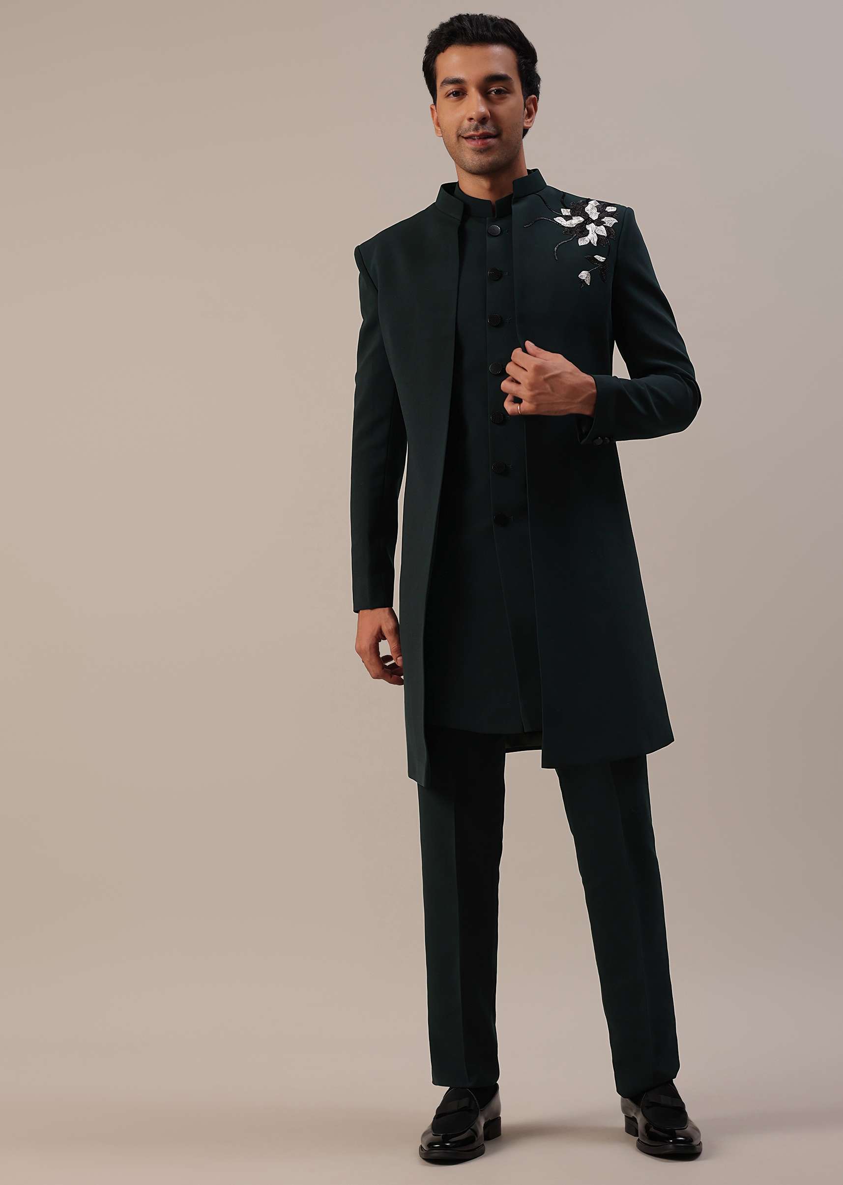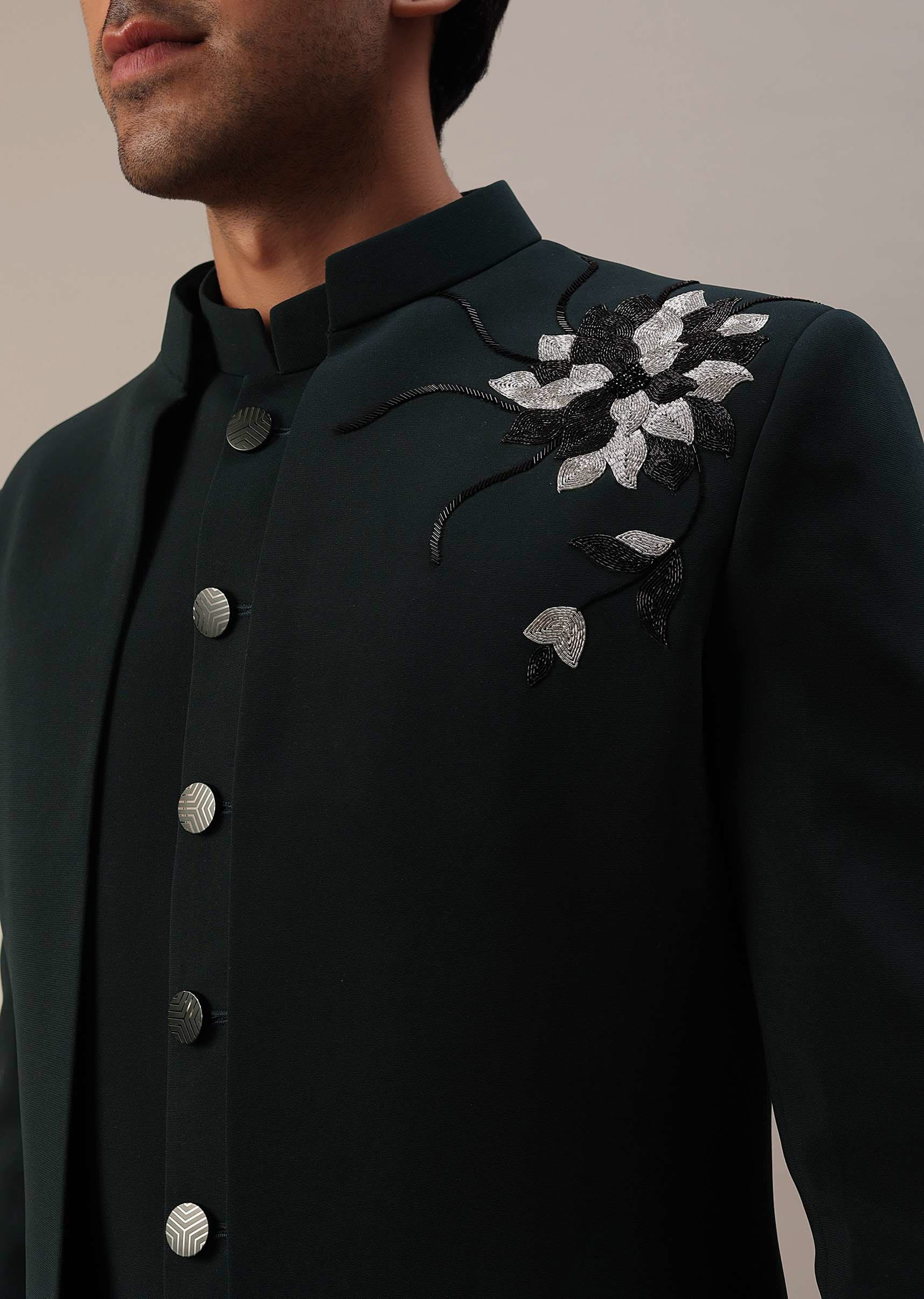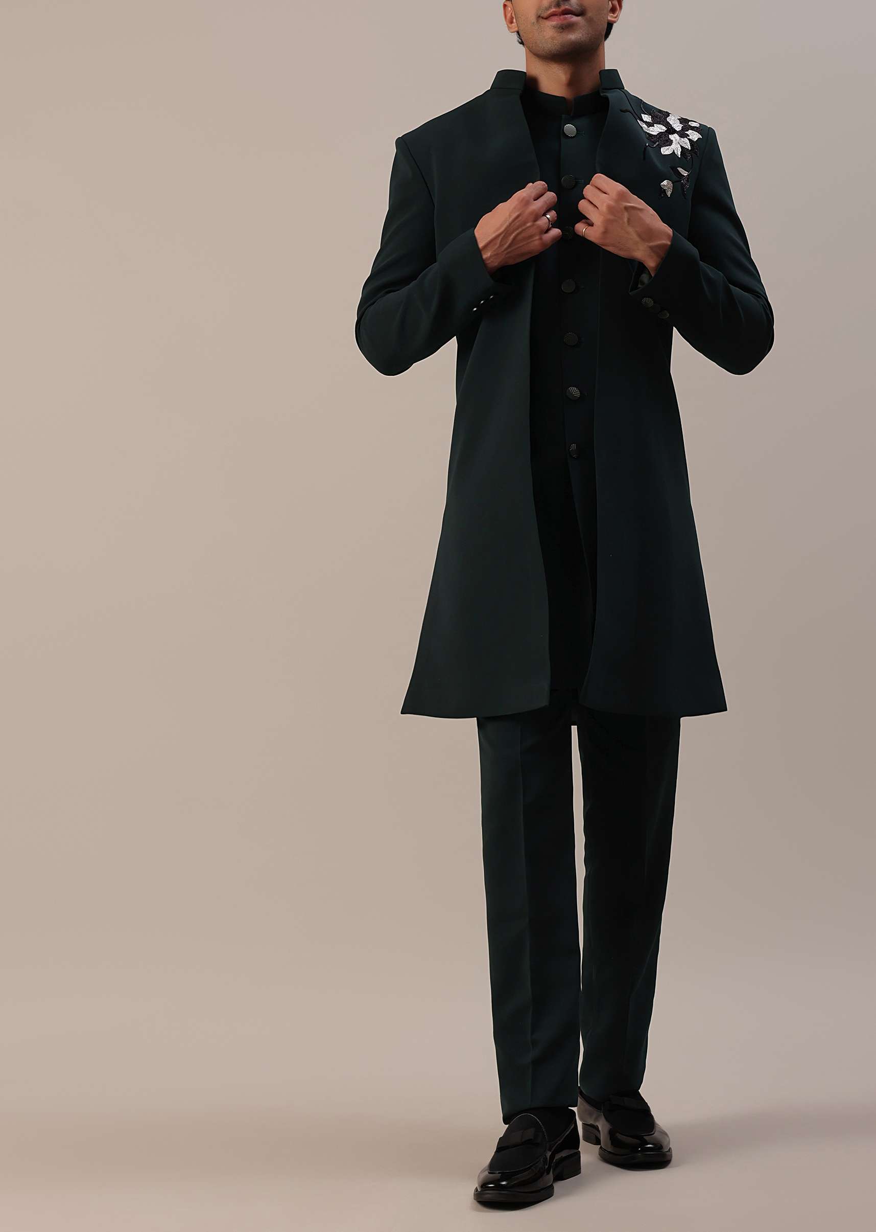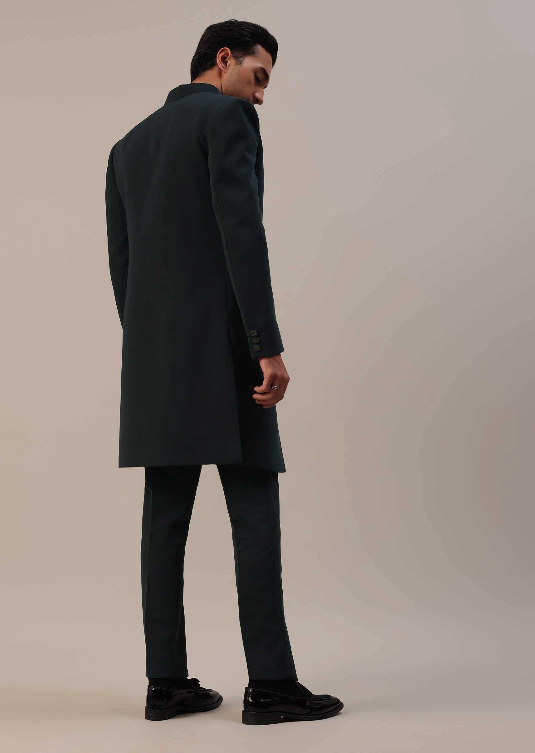 Bottle Green Embroidered Indowestern In Suiting Fabric