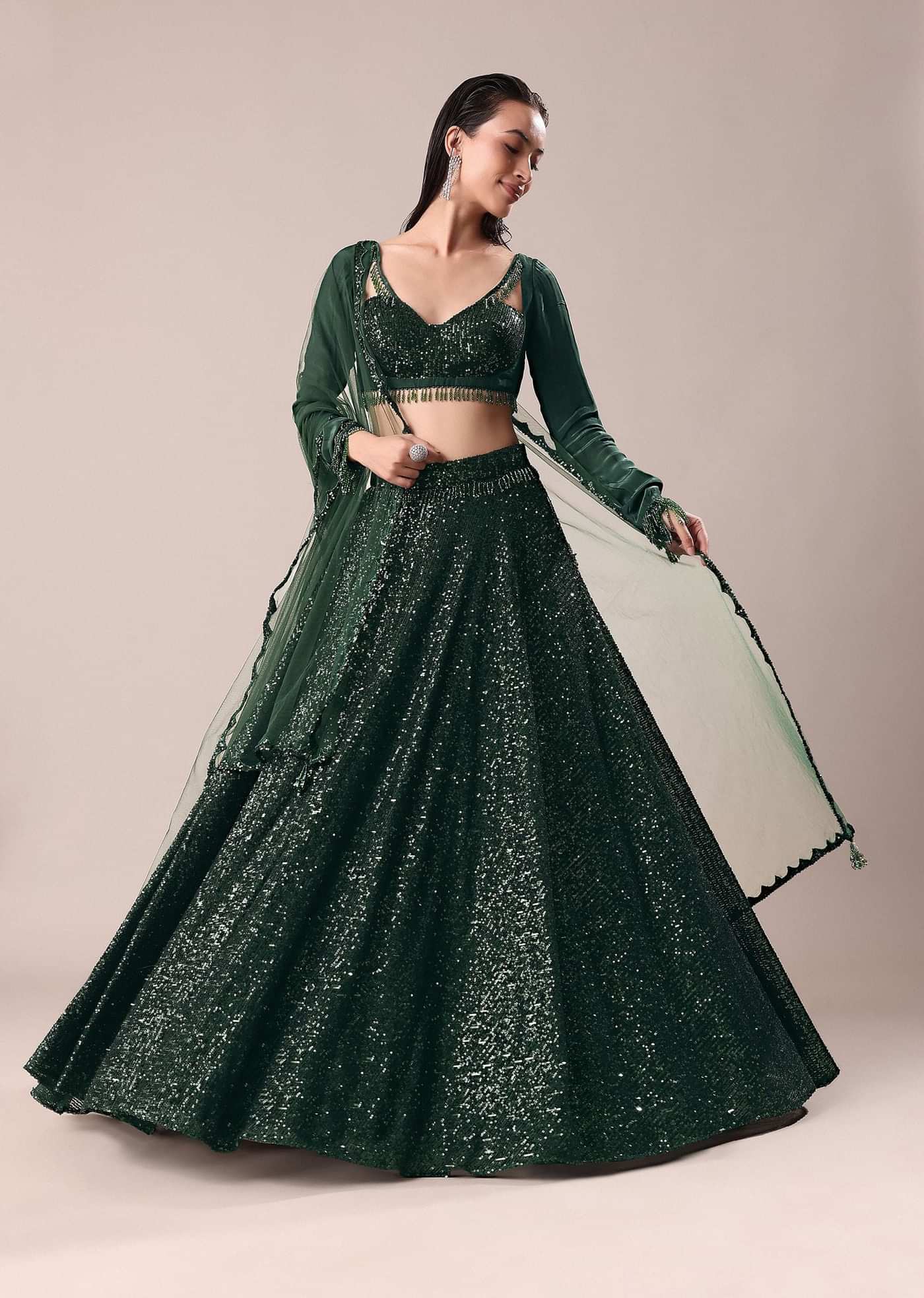 Discover the enchantment of our bottle green lehenga and blouse set, perfect for mehendi and sangeet events. The fancy sequin blouse and the lehenga are crafted from crepe and net... More Product Details