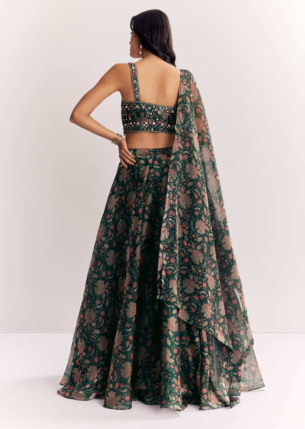 Bottle Green Mirror Work Lehenga Choli Set In Organza Tissue