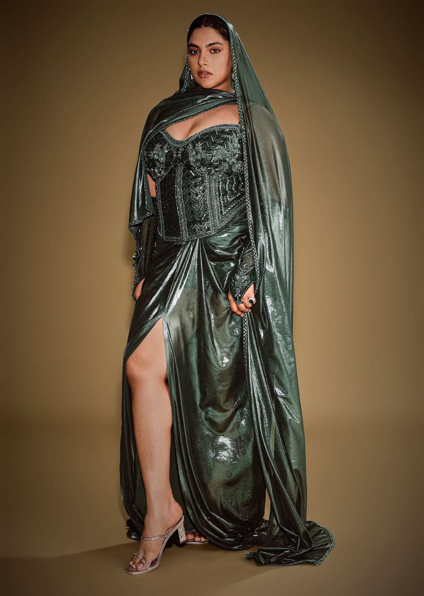Bottle Green Shimmer Drape Skirt With Embroidered Corset And Dupatta