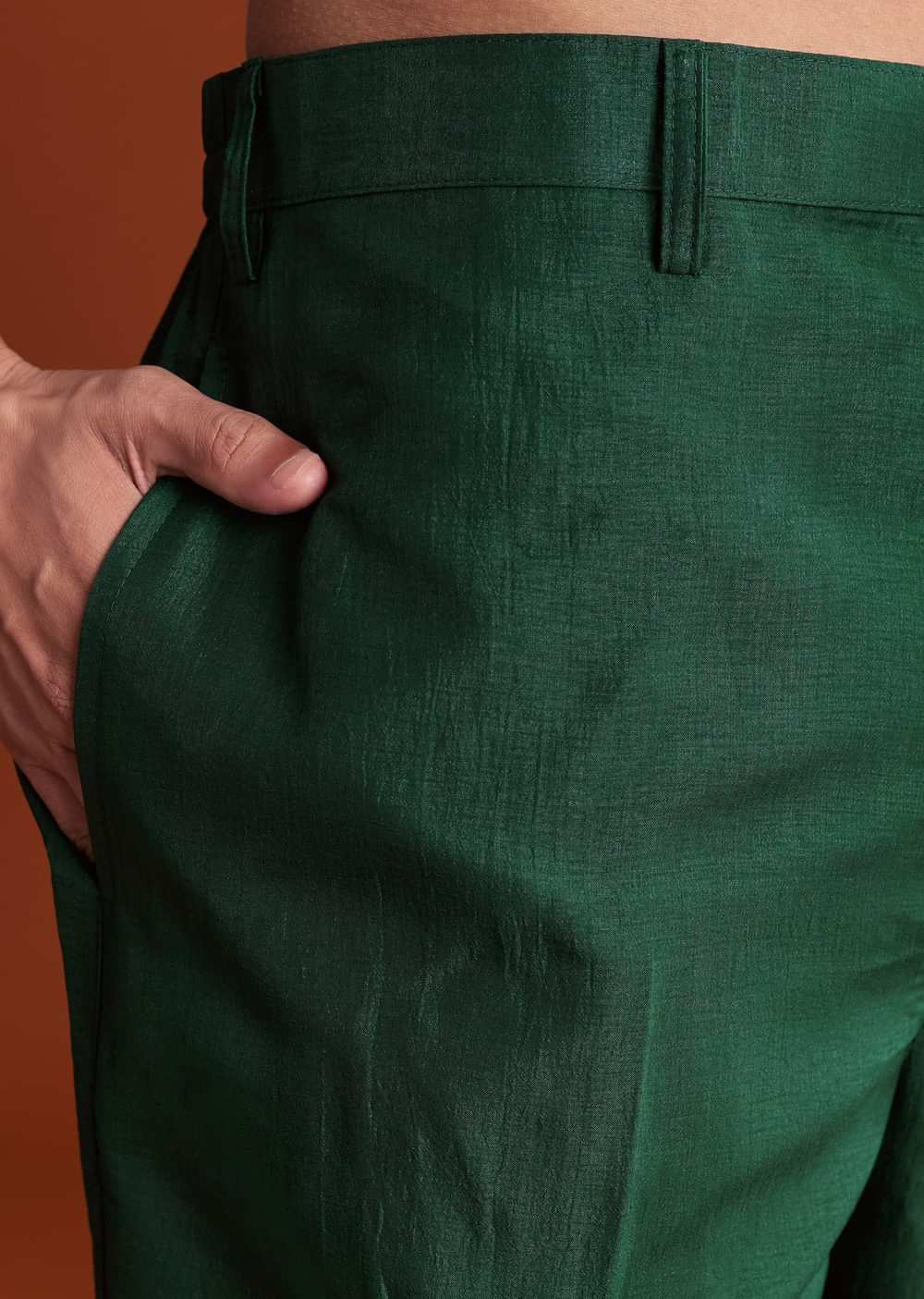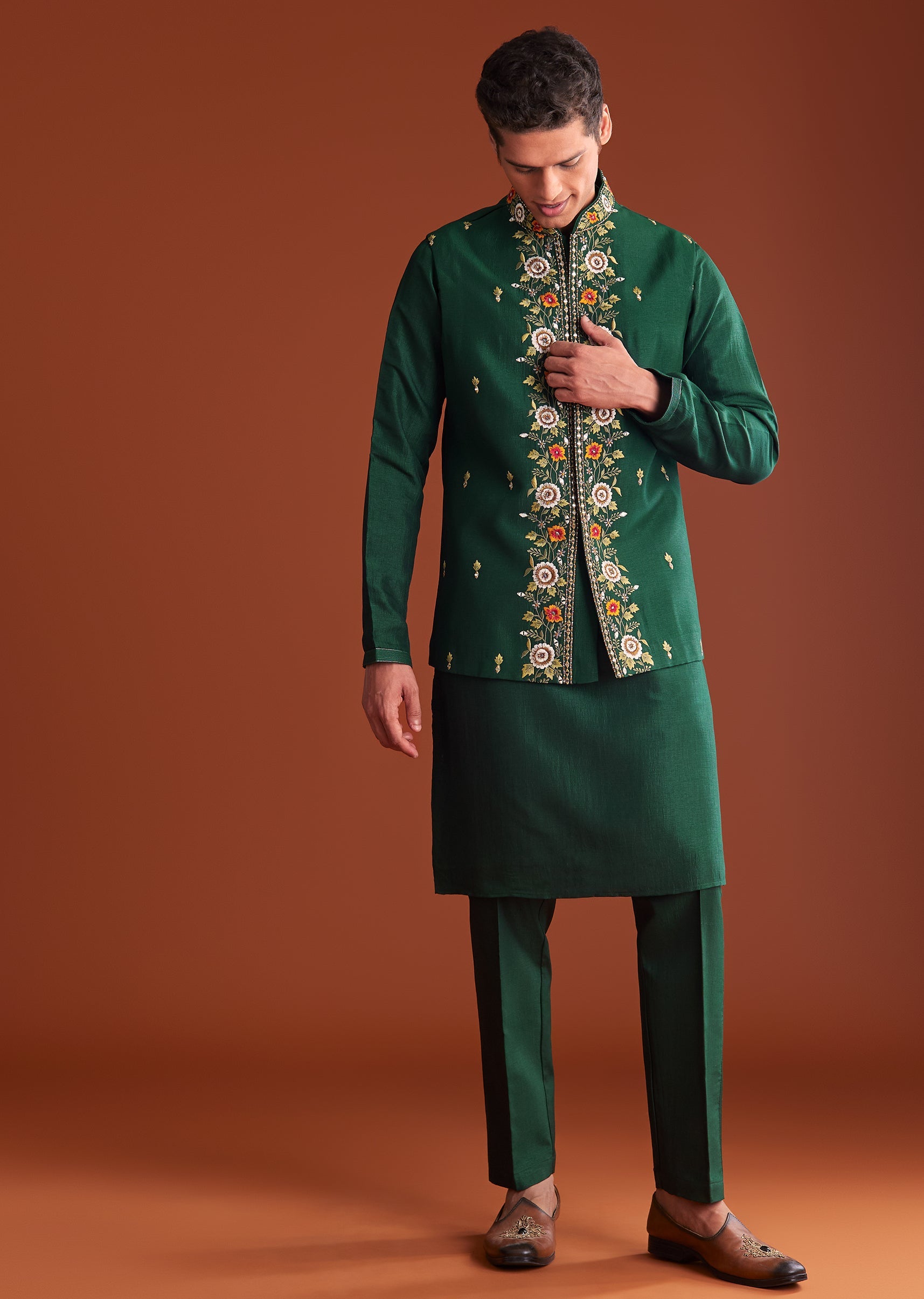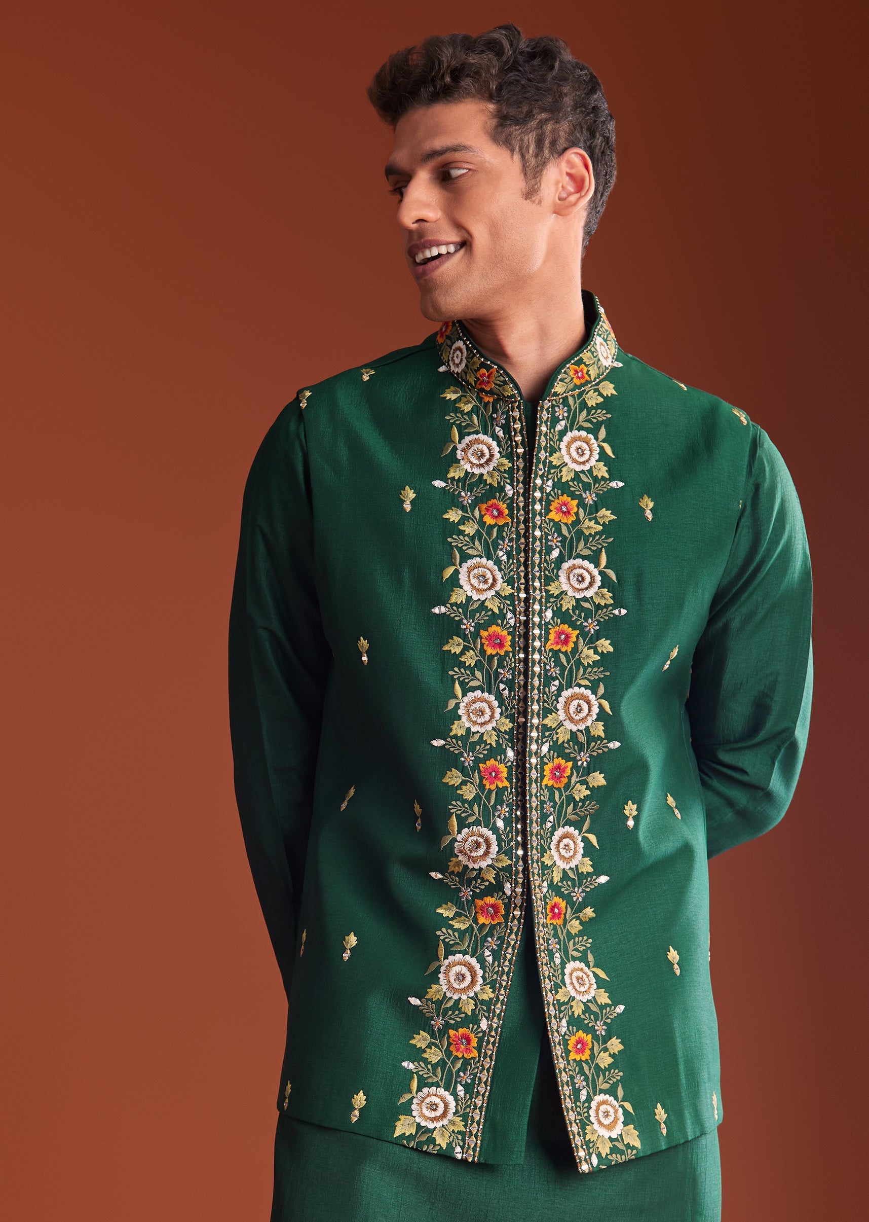 Bottle Green Silk Kurta Jacket Set With Multi Thread And Mirror Work