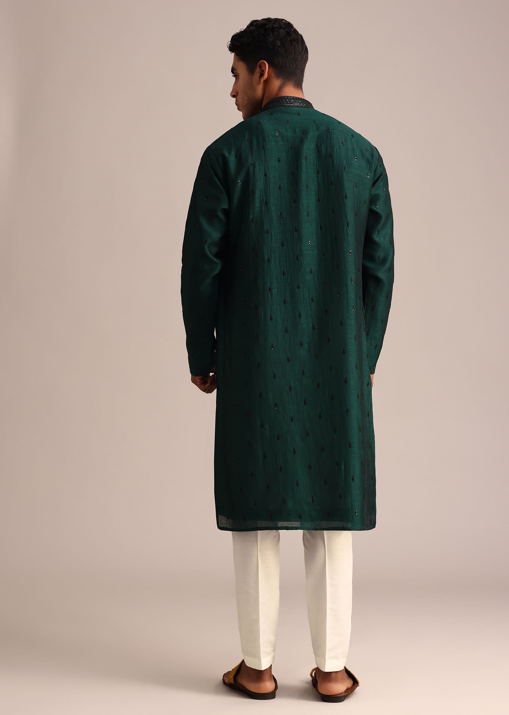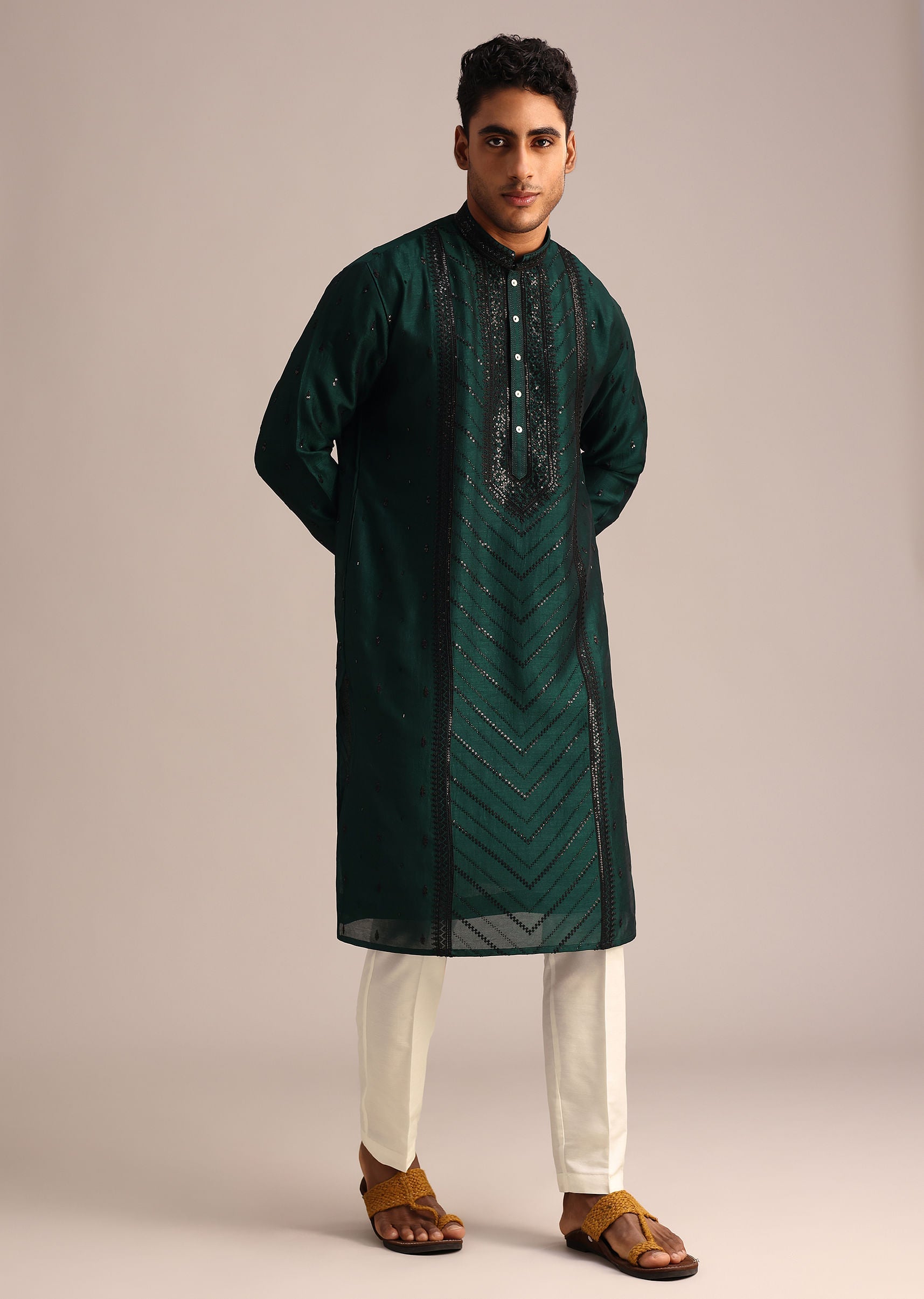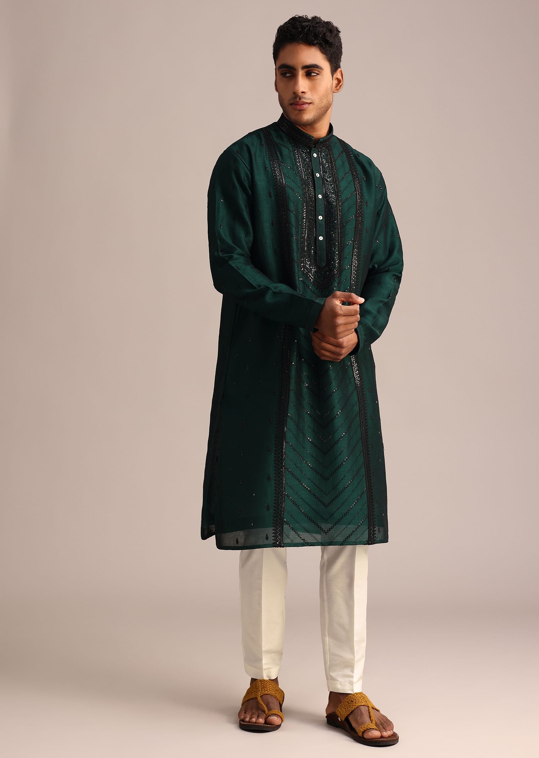 Showcasing fine artistry and finesse, this men's bottle green silk kurta and pant set that comes constructed of opulent silk. The kurta boasts of beautiful sequin embroidery, a mandarin collar, long sleeves, and front hook eye placket for a refined look. Offering comfort and style, this silhouette is ideal for family get-togethers, and festive celebrations. Awarded as the Most Trusted Brand, we're delivering styles you love, just as promised.