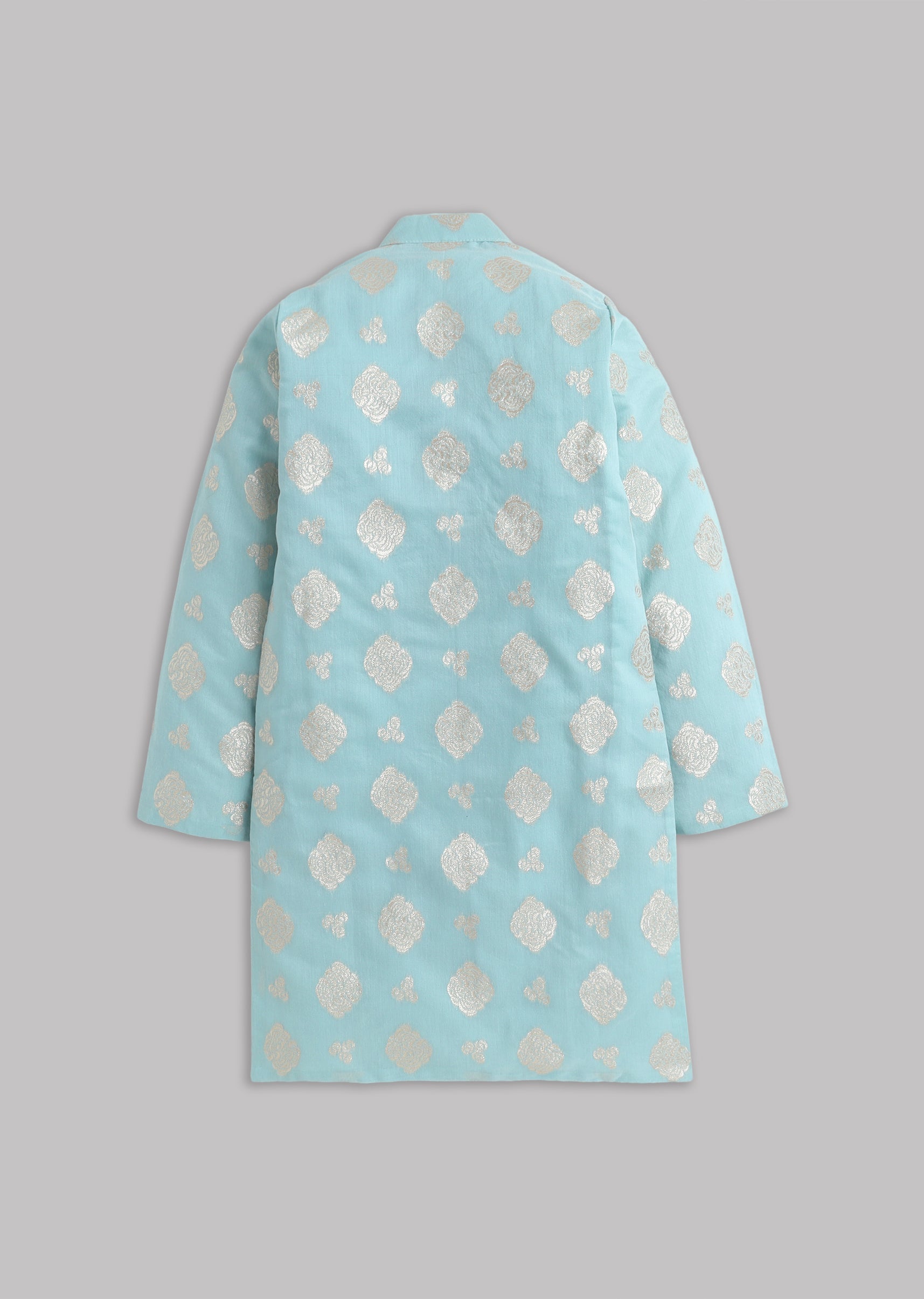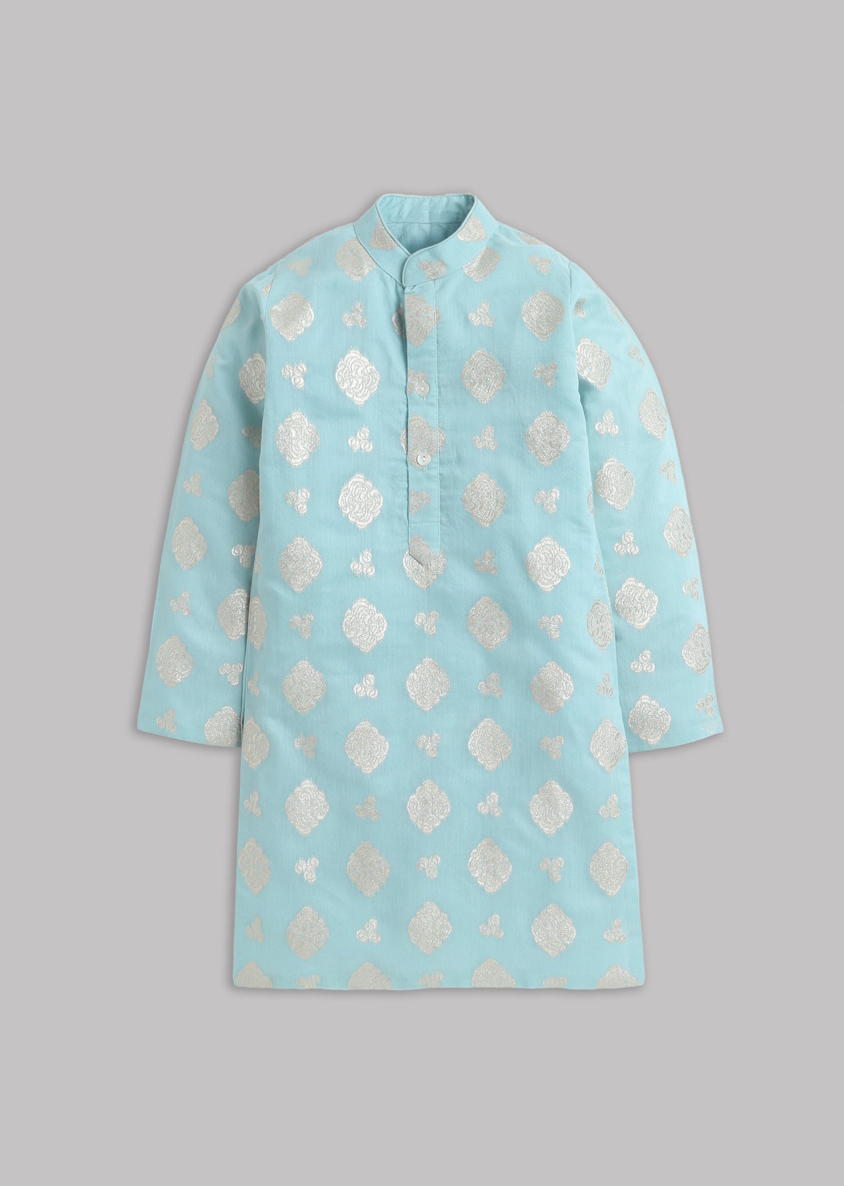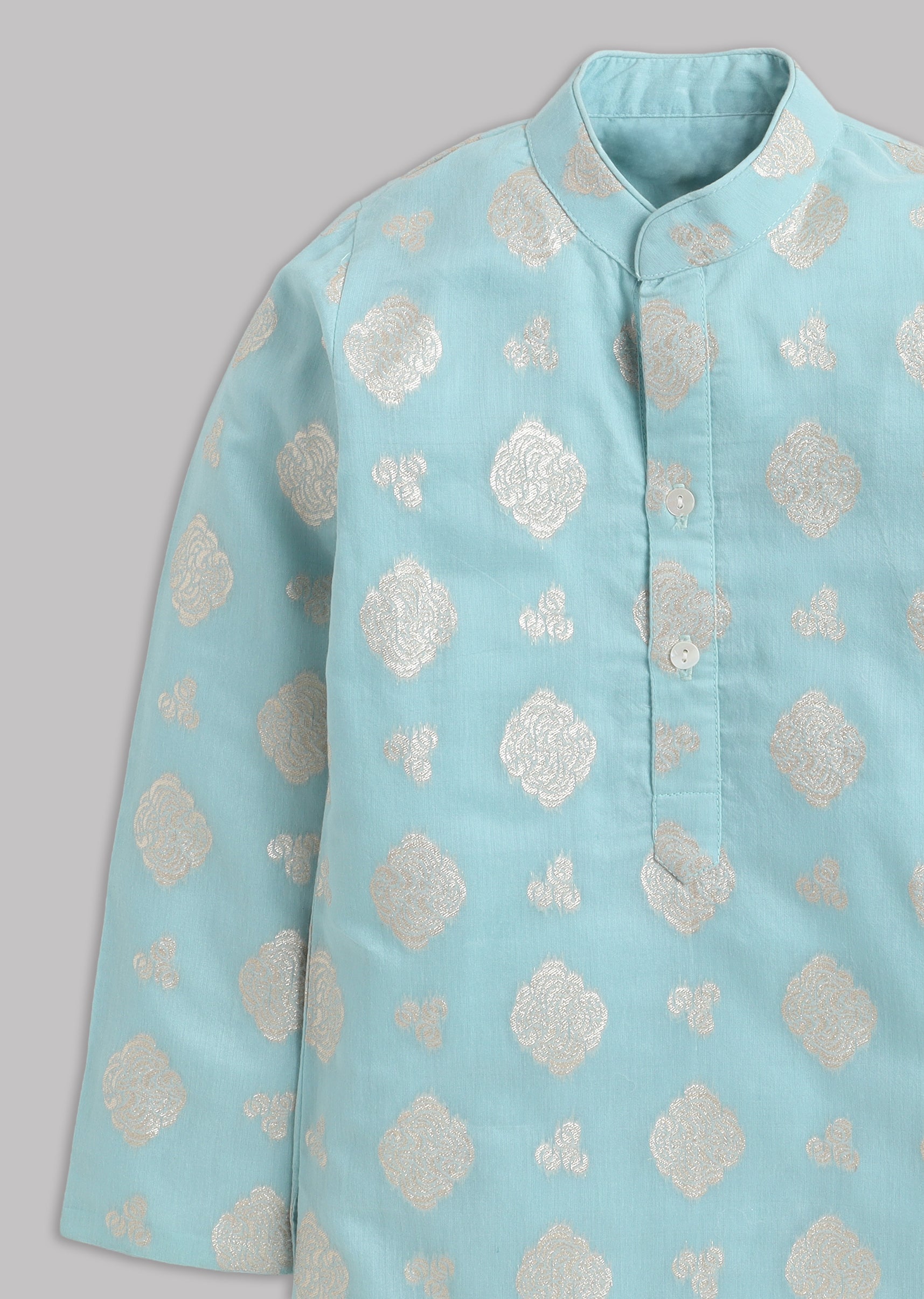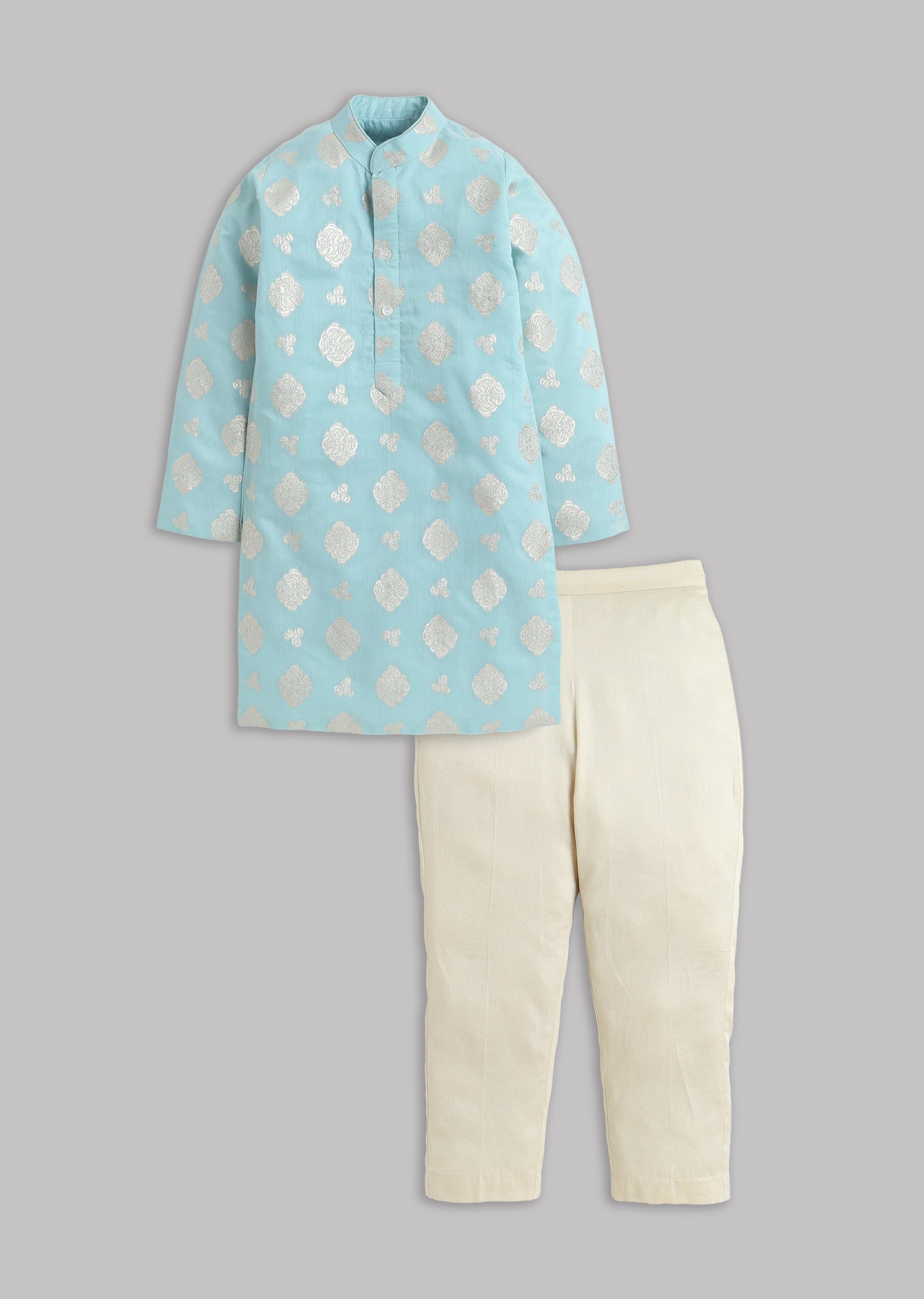 This boys’ kurta set features an aqua blue brocade kurta with cotton lining for comfort. Finished with piping on the collar and shell buttons, it is paired with a beige... More Product Details