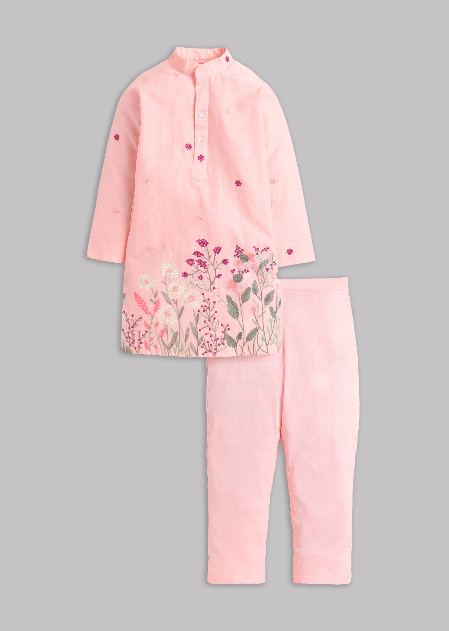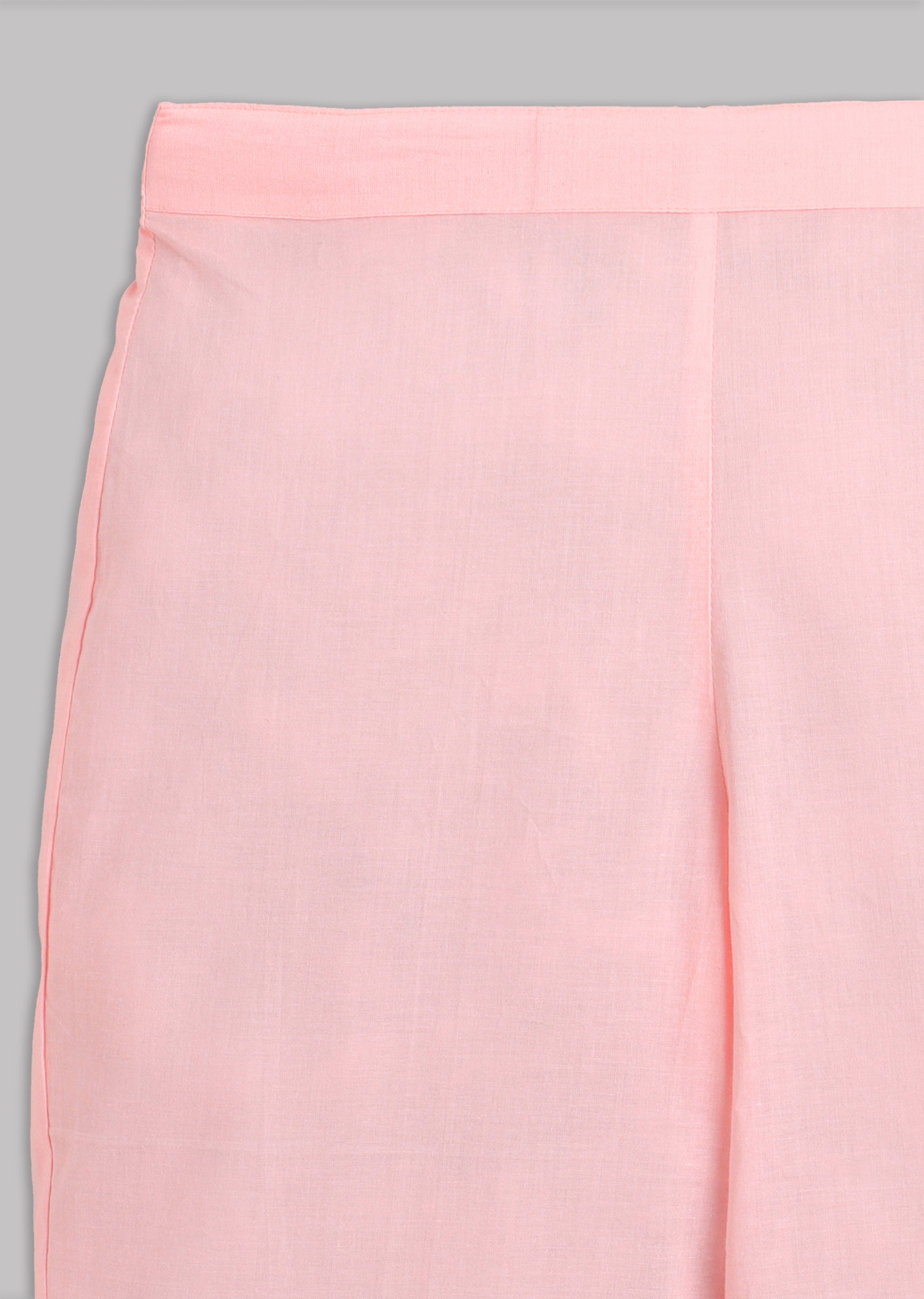 This peach kurta set features subtle embroidery and shell button detailing, paired with matching peach pants. Crafted in cotton with lining in the kurta, this set offers a clean, elegant festive look with comfort at its core. Awarded as the Most Trusted Brand, we're delivering styles you love, just as promised.