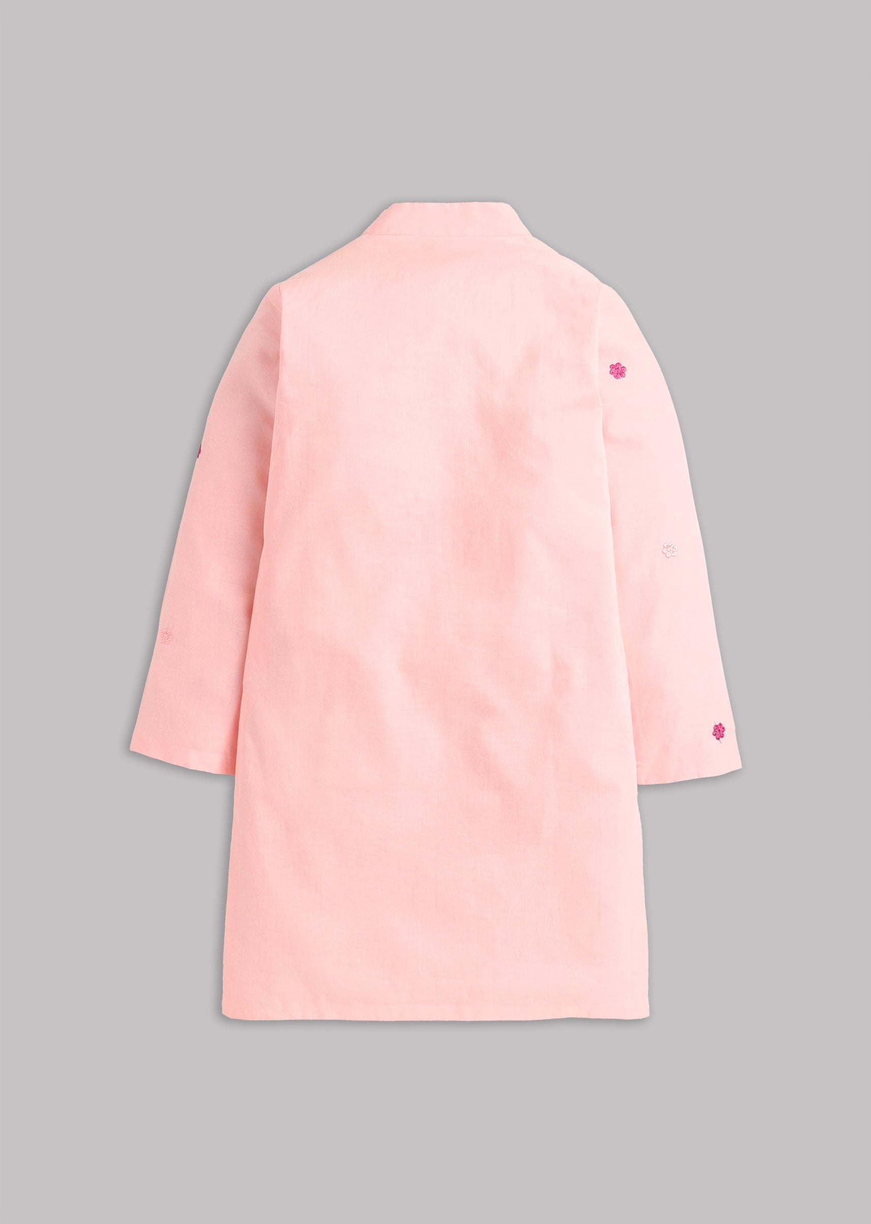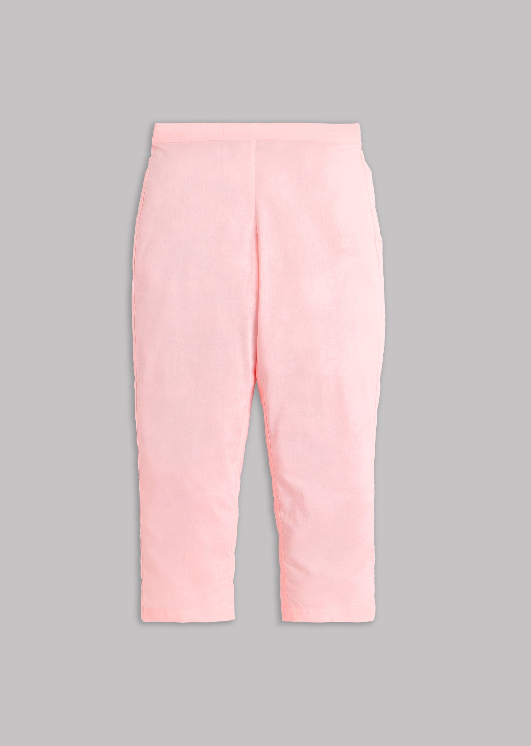 This peach kurta set features subtle embroidery and shell button detailing, paired with matching peach pants. Crafted in cotton with lining in the kurta, this set offers a clean, elegant... More Product Details