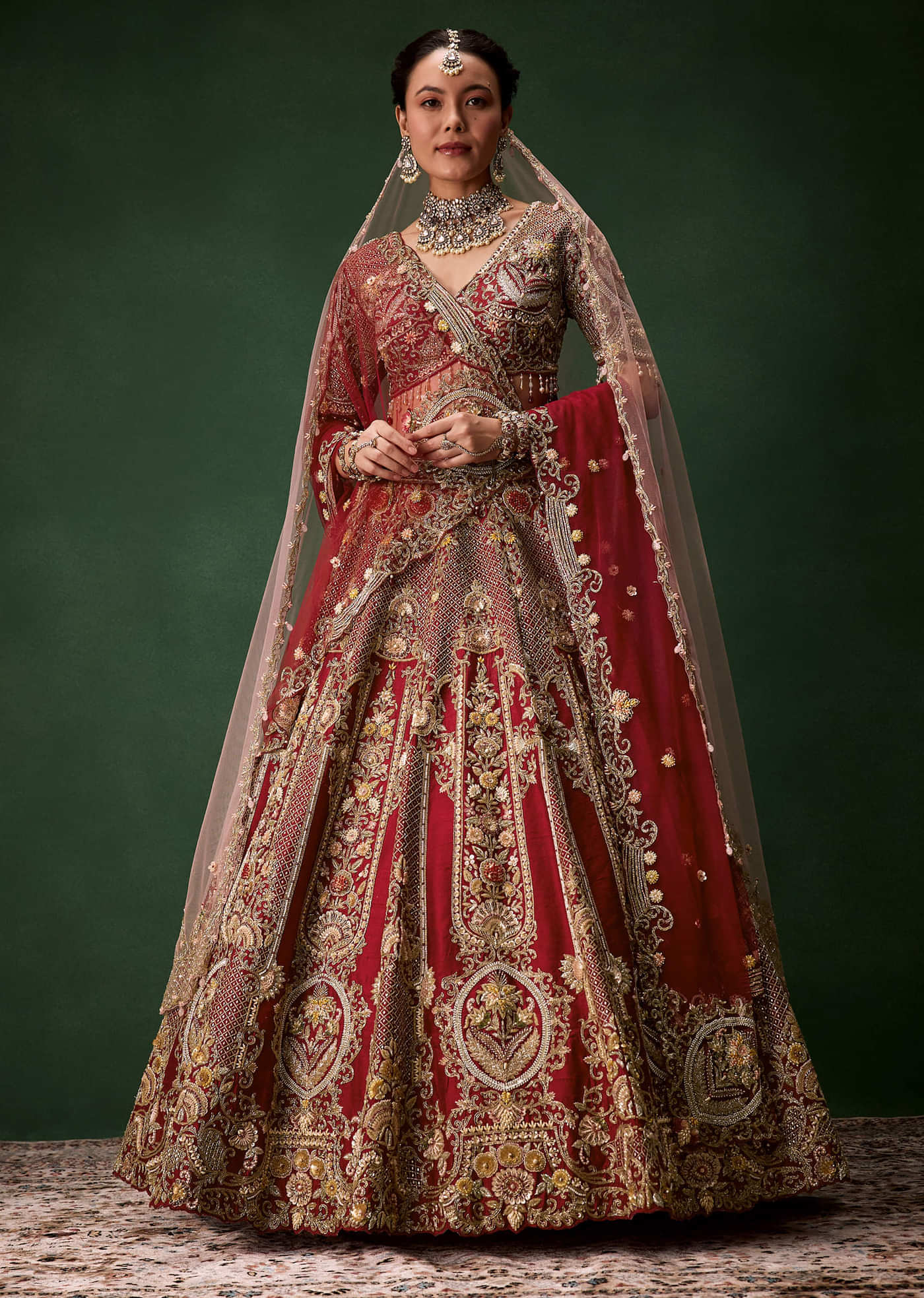Designed for the discerning bride who values tradition elevated with contemporary finesse, this bridal lehenga set is a celebration of artful craftsmanship. The richly adorned lush base glimmers with intricate... More Product Details