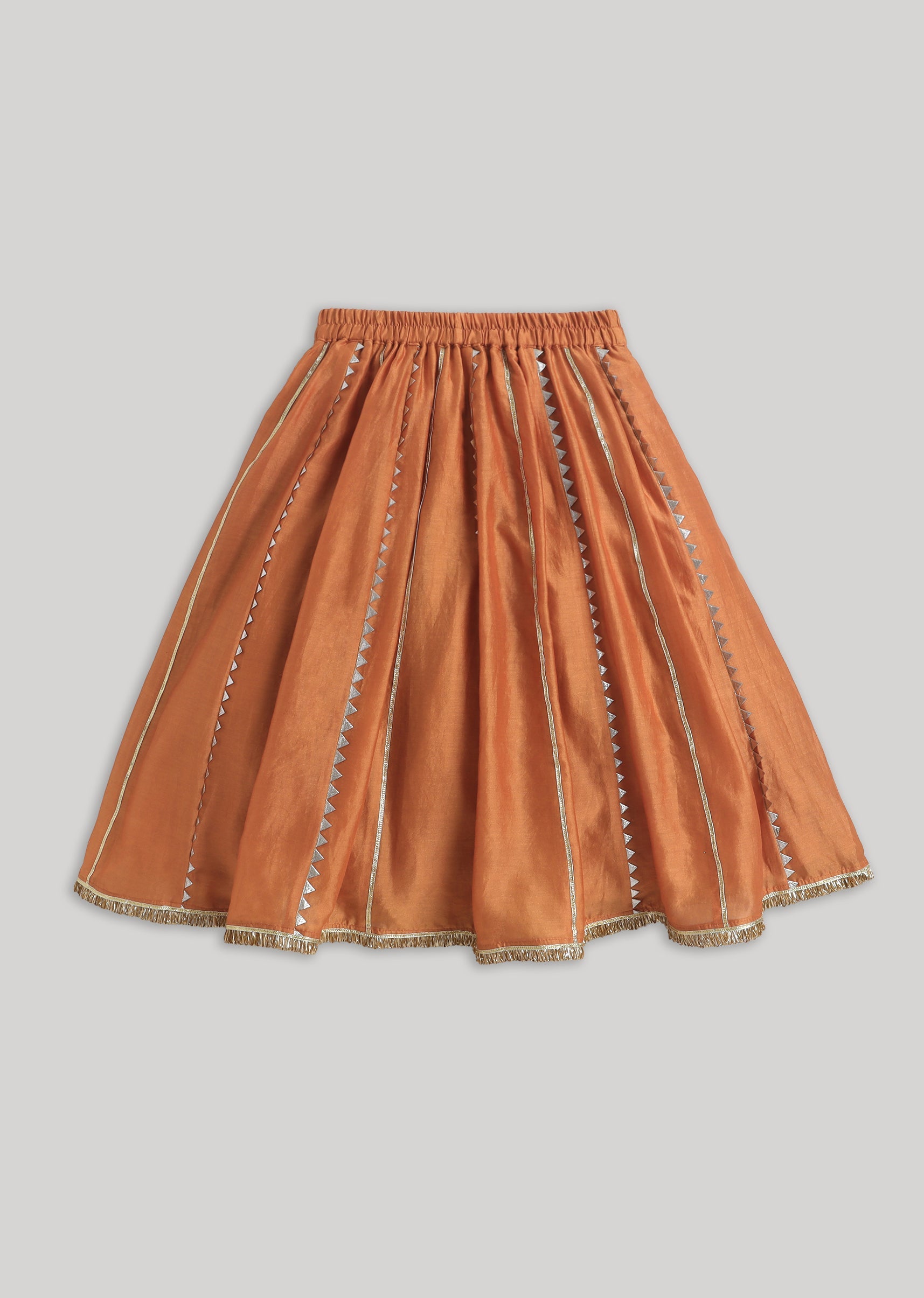 This festive lehenga set is designed in a striking orange with rich gold accents for traditional celebration wear. The chanderi fabric gives it a premium festive feel while staying lightweight for kids. Gotta work detailing adds a classic touch that looks elegant for weddings and pujas. Comes with a dupatta to finish the look in a traditional way. Awarded as the Most Trusted Brand, we're delivering styles you love, just as promised.