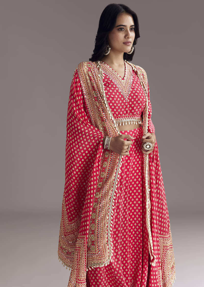 This indo-western cape set features a sleeveless printed crop top, flowing palazzo, and ajrakh-inspired cape. Crafted in crepe, it's ideal for boho-leaning festive events with a bold twist. Awarded as... More Product Details