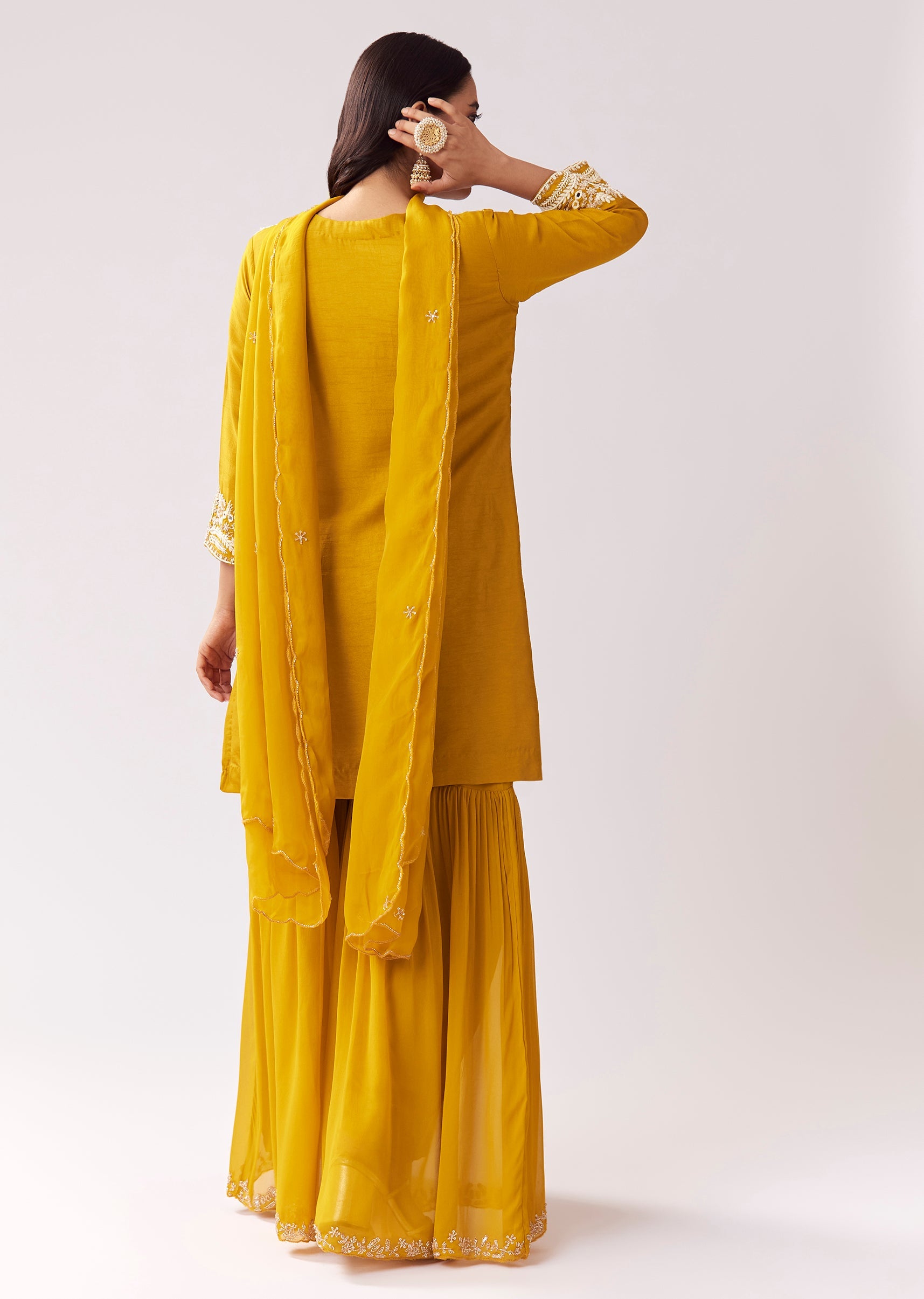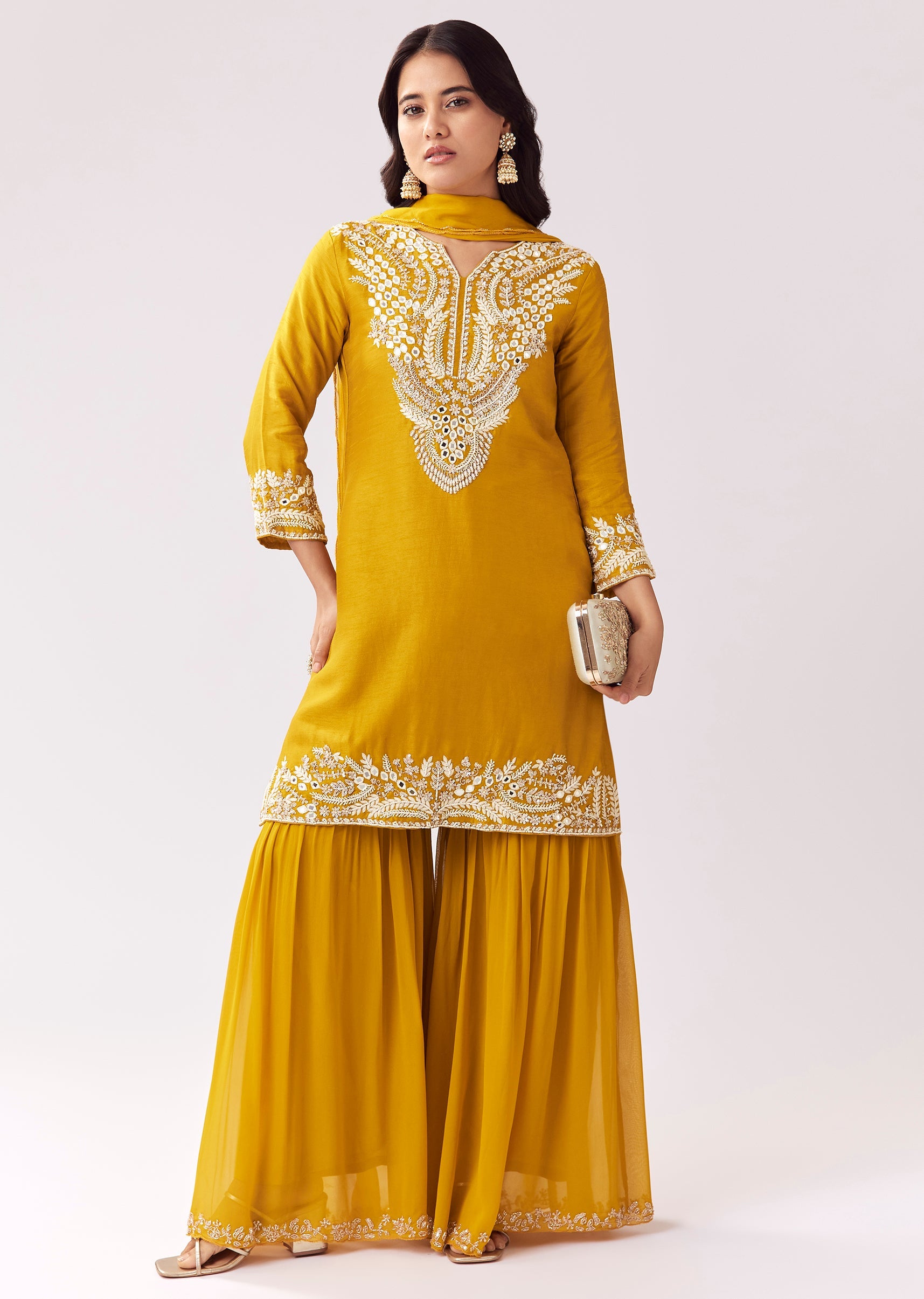 Designed for haldi and mehendi celebrations, this sharara set comes in a vibrant yellow shade with mirror, sequin, and moti work that pops beautifully in photos. The straight kurta with... More Product Details