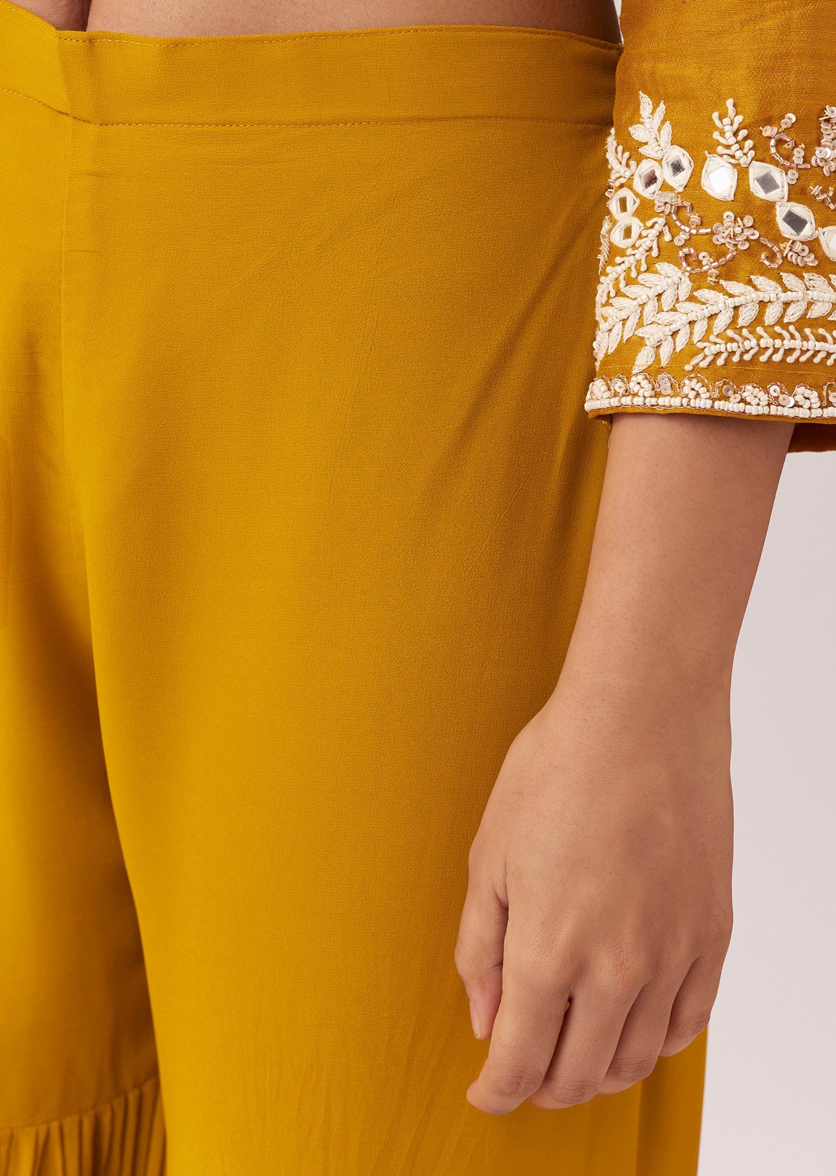 Pair with floral jewellery and comfortable wedges for haldi functions.