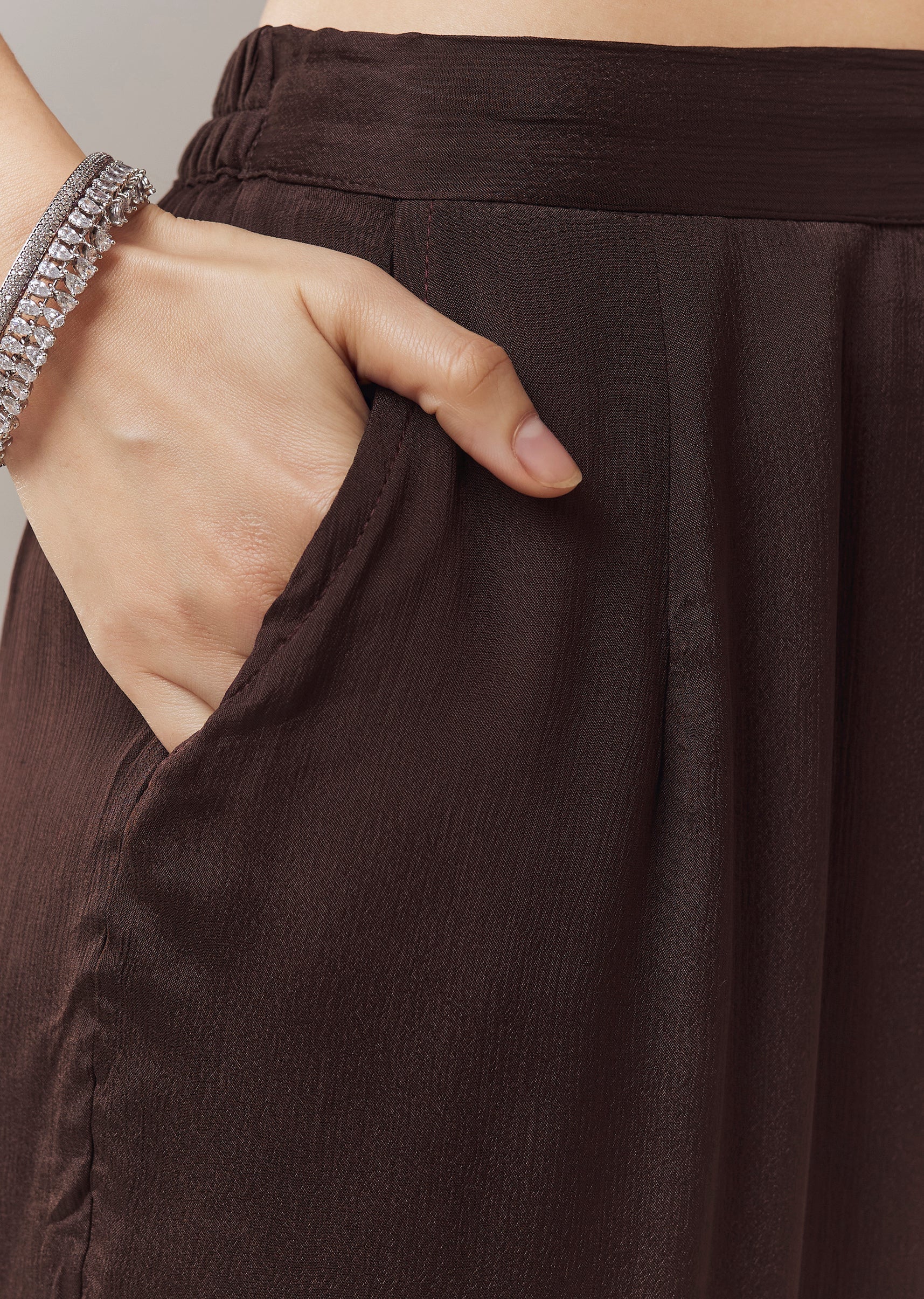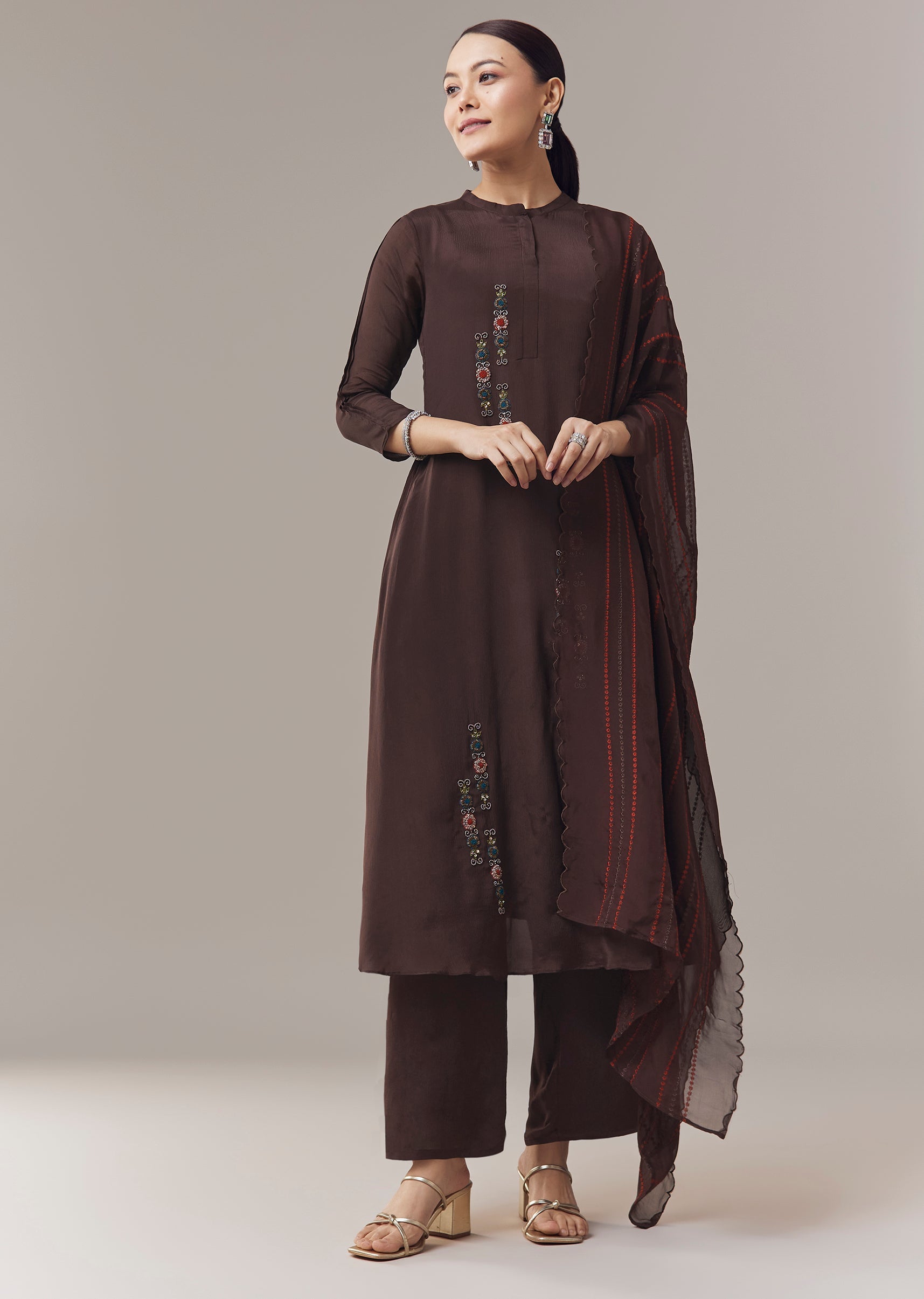 Elegant and casual, this brown anarkali suit is crafted in soft chinon fabric for a lightweight and comfortable feel. The anarkali is adorned with intricate beads, cut dana, and resham... More Product Details