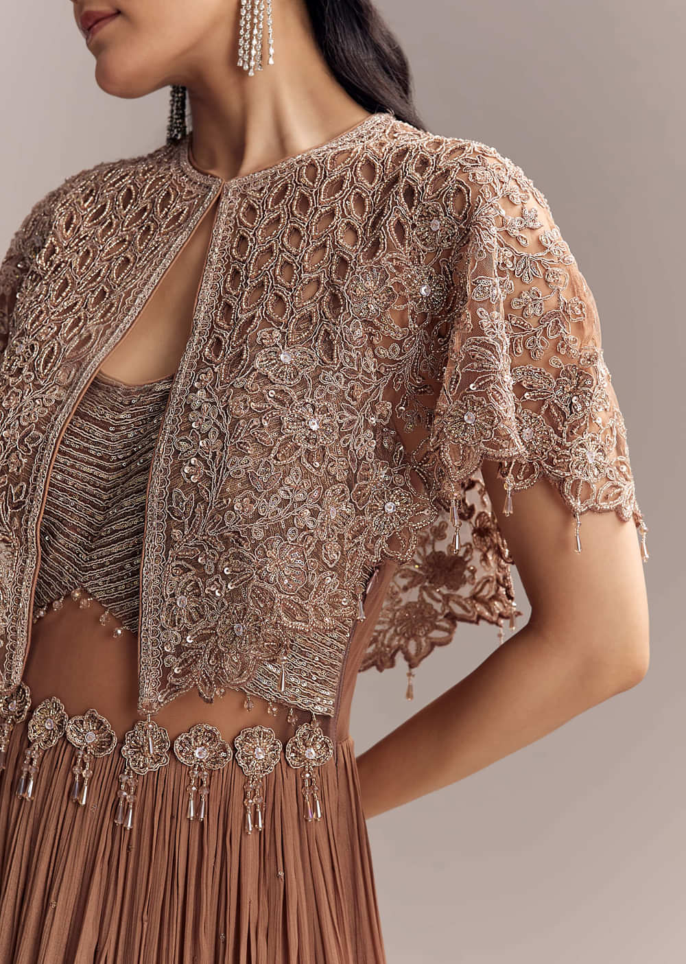 Easy and polished, this brown chinon contemporary gown feels fluid and confidence-boosting with every step. The detachable cape is delicately embroidered to frame the shoulders with soft shimmer. Great for... More Product Details