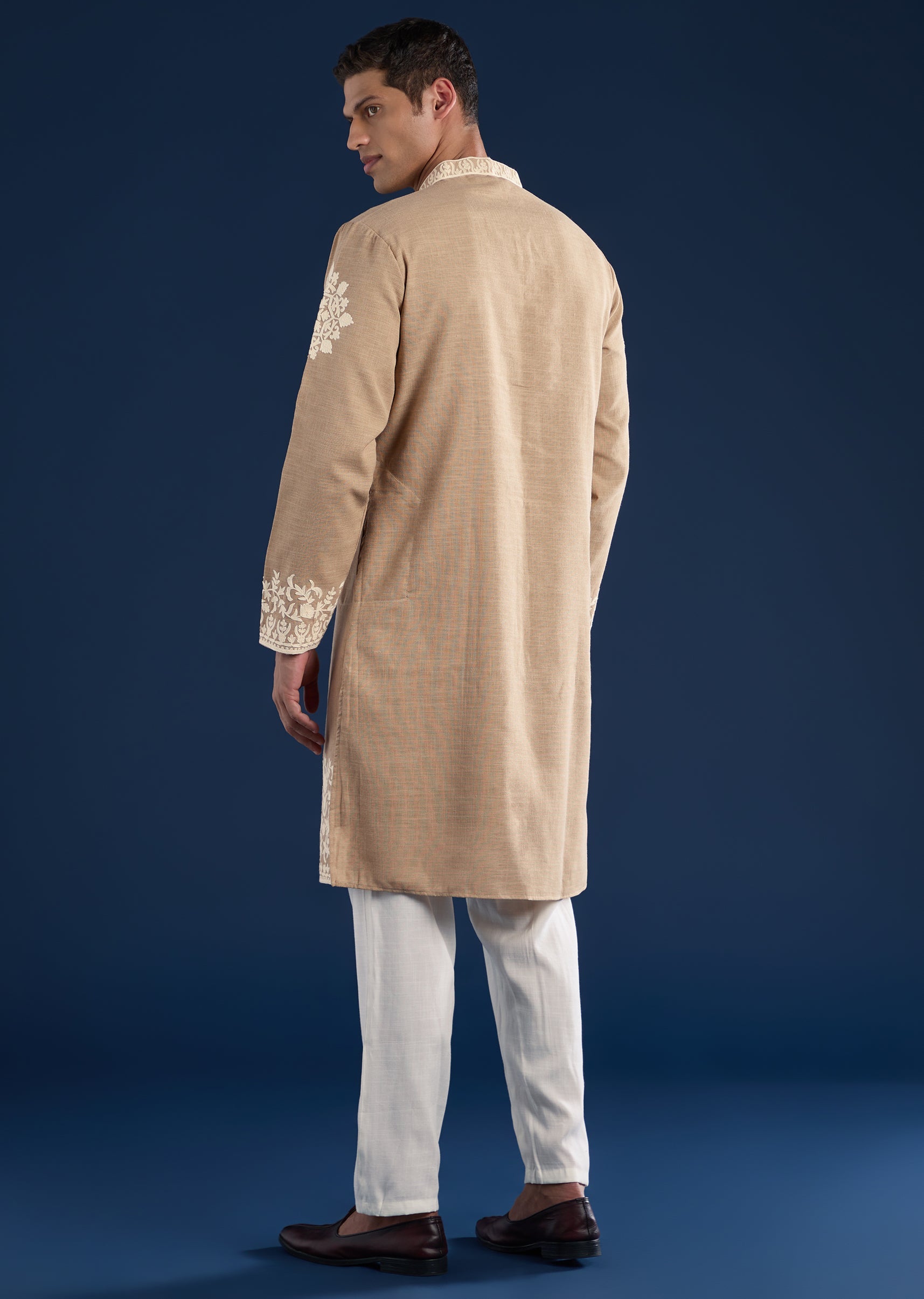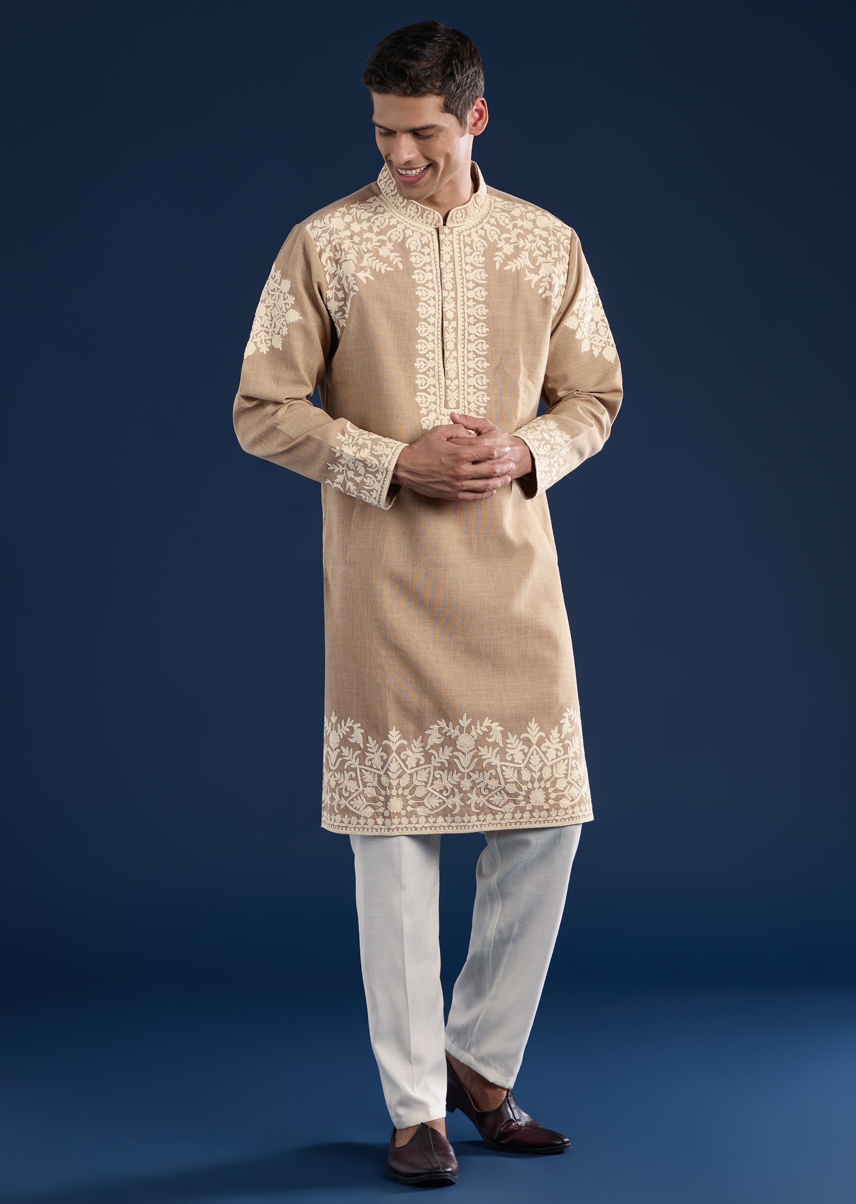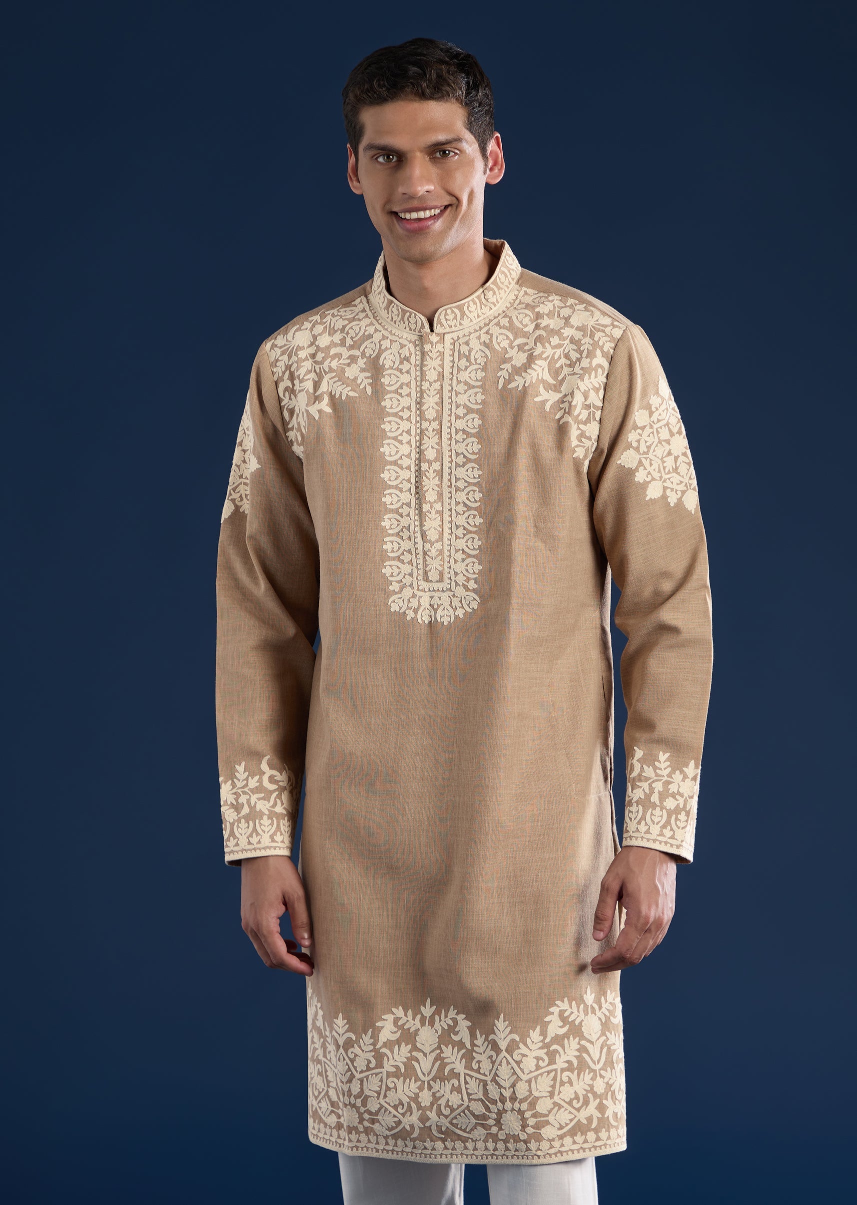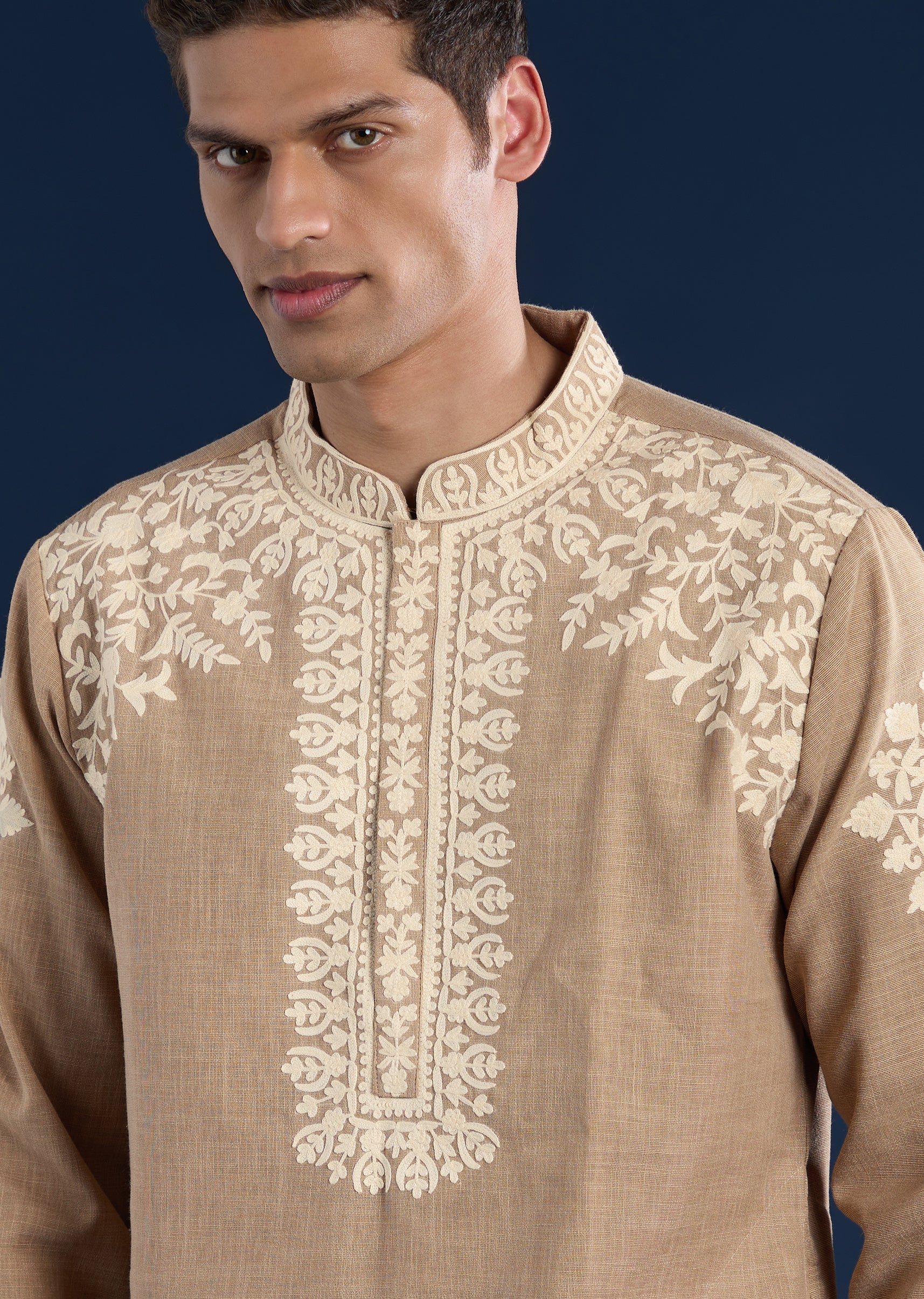 Crafted in breathable viscose, this brown kurta set is designed for pooja and festive occasions with a comfortable, elevated feel. Featuring a mandarin collar, full sleeves, and subtle resham detailing,... More Product Details