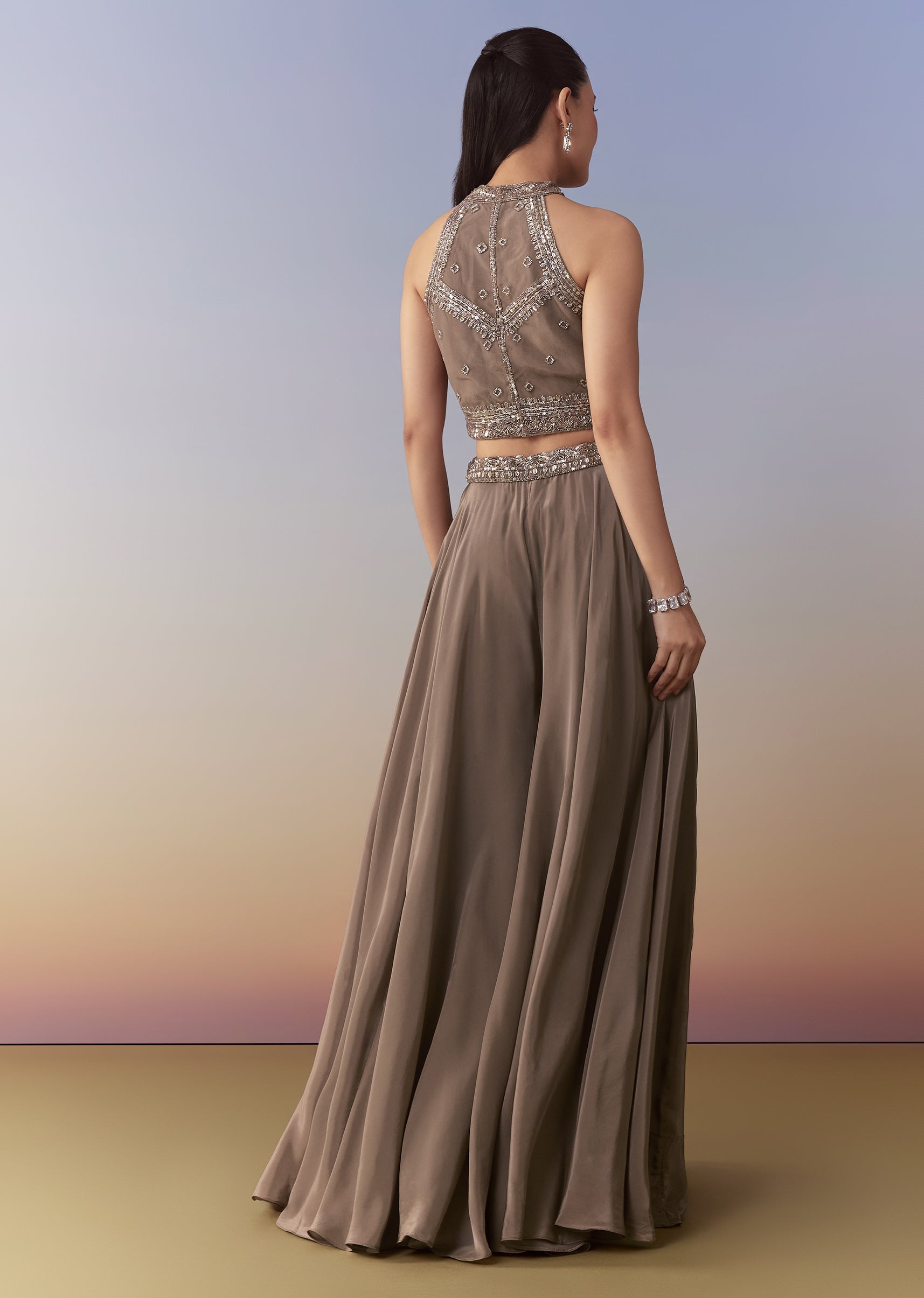 Bring effortless style to your festive wardrobe with this brown palazzo set, featuring a crop top embellished with cutdana and sequin work for a subtle yet striking shimmer. The flowy... More Product Details