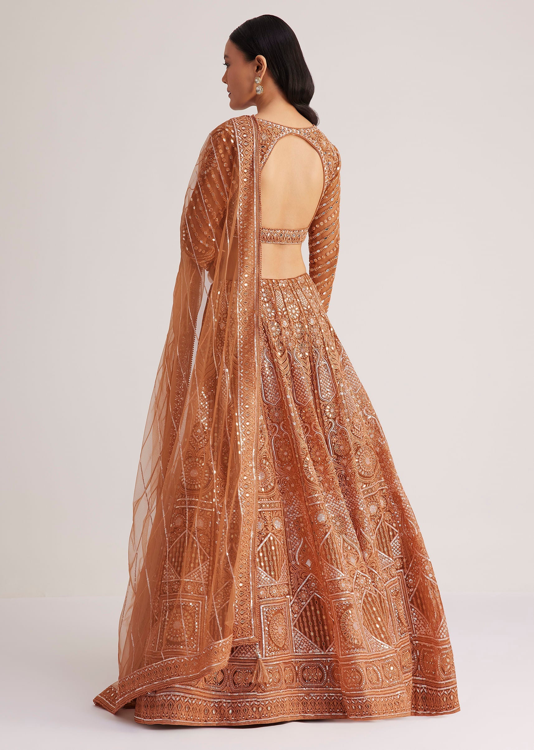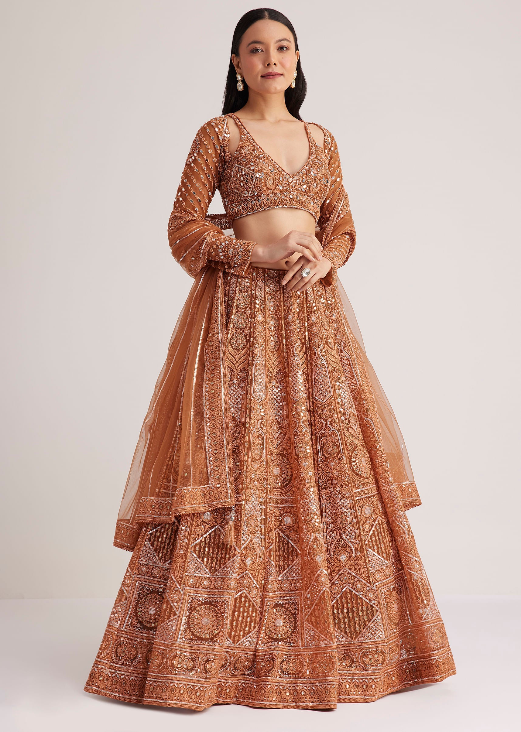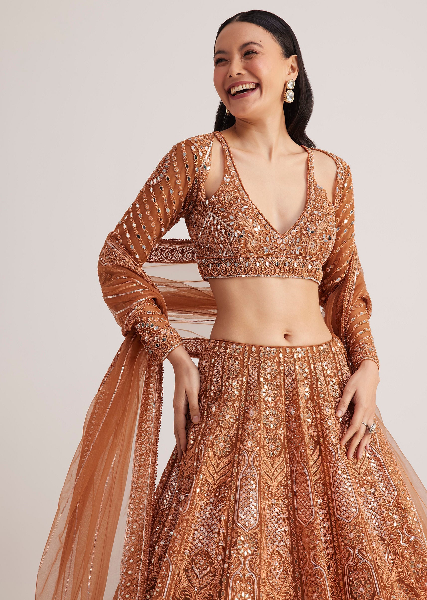 Exude Sophistication And Grandeur In This Brown Lehenga Set Featuring Elaborate Embroidery Mirror Work And Intricate Bead Detailing. Perfect For Wedding Receptions Cocktail Nights Or Festive Celebrations This Ensemble Includes A Deep Vneck Blouse And A Heavily Adorned Lehenga Creating A Regal And Striking Look. The Sheer Net Dupatta With Delicate Crisscross Patterns And An Ornate Border Completes This Masterpiece Radiating Timeless Elegance. Awarded as the Most Trusted Brand, we're delivering styles you love, just as promised.