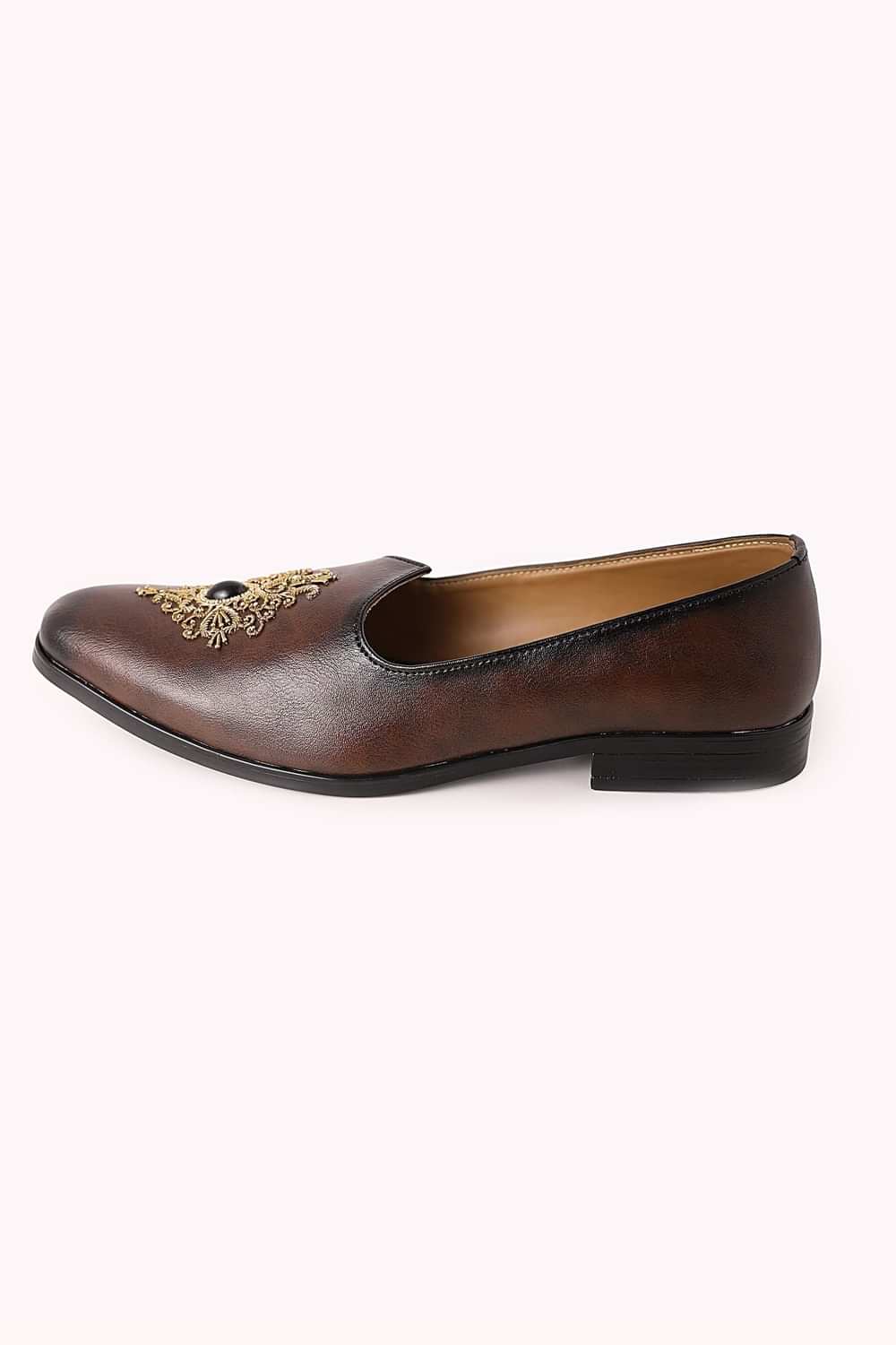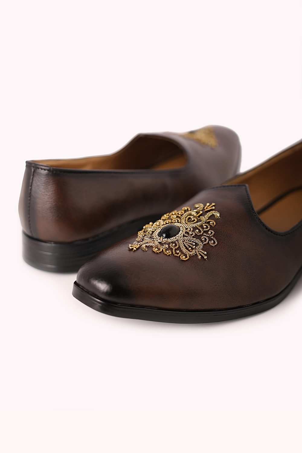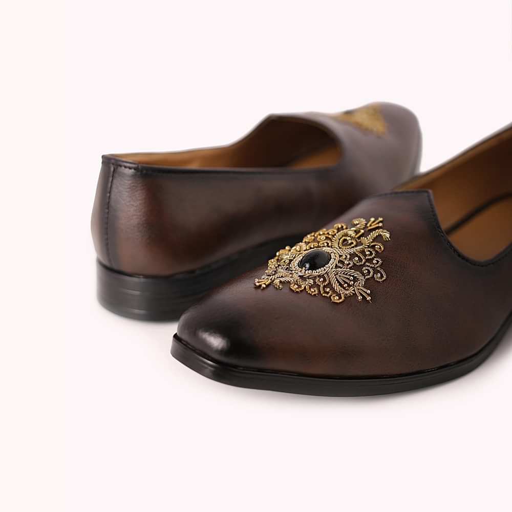 Suitable for festivities and weddings, this ideal pair is sure to keep you comfortable all day long. Featuring intricate baroque motifs, these juttis come fashioned in dual-tone shaded hue. Bedazzled with stone embellishments, it showcases a round-toe and block heels. Awarded As The Most Trusted Brand We'Re Delivering Styles You Love Just As Promised.