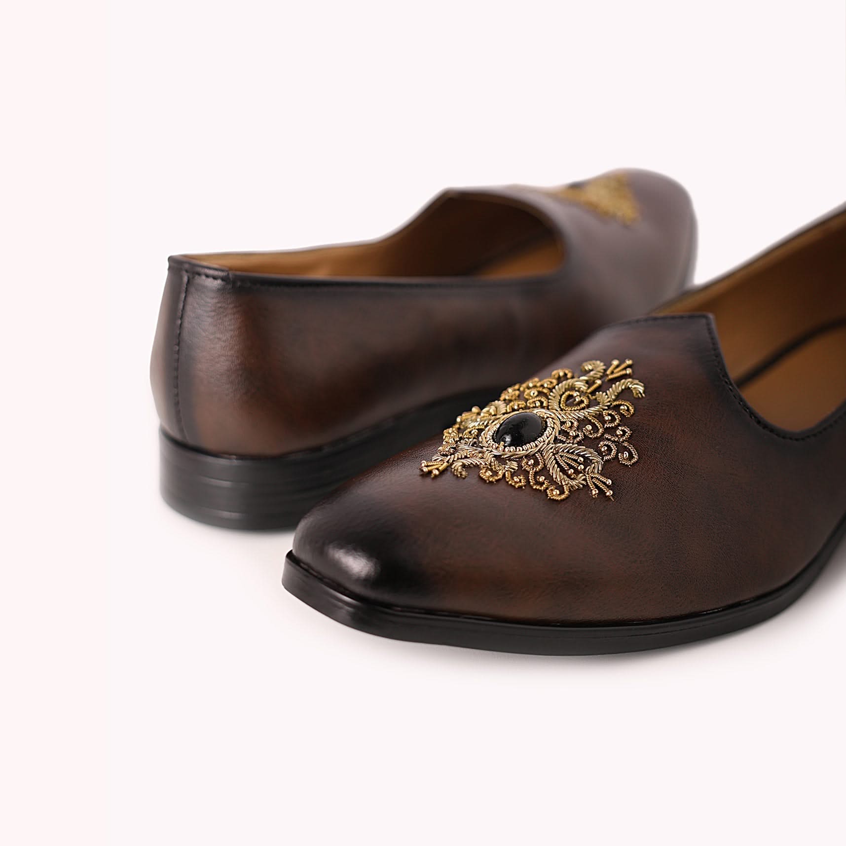Suitable for festivities and weddings, this ideal pair is sure to keep you comfortable all day long. Featuring intricate baroque motifs, these juttis come fashioned in dual-tone shaded hue. Bedazzled... More Product Details