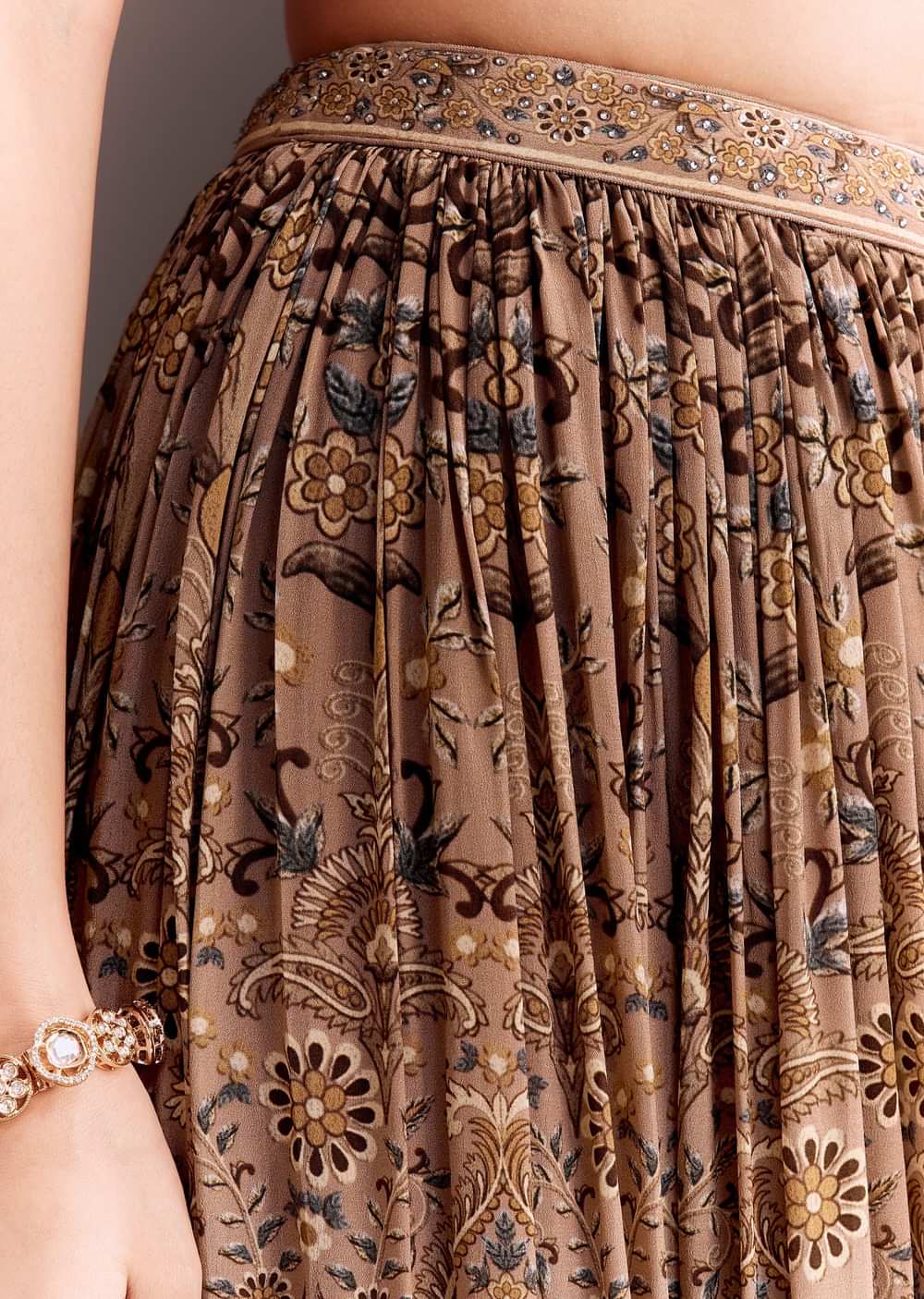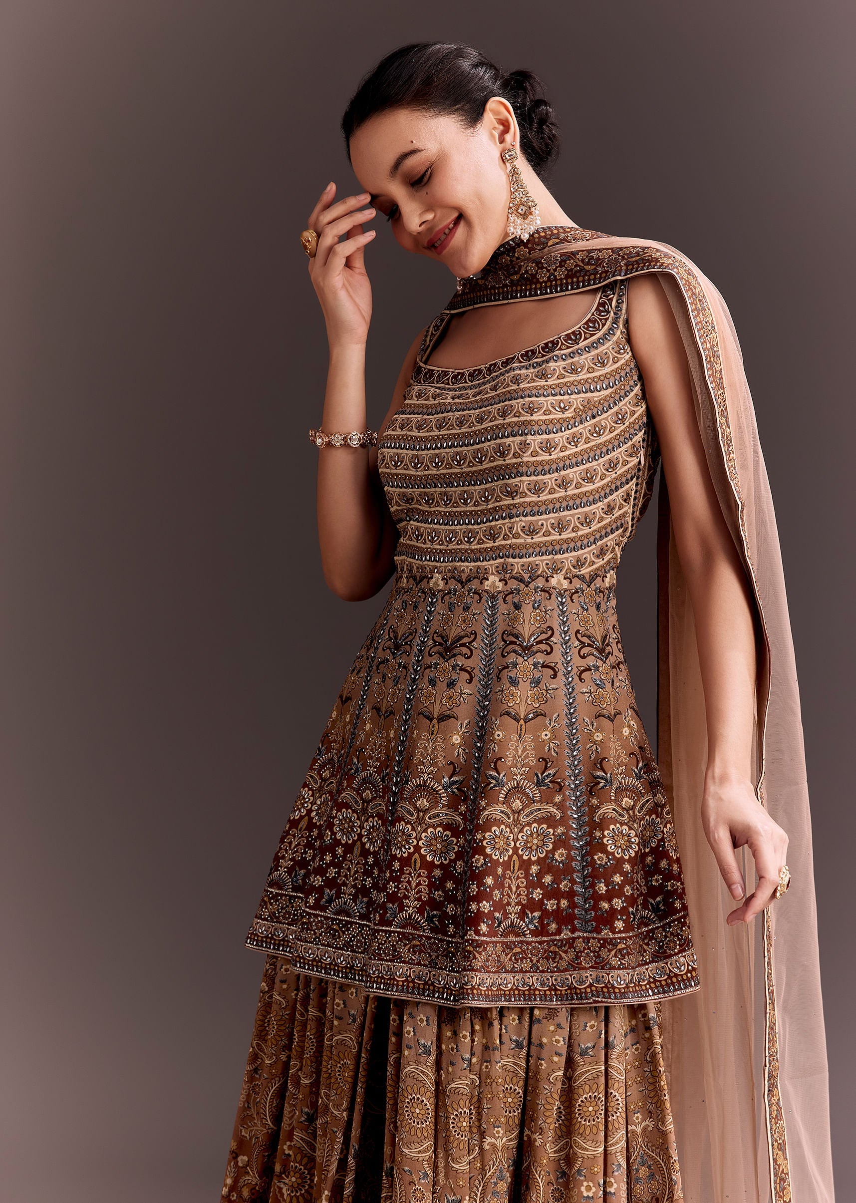 This brown ombre palazzo set showcases meticulous embroidery with stone and sequins, creating an exquisite ethnic outfit. The peplum style kurta is designed with intricate horizontal and vertical patterns, paired... More Product Details