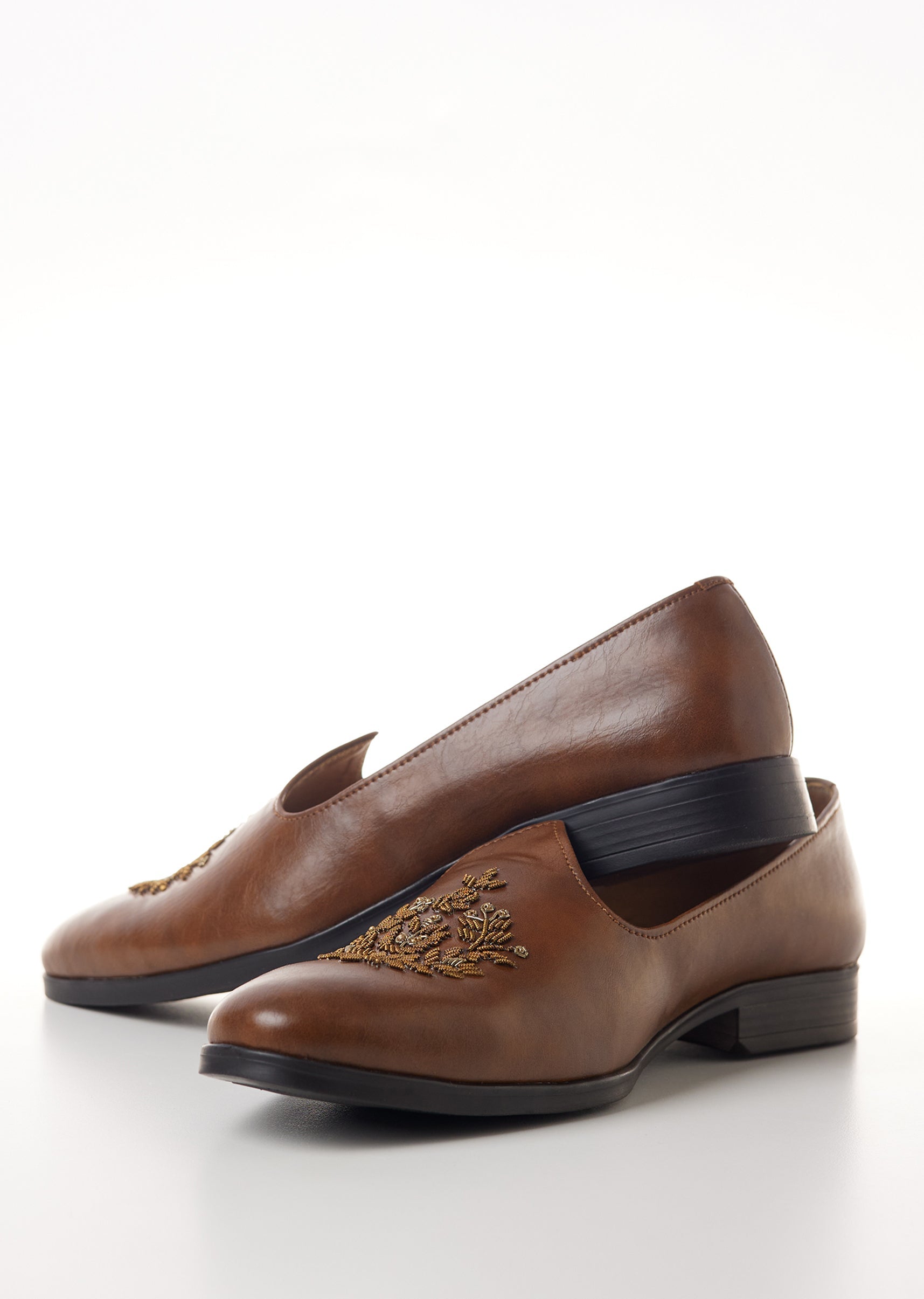 Brown Faux Leather Mens Loafers with Gold Thread Embroidery