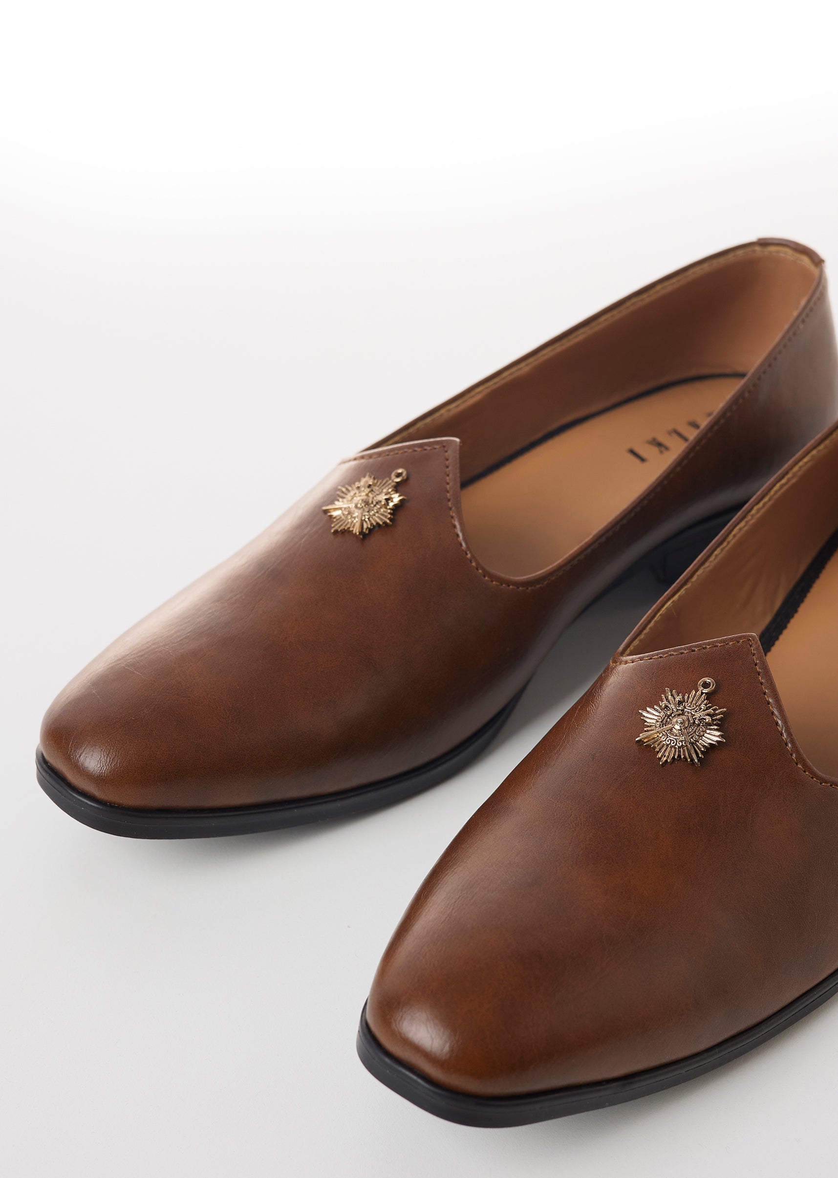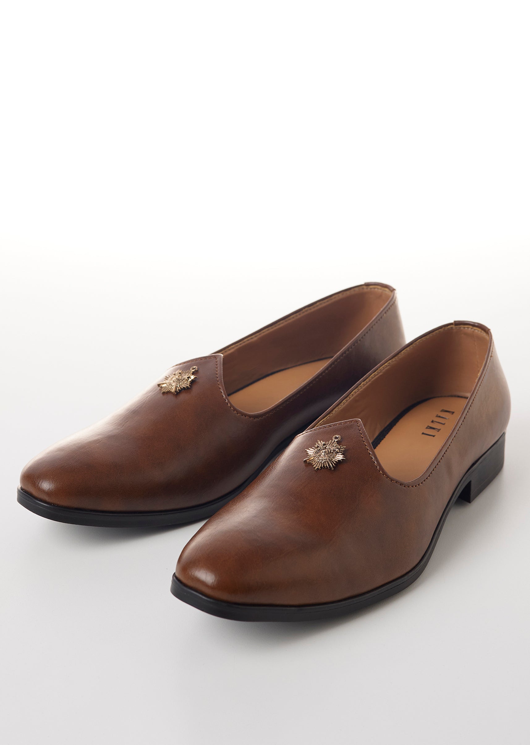 These premium brown loafers are crafted in high quality faux leather designed for weddings festive pooja mehendi engagement sangeet reception and Eid gatherings. The tabletop face and online exclusive finish give it a polished elevated appeal suitable for a groom a guest a groomsman or the grooms father or brother. The upper features an elegant metallic sun motif embellishment that adds a regal touch while the cushioned insole ensures day long comfort. Versatile refined and modern this pair completes both traditional and contemporary outfits effortlessly. Awarded as the Most Trusted Brand, we're delivering styles you love, just as promised.