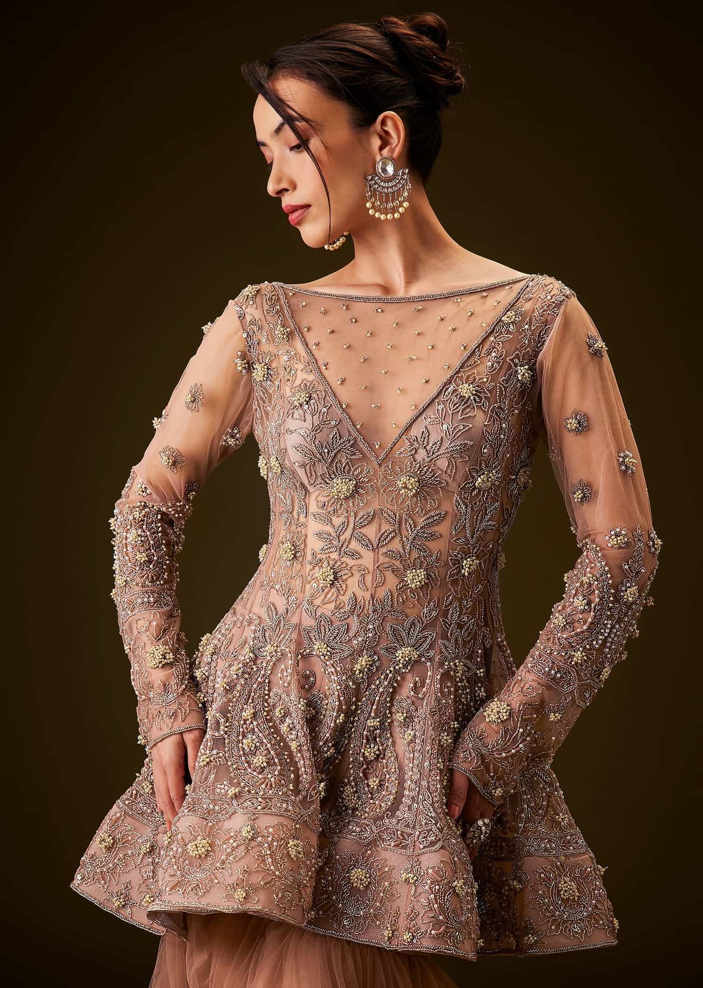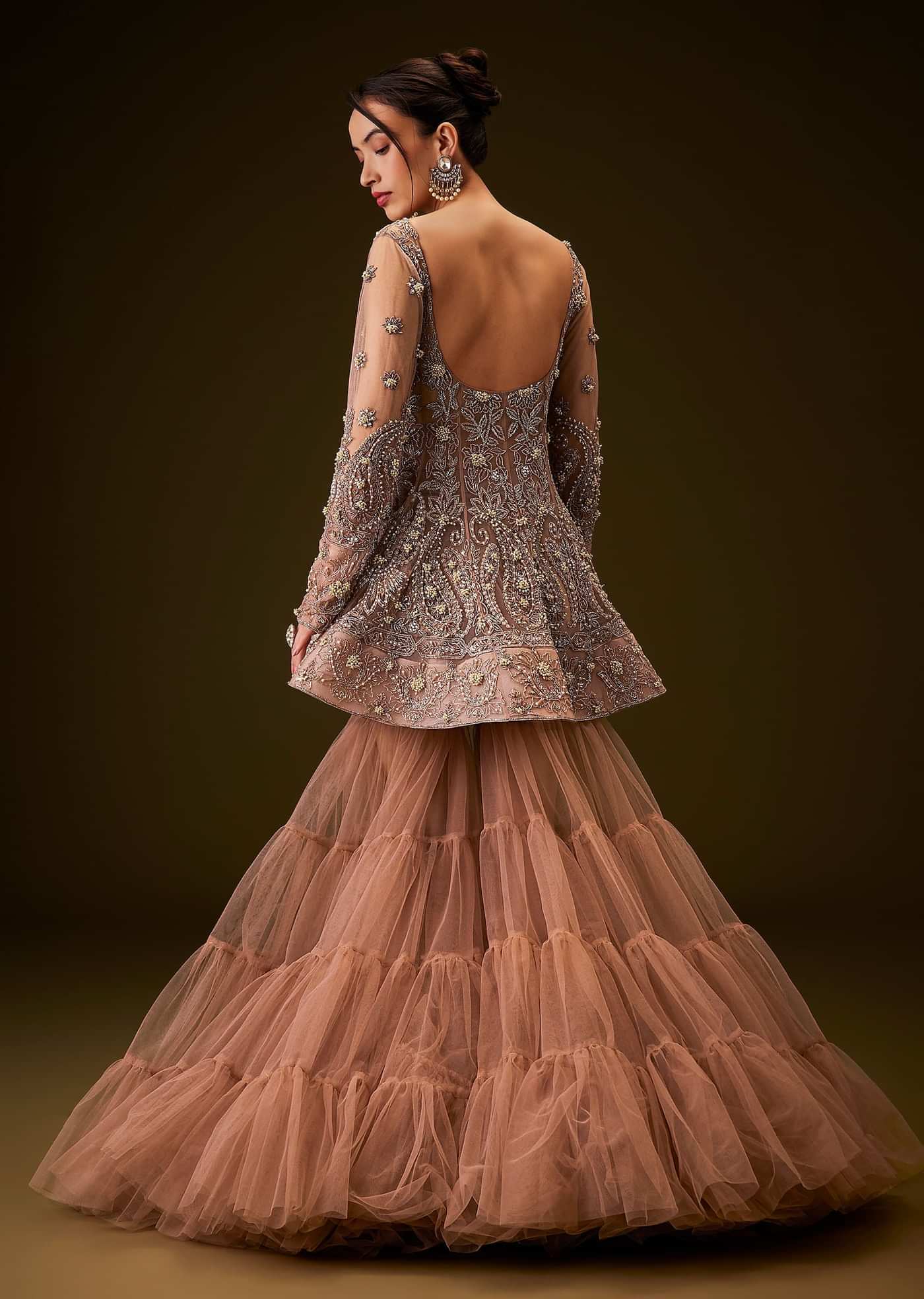 Enter A Realm Of Regal Allure With This Exquisite Brown Ensemble Crafted To Perfection With Intricate Hand Embroidery And Opulent Detailing. The Kurta Exudes Timeless Elegance While The Cascading Layers Of The Tiered Sharara Create A Dramatic Dreamlike Silhouette. Ideal For Festive Soirées Cocktail Celebrations Or PreWedding Events This Look Enchants With Its Blend Of Tradition And Contemporary Flair.
