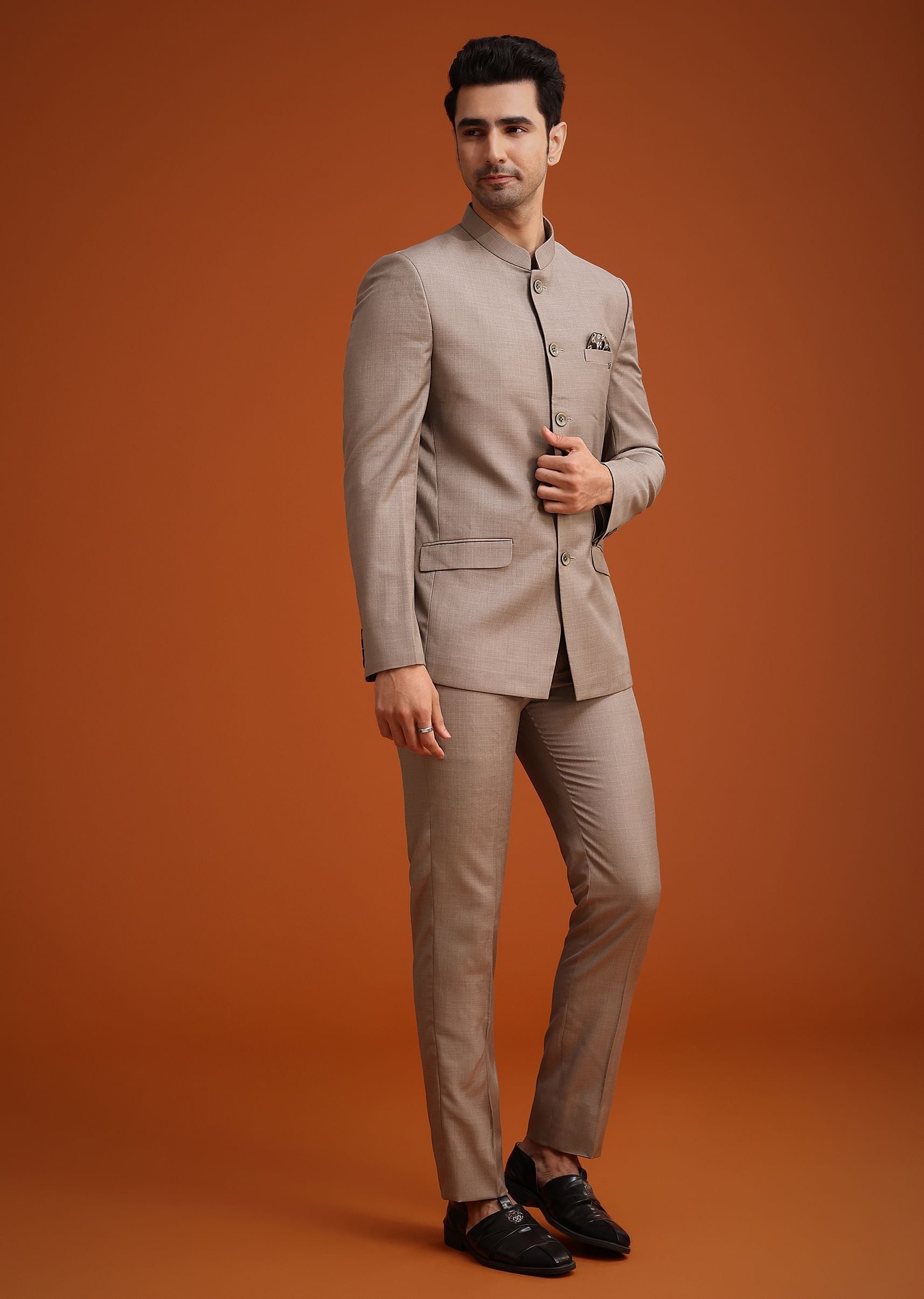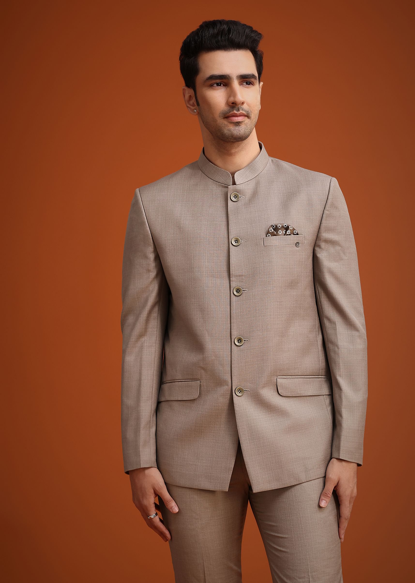 A timeless design that will add a refined touch to your traditional collection is this brown jodhpuri set. Designed with a mandarin collar, full sleeves and fancy front buttons, this... More Product Details