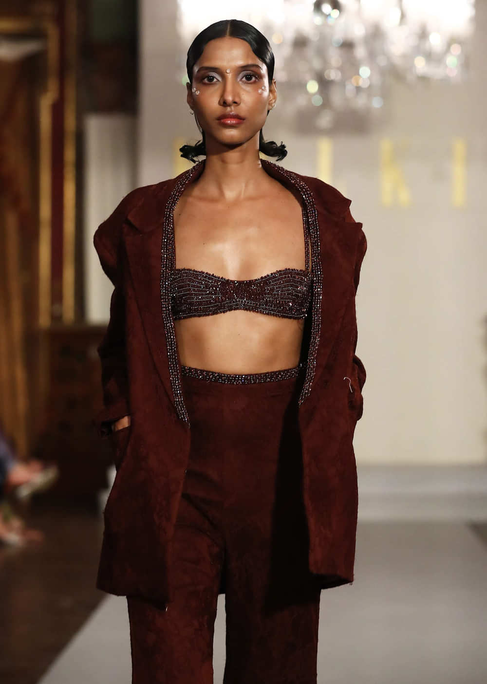 This brown crop top and skirt set in lace and suiting fabric turns tailoring into couture. Embroidered with beads and cutdana, the look is elevated with a blazer layer and... More Product Details