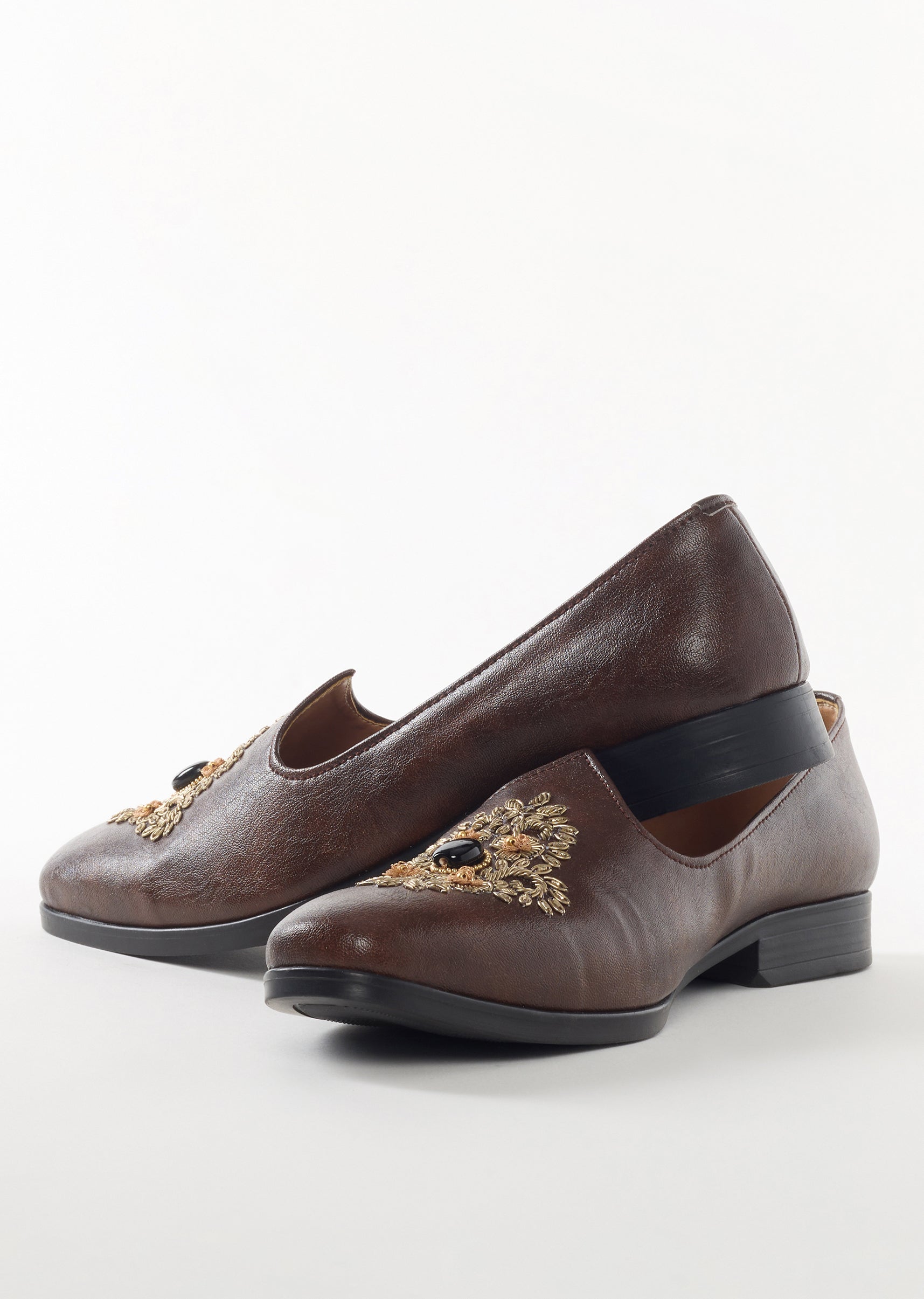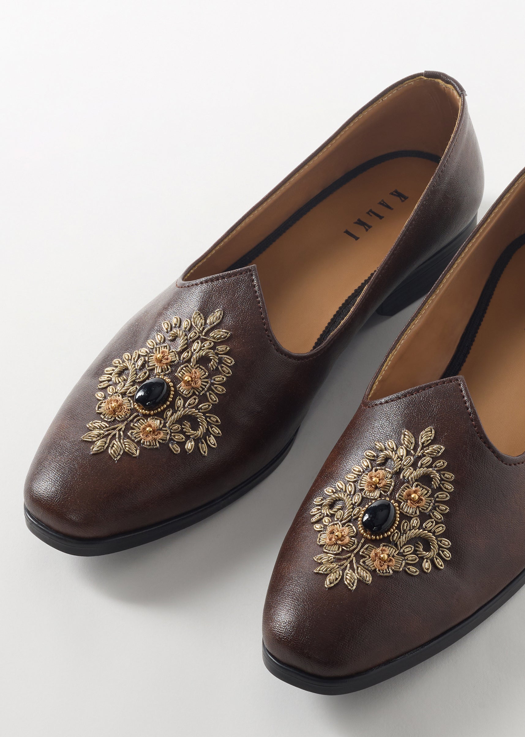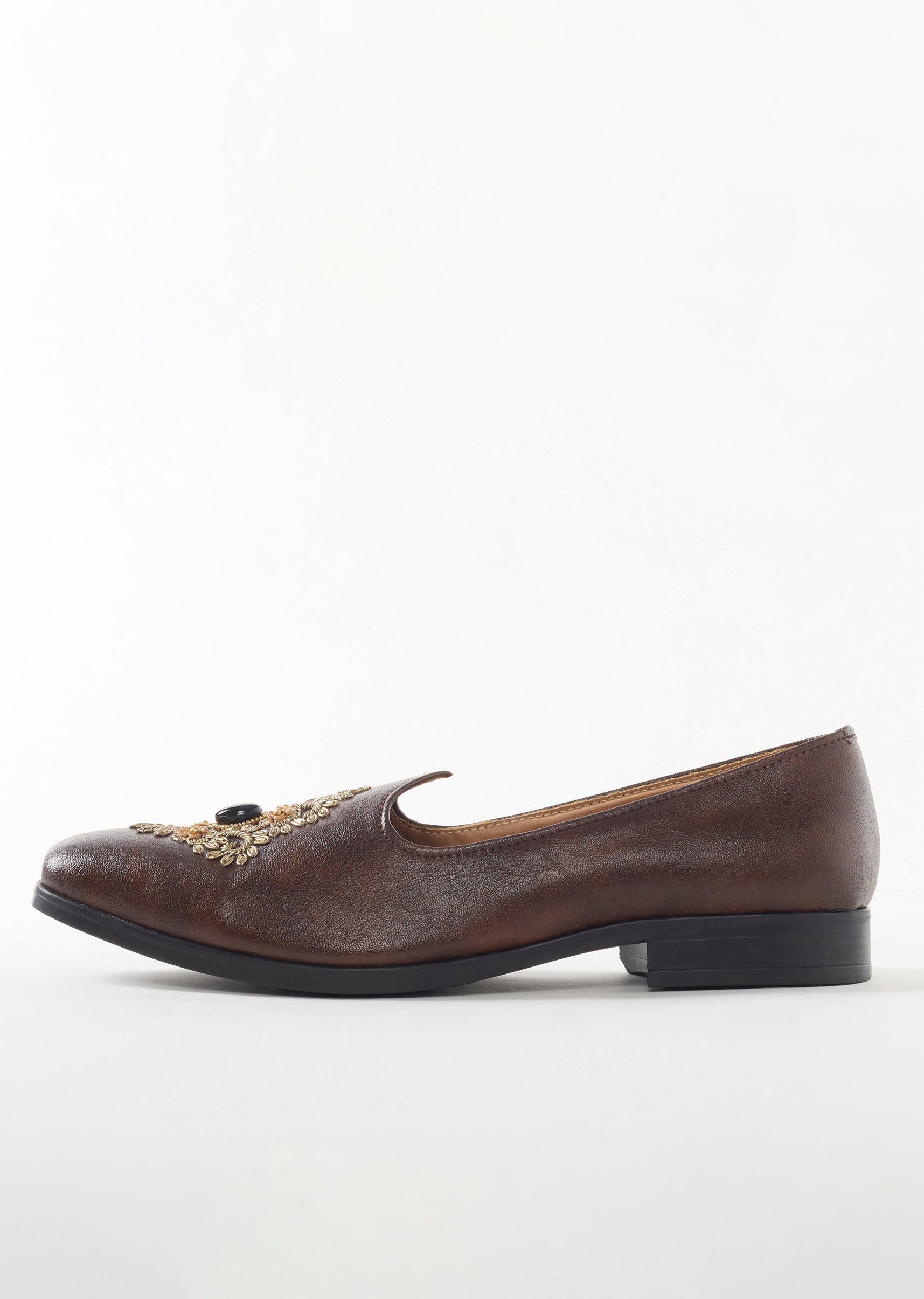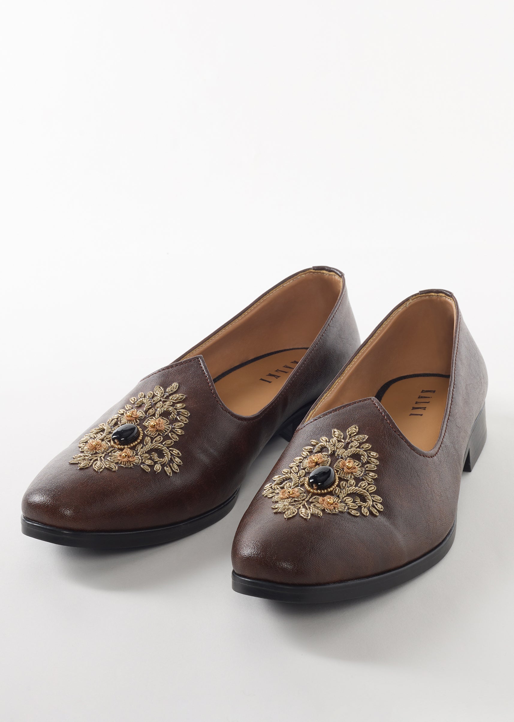 These brown ethnic juttis feature a premium leather finish with ornate floral embroidery and a central decorative stone that creates a rich and elegant look. The faux leather base with... More Product Details