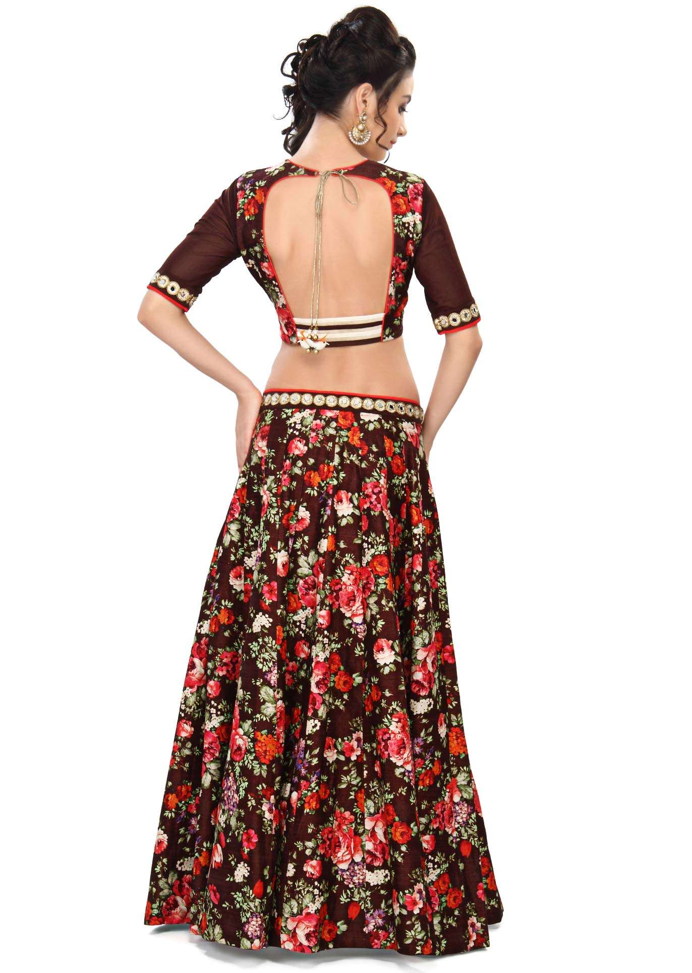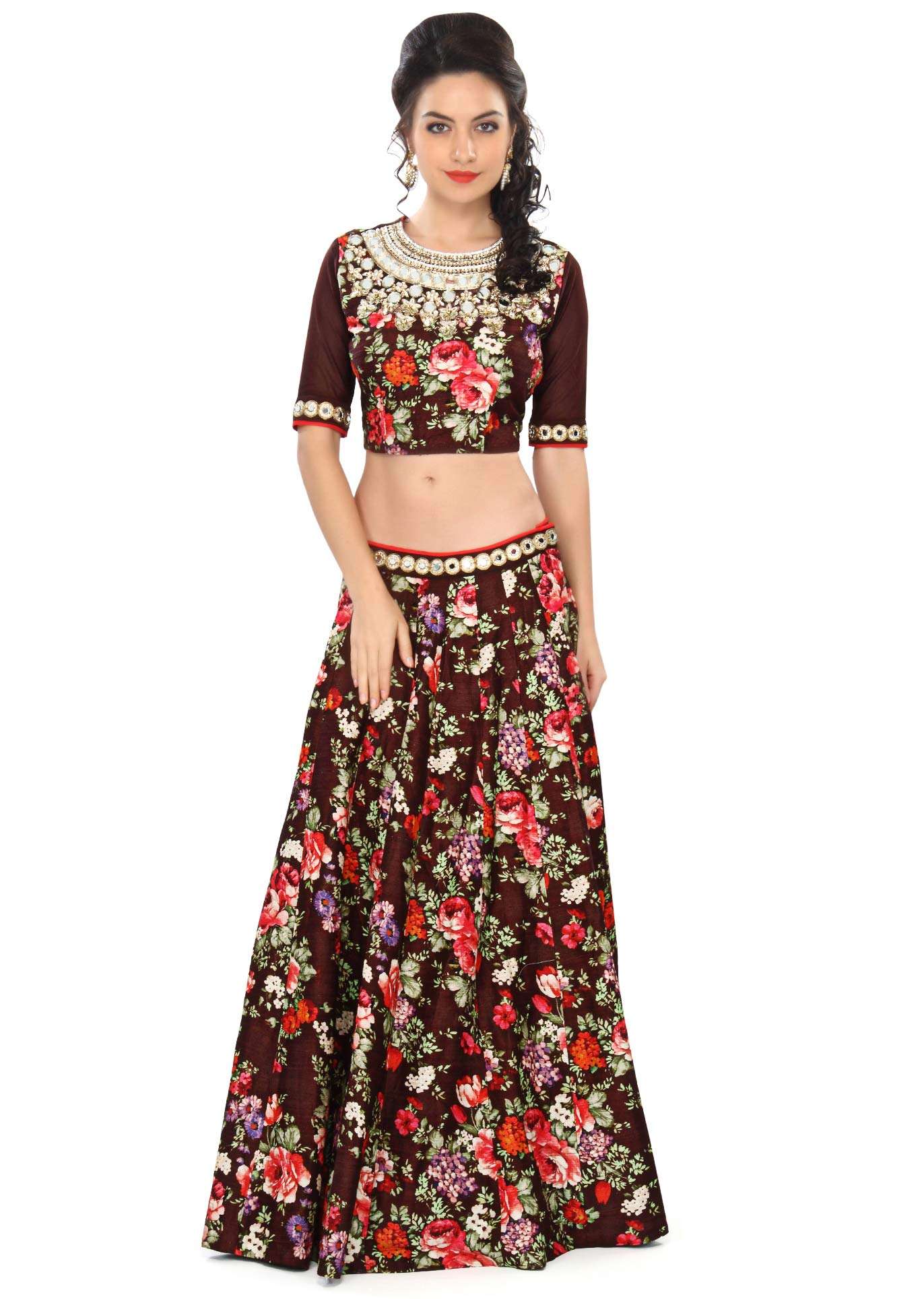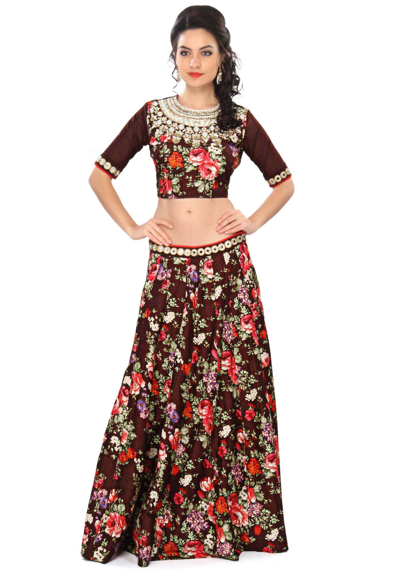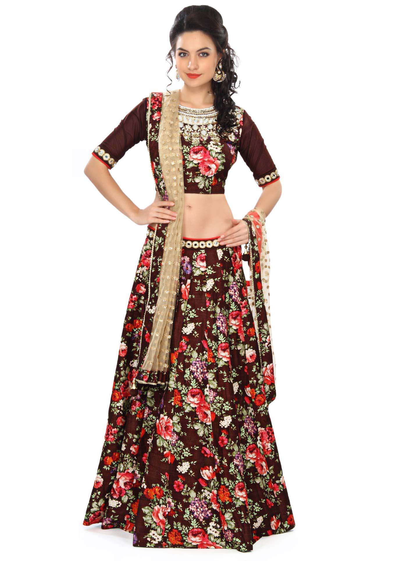 Brown lehenga embellished in print and mirror embroidery only on Kalki