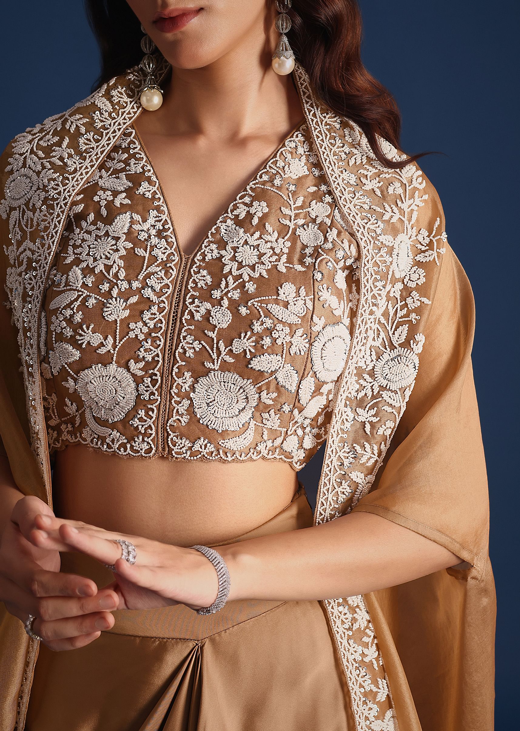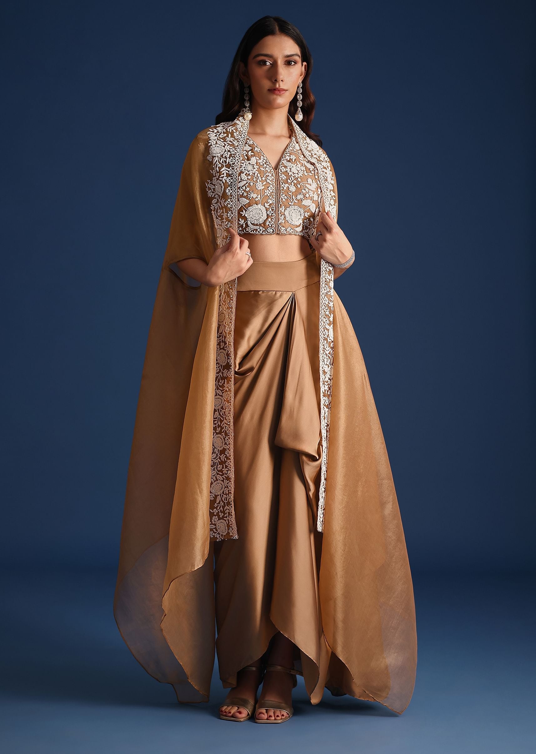 A mesmerizing medley of earthy hues and contemporary cuts. The embellished blouse and organza jacket are bedazzled with glistening sequins and detailed moti work. The asymmetrical hem and draped skirt... More Product Details