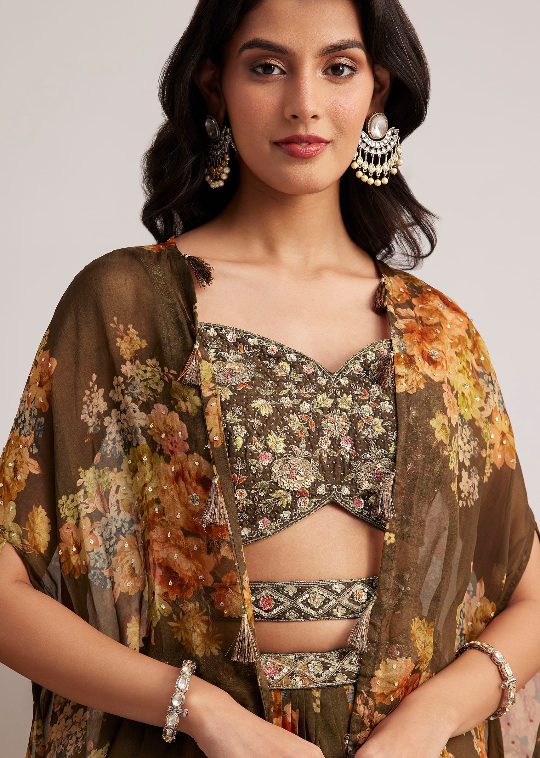 Brown Organza Floral Print Set With Zardosi And Sequins Work
