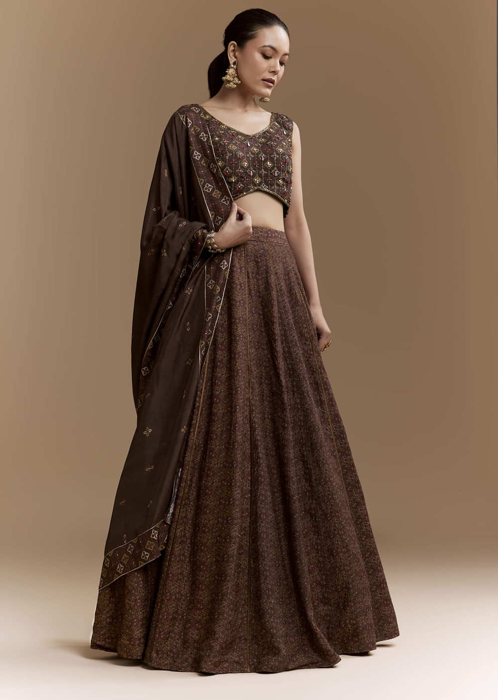 Intricately embroidered on luxurious silk, this rich brown lehenga set is perfect for moving through festive celebrations with ease. Glistening with cut dana, beads, and sequin work on the choli, the lehenga is detailed with all over captivating prints. Finished with a complementing dupatta, the blouse showcases a stunning V-neckline and tie-up back details. Awarded as the Most Trusted Brand, we're delivering styles you love, just as promised.