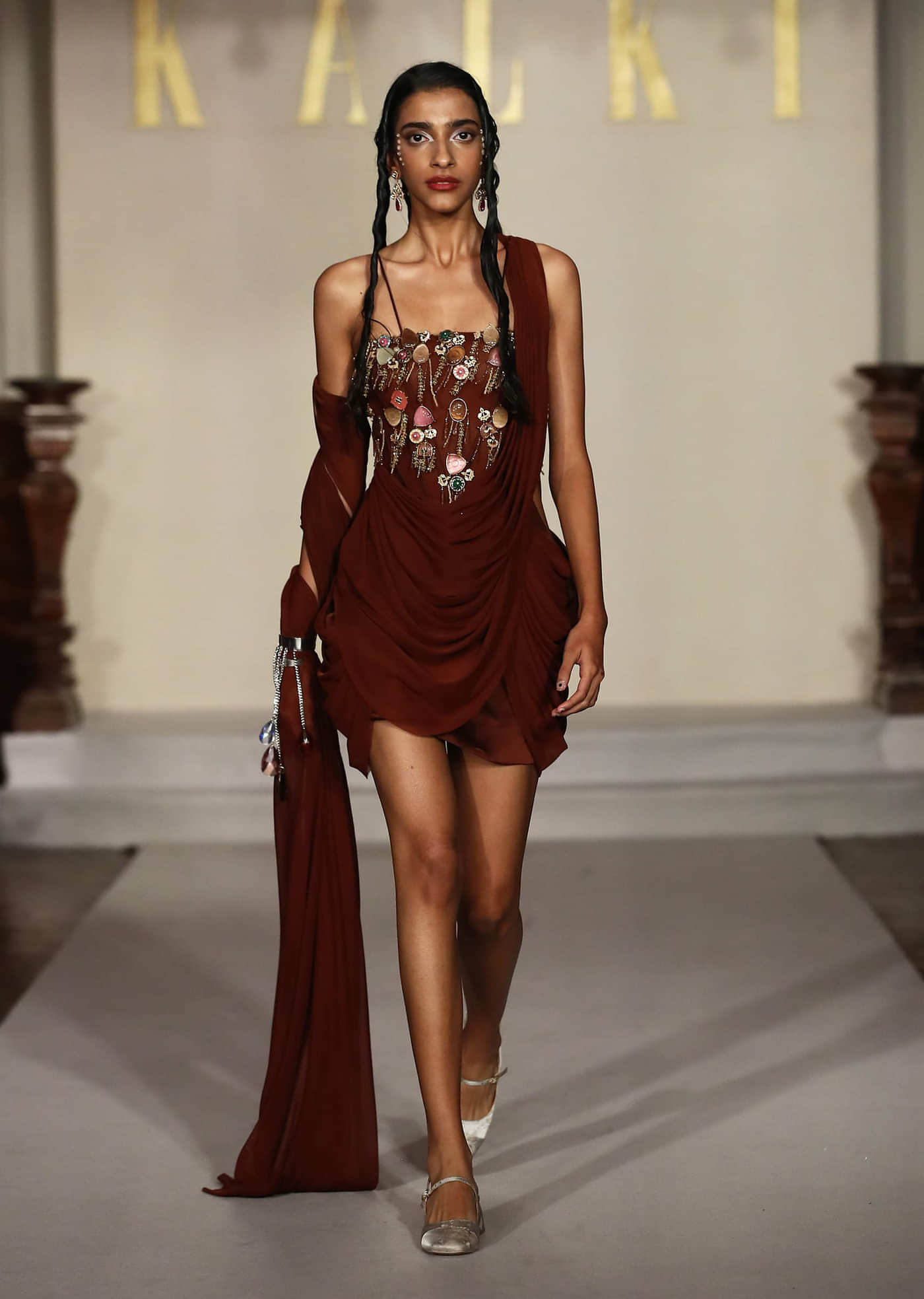 Chic and contemporary, this brown bridal mini dress in fancy satin fabric carries a modern cowl silhouette. Kundan embroidery elevates the mini dress, making it radiant under evening lights. Perfect... More Product Details