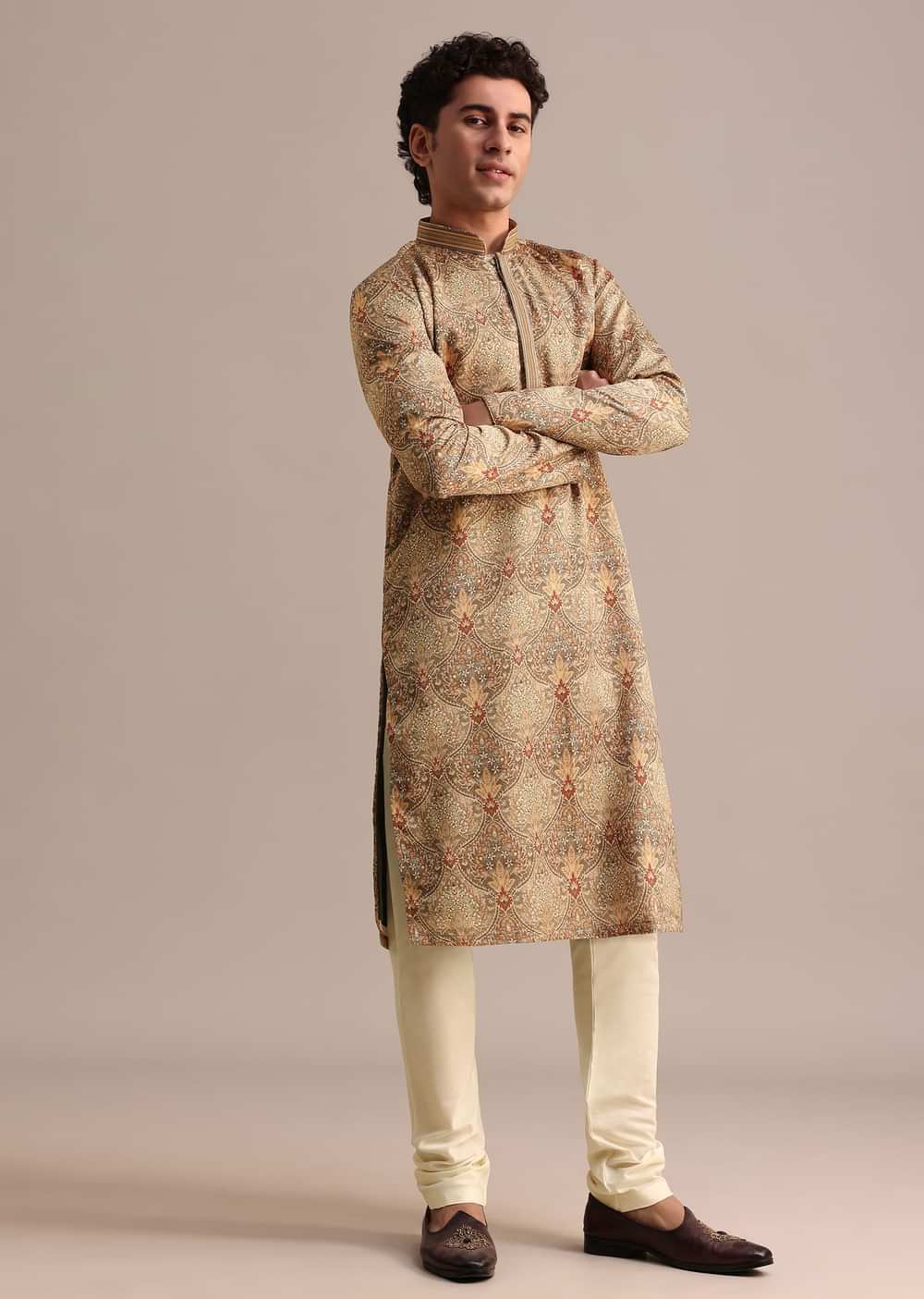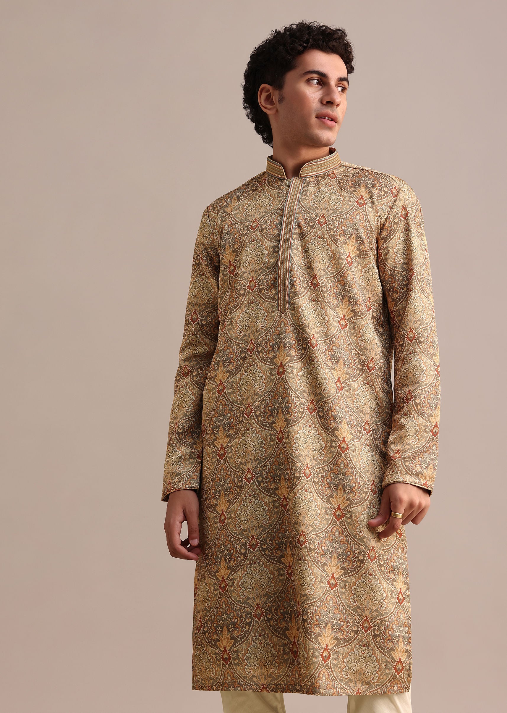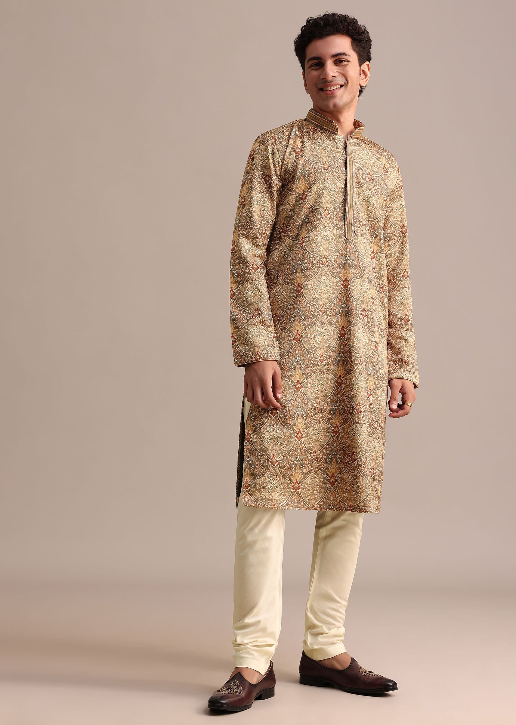 Indulge in the luxurious feel of our brown satin kurta set adorned with intricate prints that add a touch of sophistication. The rich fabric and exquisite design make this ensemble perfect for special occasions. The comfortable fit ensures you'll look and feel your best. This kurta comes with a pyjama. Awarded as the Most Trusted Brand, we're delivering styles you love, just as promised.