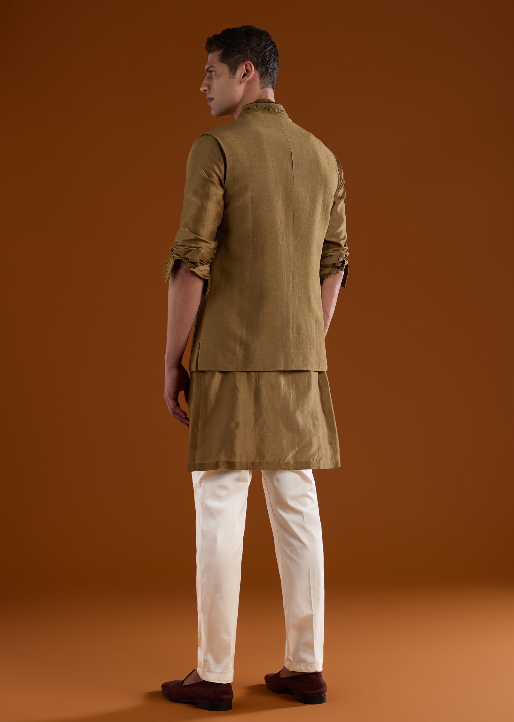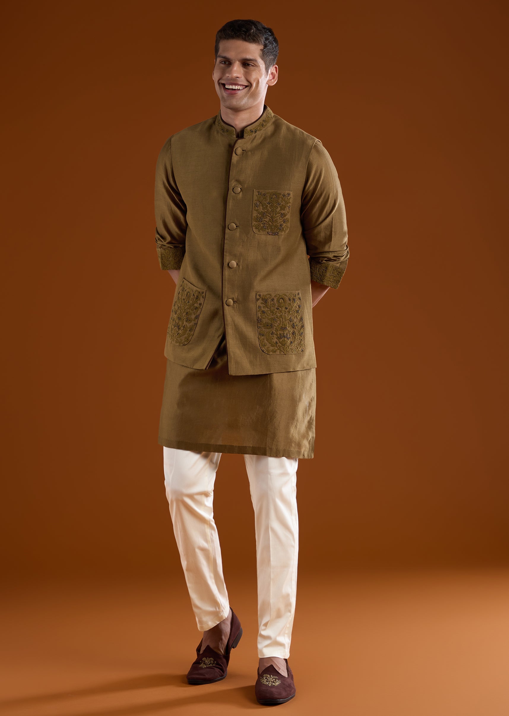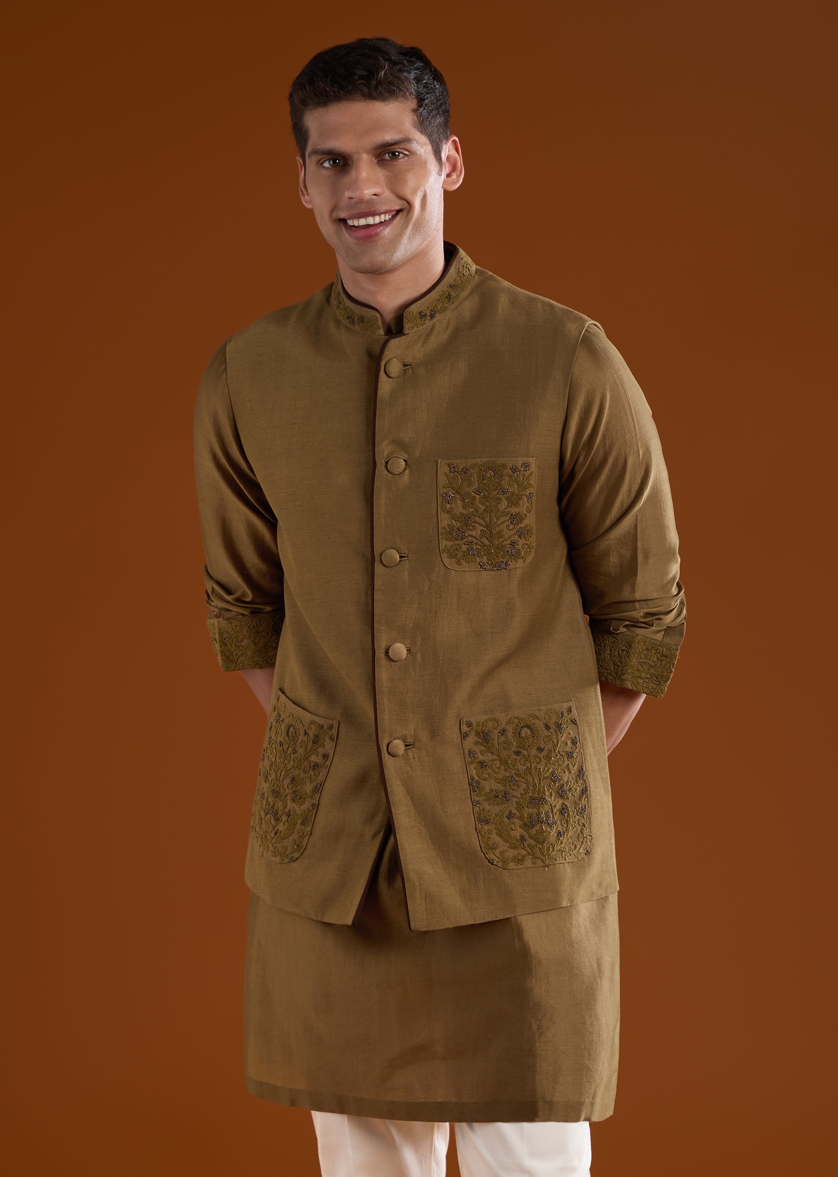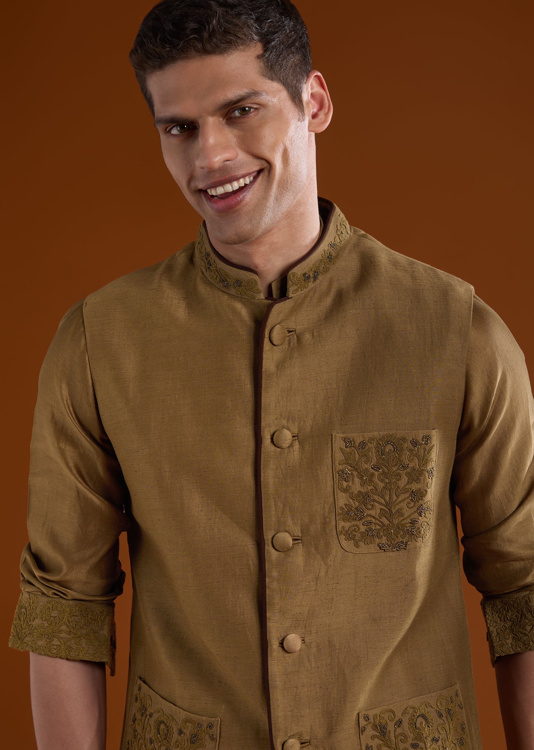 An elegant option for haldi, mehendi, and reception functions, this brown silk kurta set features refined bead and thread work for added depth. The full sleeves and mandarin collar provide... More Product Details