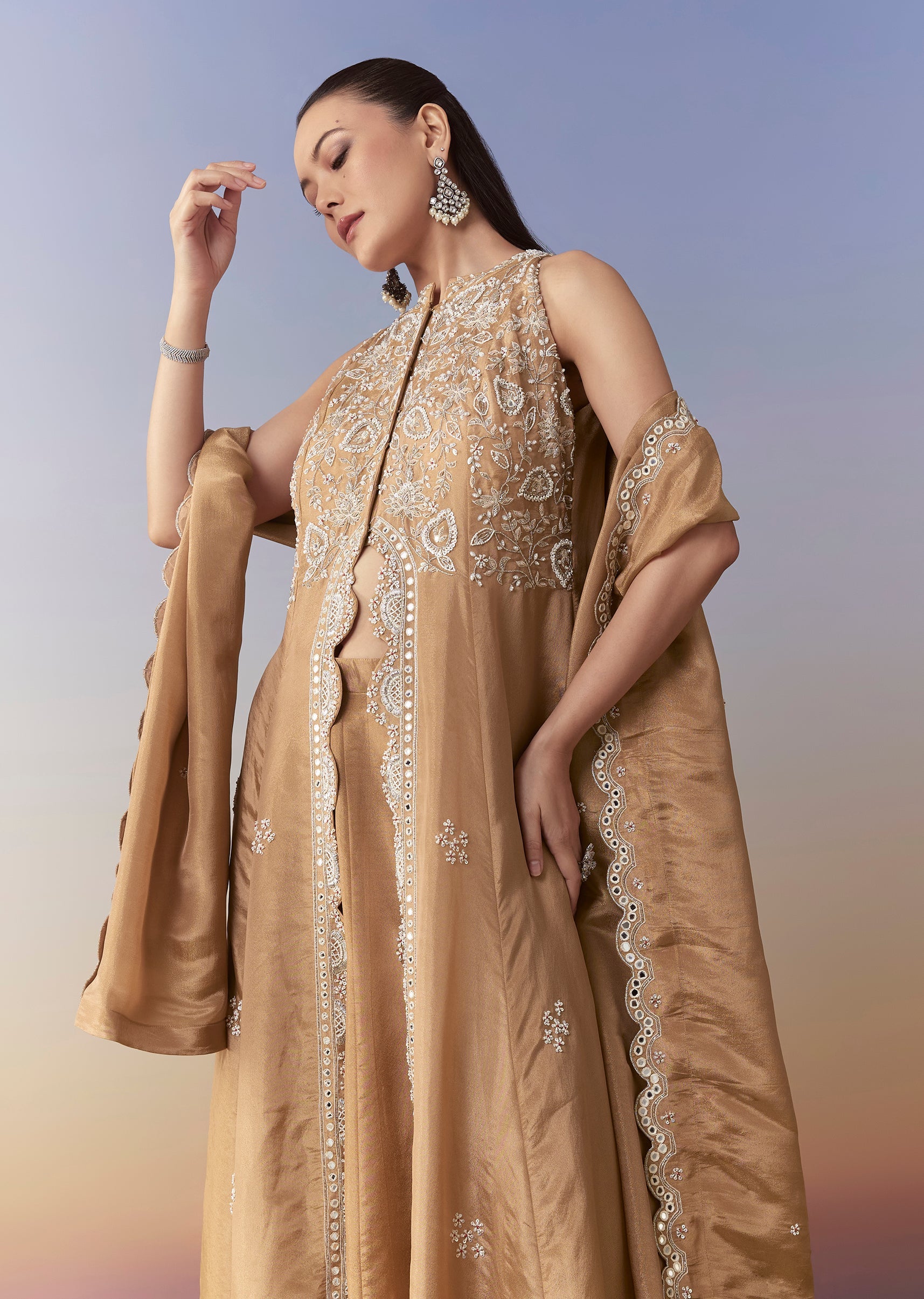Embrace refined Indo-western elegance with this light brown front-slit anarkali, beautifully detailed with cutdana and bead work for a subtle festive shimmer. The scallop-cut border adds graceful definition, while the... More Product Details