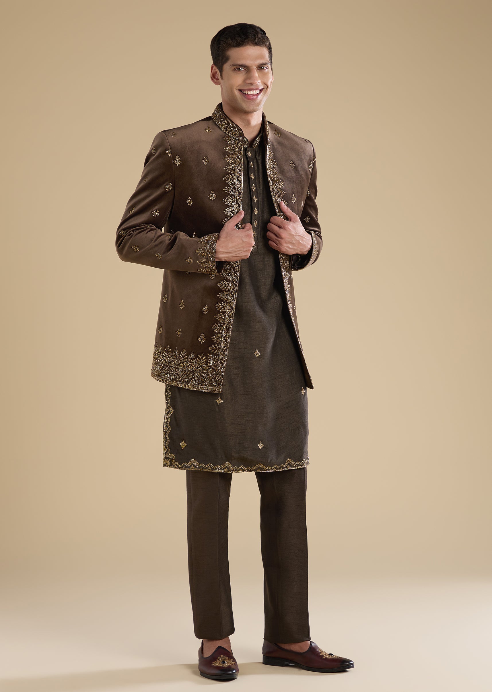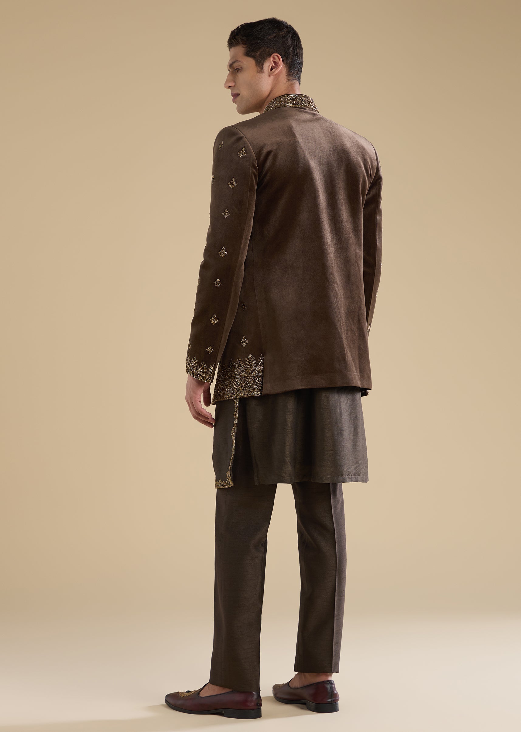 Brown Velvet Embellished Jodhpuri Set With Kurta And Pants