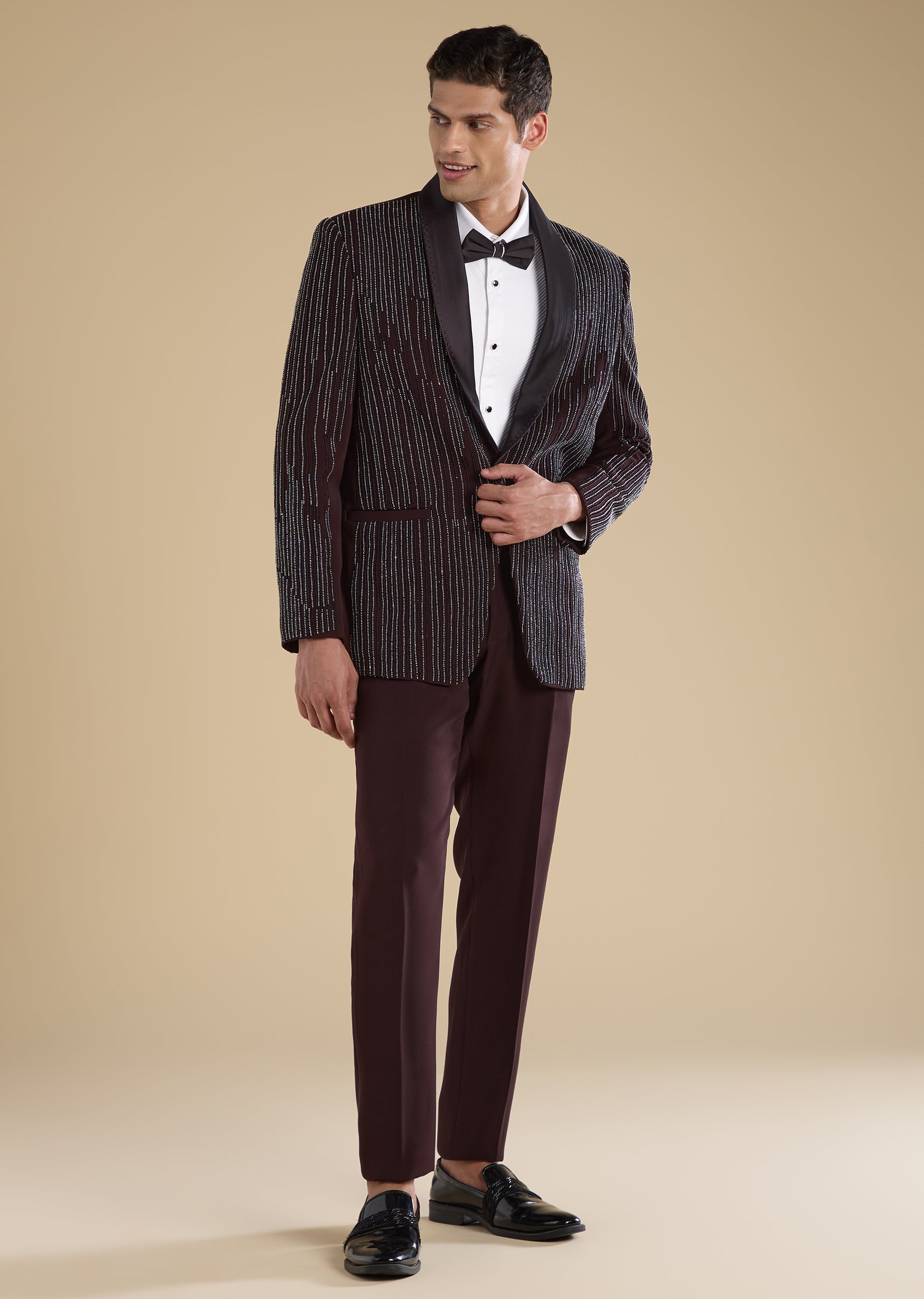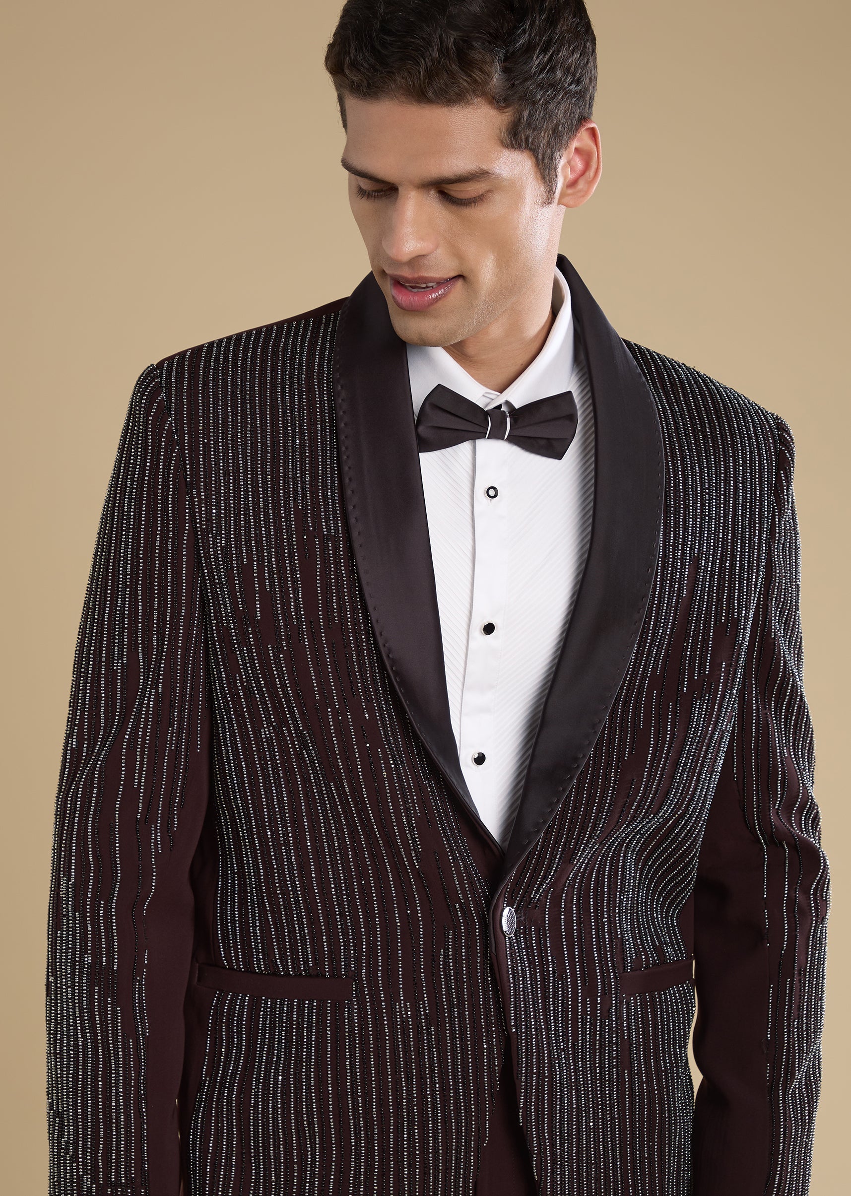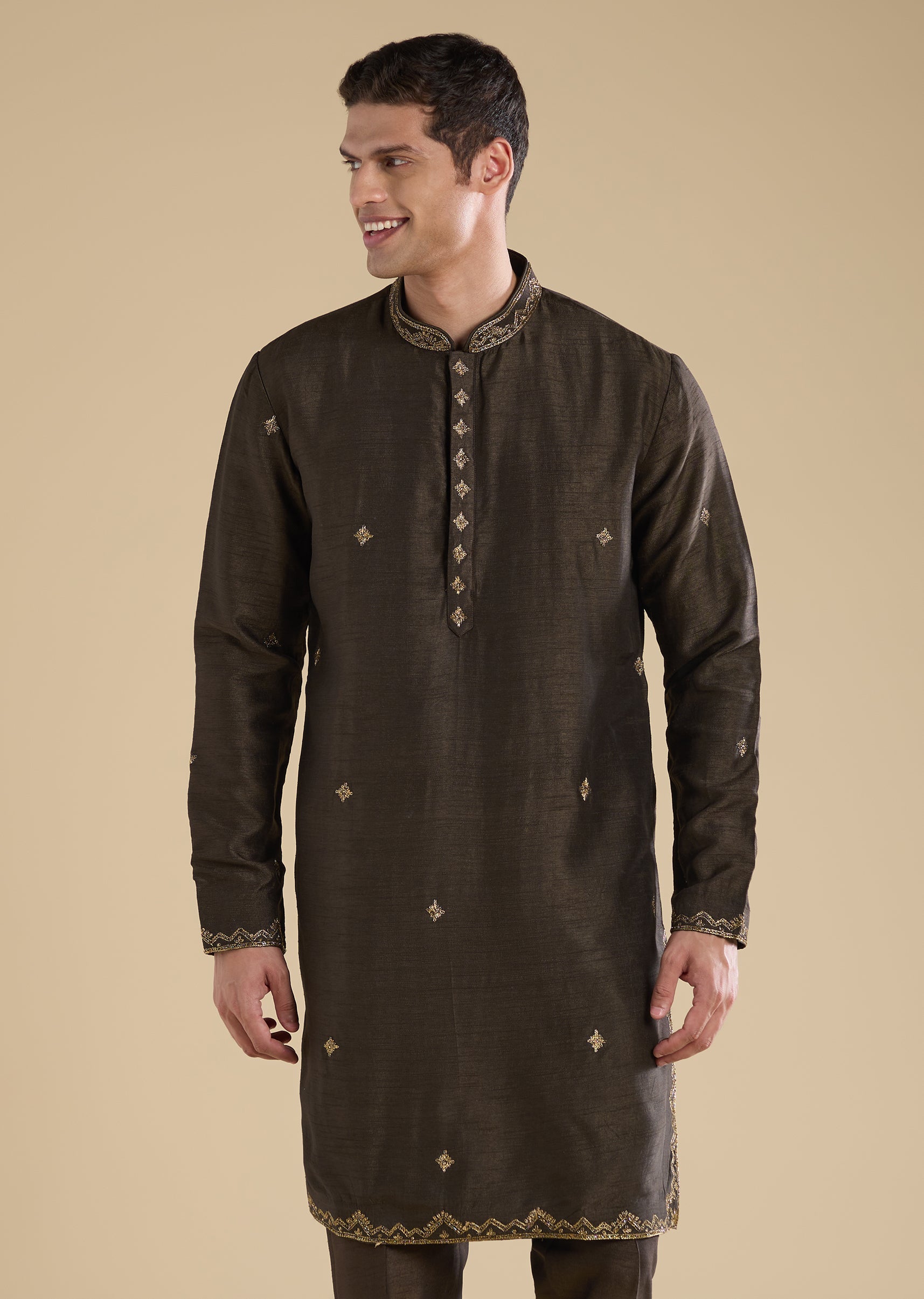 Crafted in rich velvet, this brown jodhpuri set features intricate thread, zari and zardosi embroidery. Finished with a mandarin collar, full sleeves and front hook-eye closure, it comes with a... More Product Details