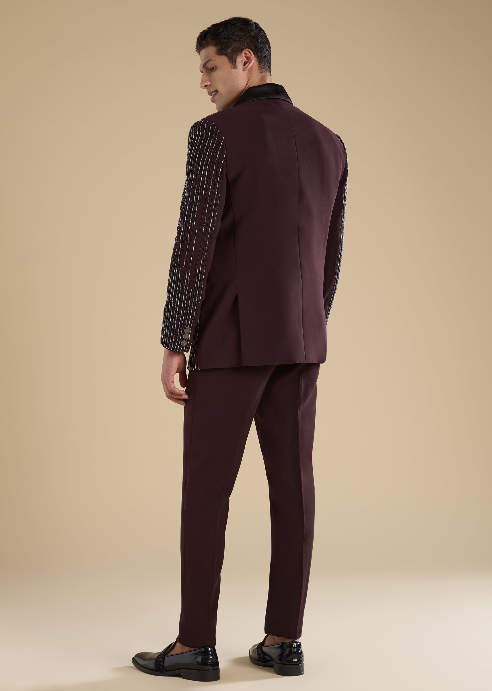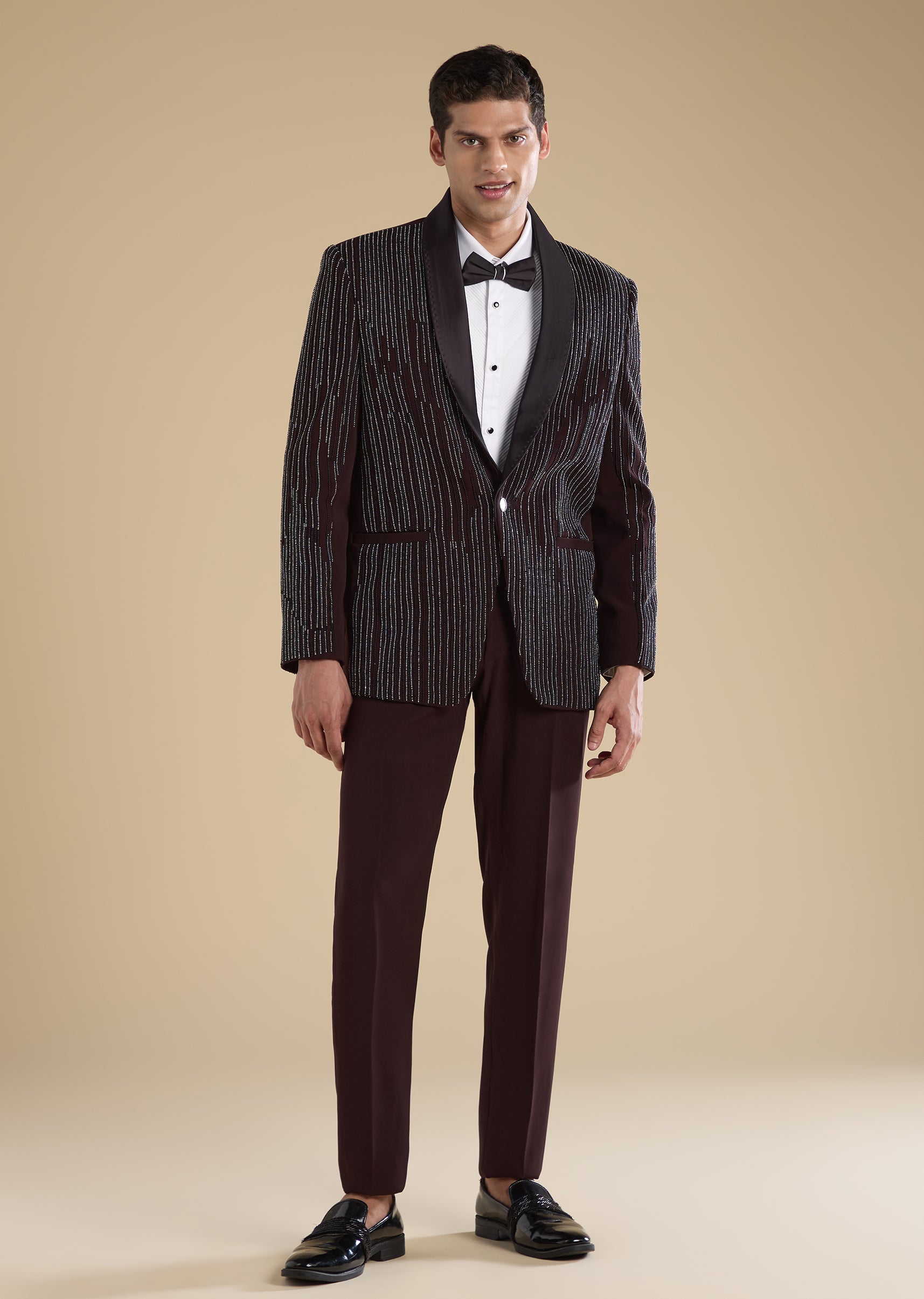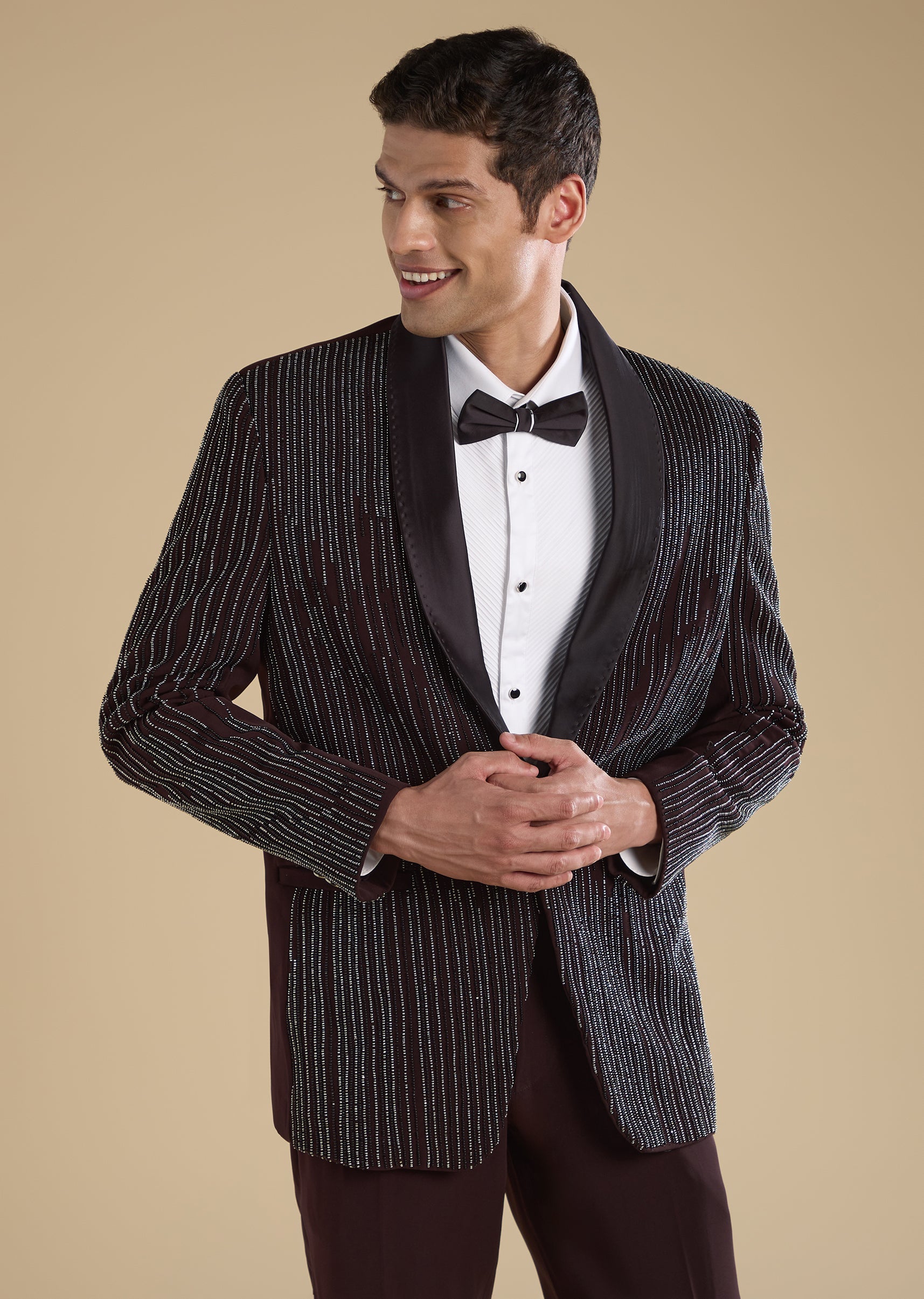Crafted in rich velvet, this brown jodhpuri set features intricate thread, zari and zardosi embroidery. Finished with a mandarin collar, full sleeves and front hook-eye closure, it comes with a... More Product Details