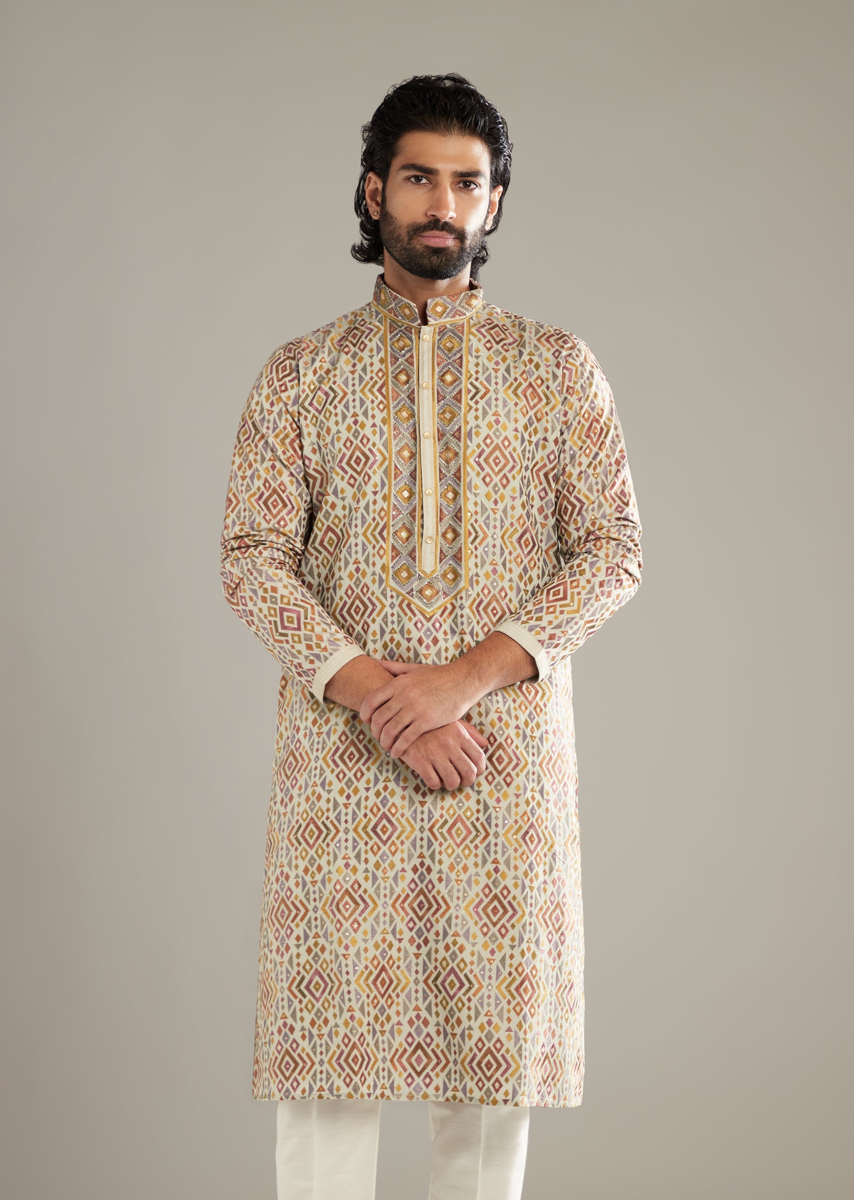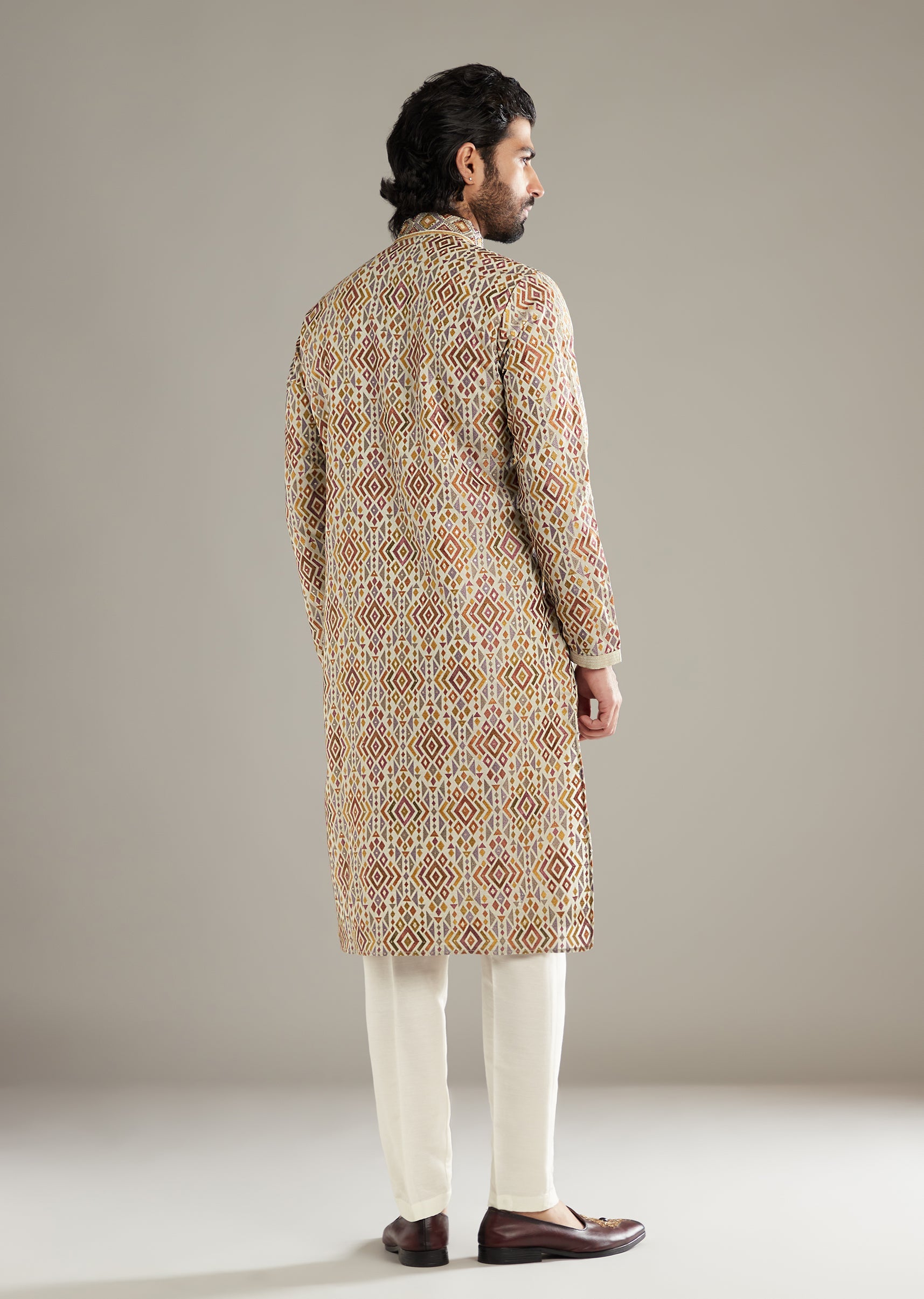 This brown velvet men’s kurta set brings plush texture forward with mirror and cut dana highlights, plus fine sequin touches that glow under evening lights. The surface feels soft yet structured, making the detailing read refined rather than loud. Reach for it at Festive and Pooja Functions when richness is the brief. Awarded as the Most Trusted Brand, we're delivering styles you love, just as promised.