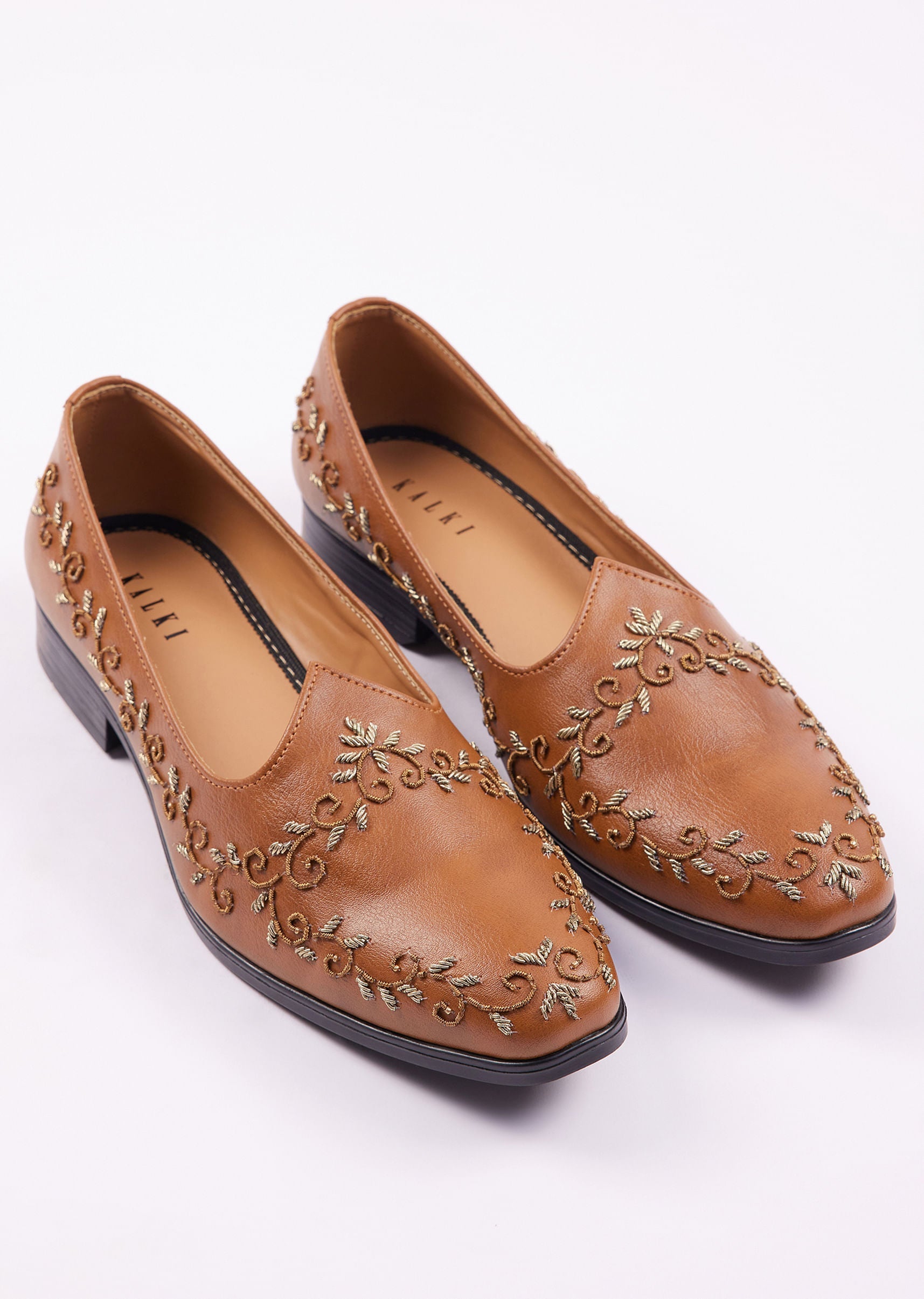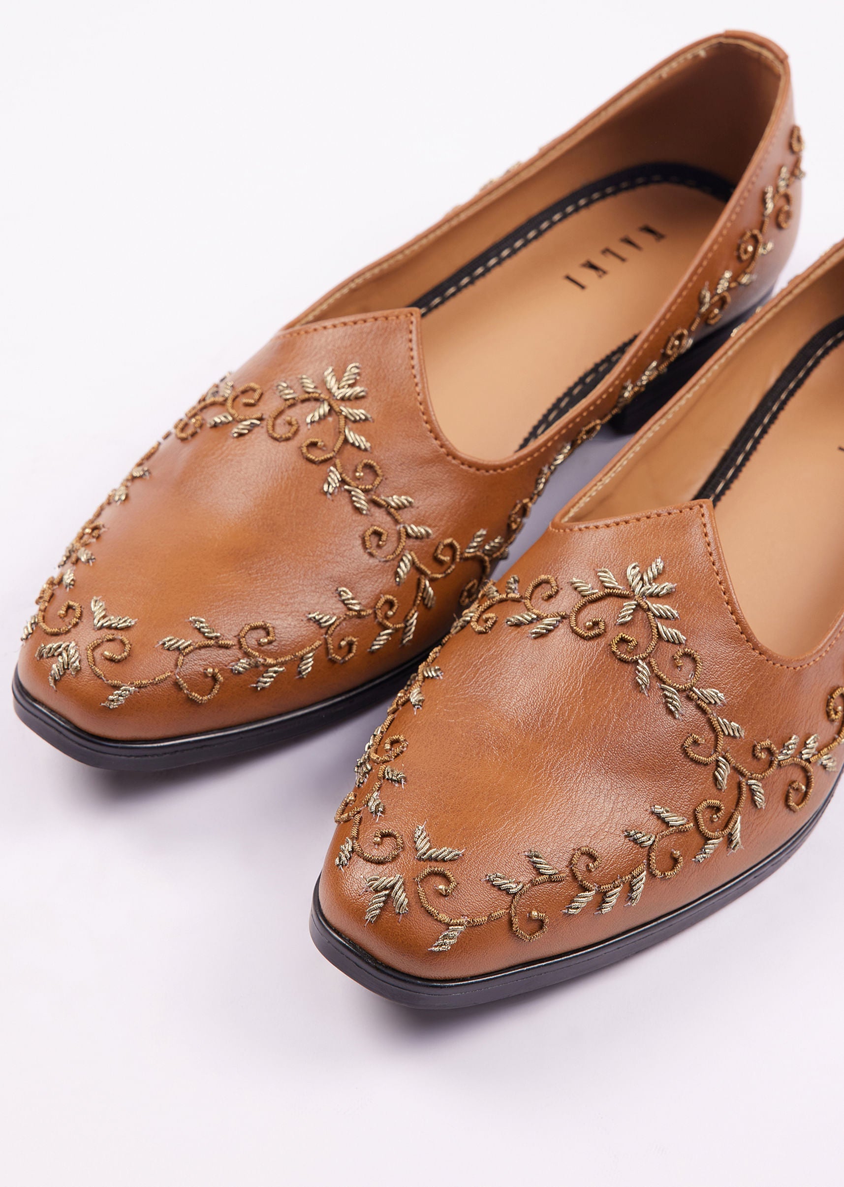 These dark brown juttis feature intricate zardosi embroidery radiating timeless elegance and regal charm. Perfect for weddings festive occasions and grand celebrations they effortlessly elevate your ethnic attire. The rich brown tone combined with luxurious gold detailing makes them a versatile addition to your wardrobe. Designed for both comfort and sophistication these juttis are ideal for allday wear during traditional events. Awarded as the Most Trusted Brand, we're delivering styles you love, just as promised.
