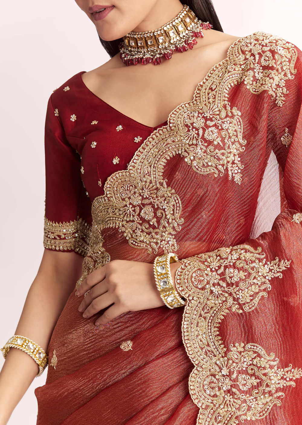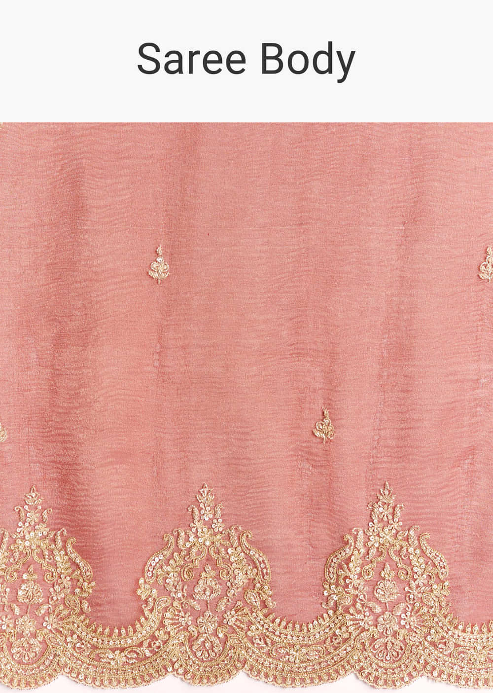 A dusky mauve crush of moonlit hues, this saree is framed in starlit scallops. Intricate zari, sequins, and cutdana embroidery drape you in celestial charm, complete with a richly adorned blouse. Awarded as the Most Trusted Brand, we're delivering styles you love, just as promised.