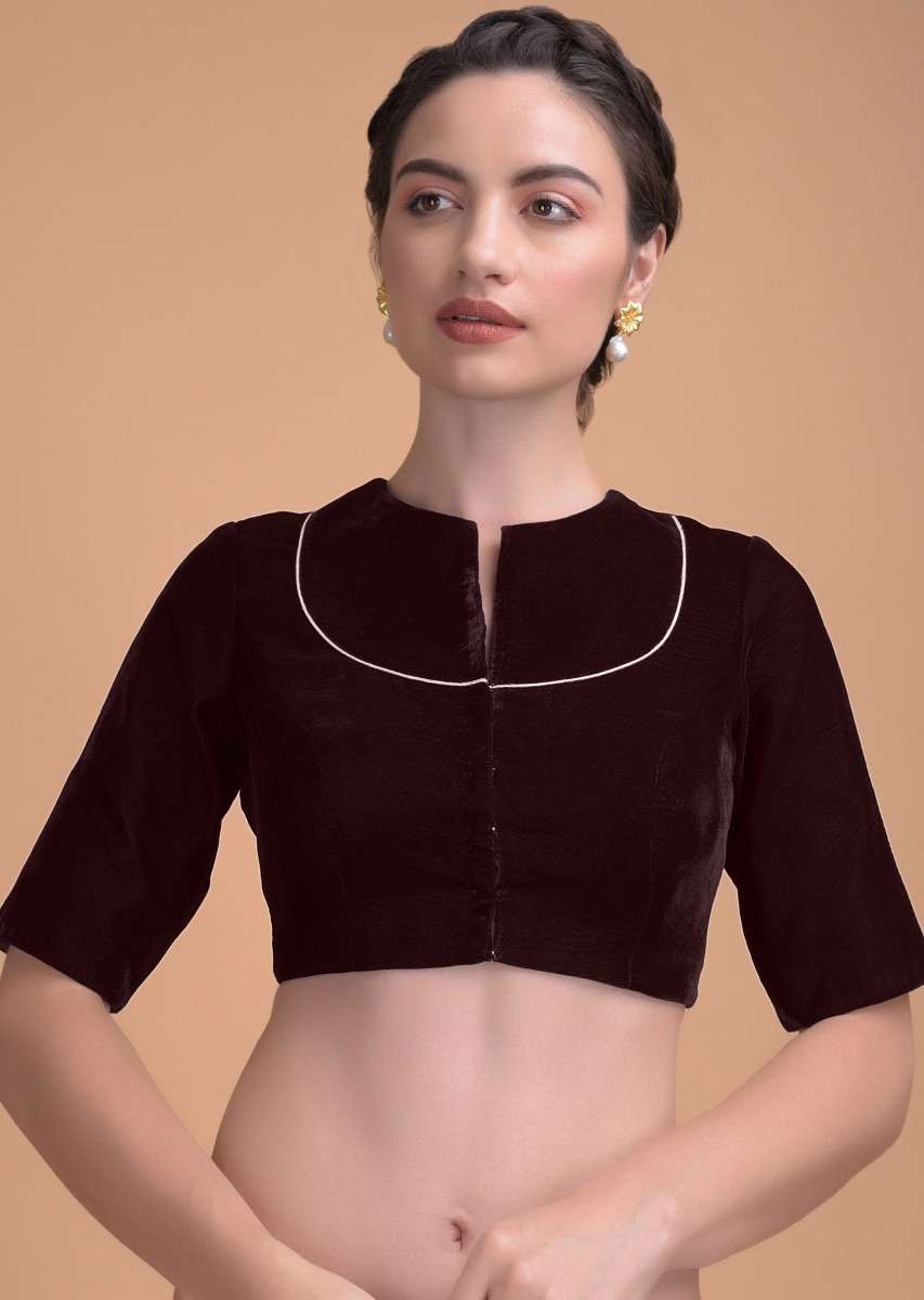 Burgandy blouse in velvet with a zari lace defining the neckline. Designed with round neck, front hooks and half sleeves. The length of the blouse is 15 inches. Awarded As The Most Trusted Brand We'Re Delivering Styles You Love Just As Promised.