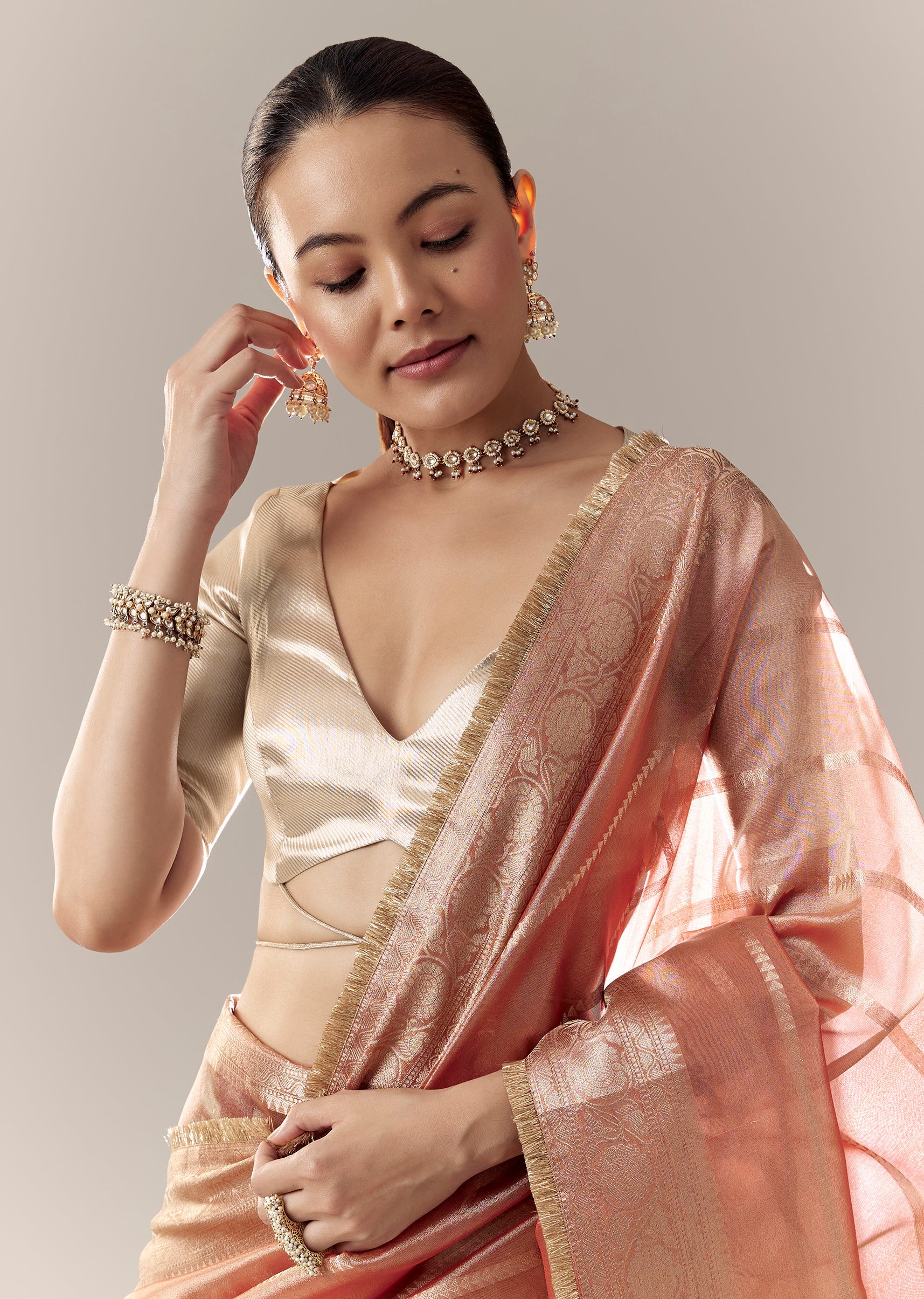 A champagne gold blouse with a V-neckline, elbow/3-4th sleeves, and criss-cross tie-up at the back—perfect for dressy saree looks. Awarded as the Most Trusted Brand, we're delivering styles you love, just as promised.