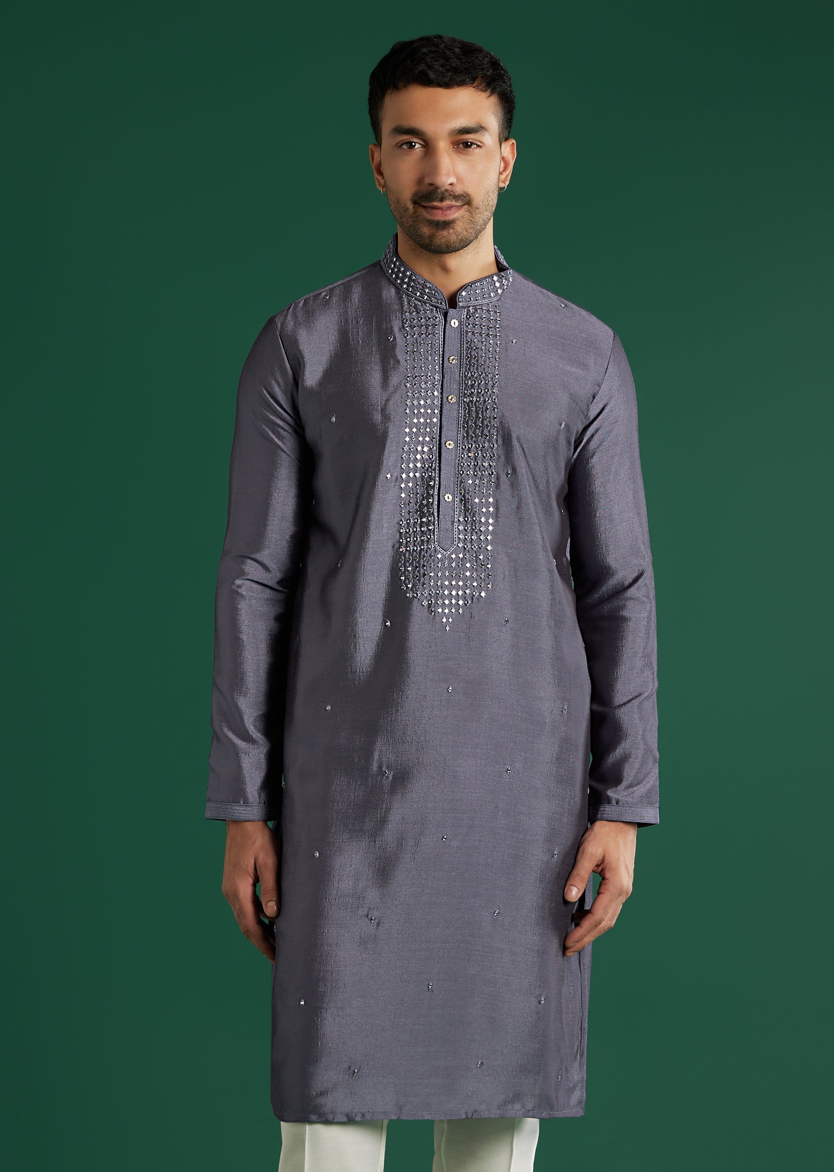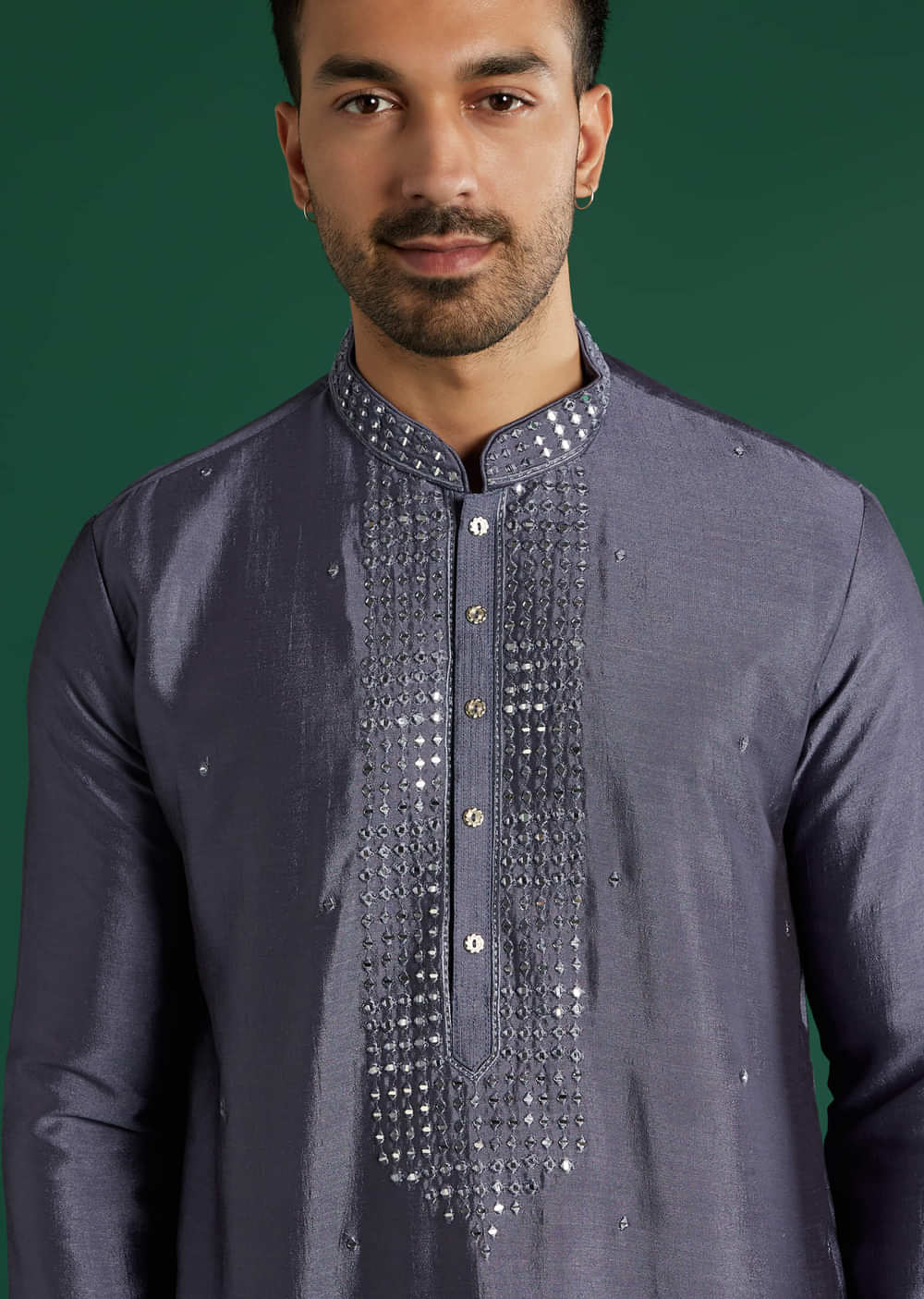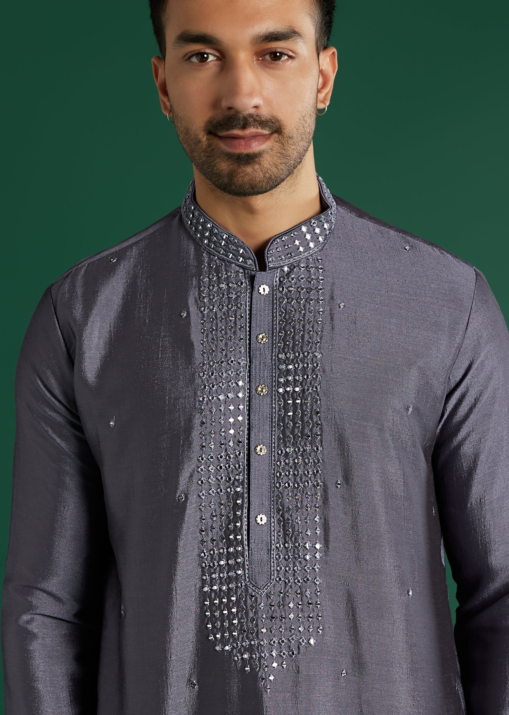 Charcoal Grey Silk Kurta Set For Men With Mirror Work