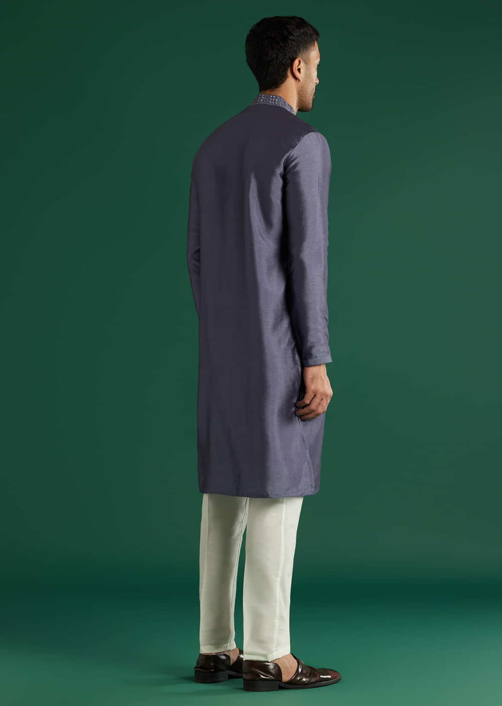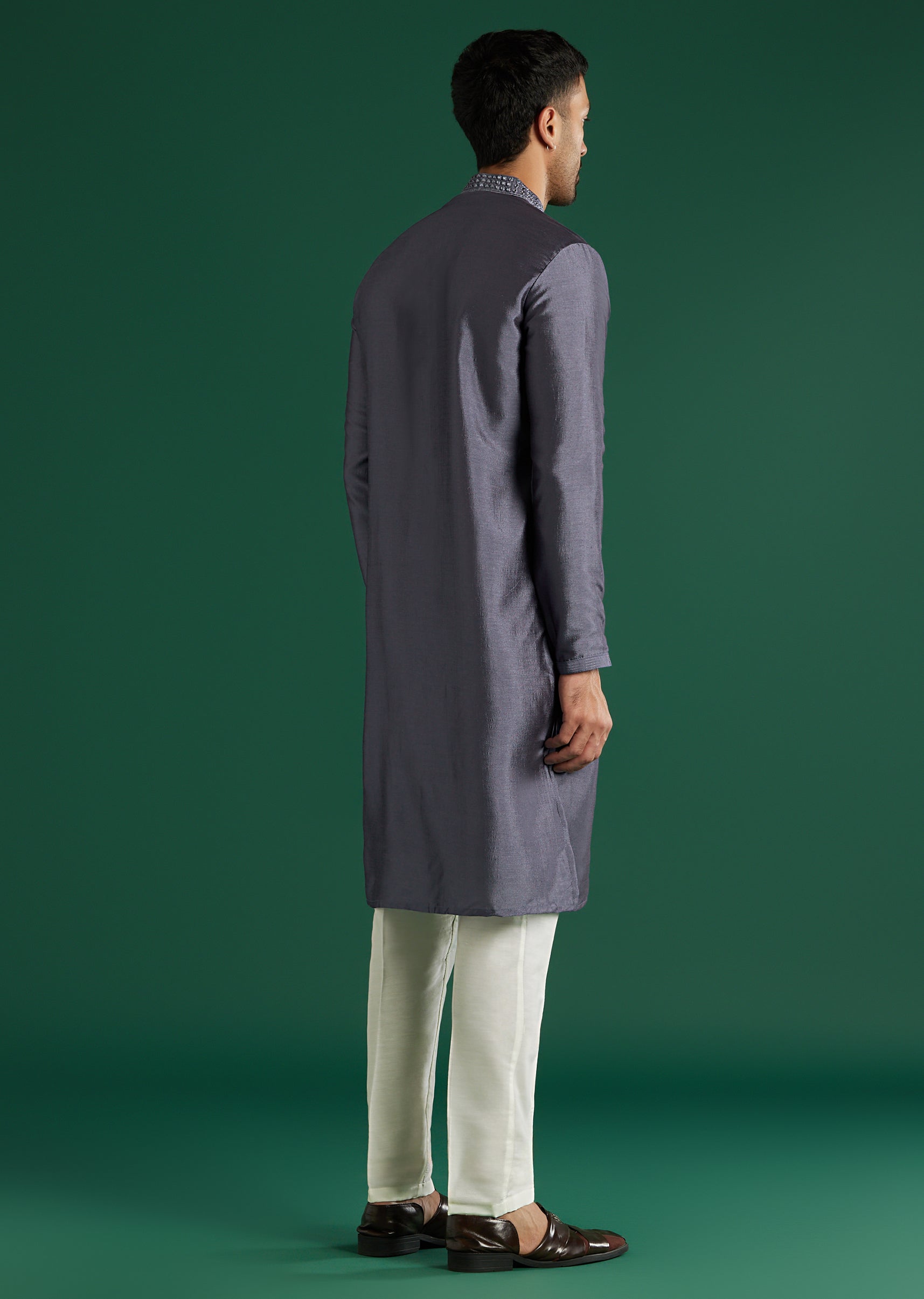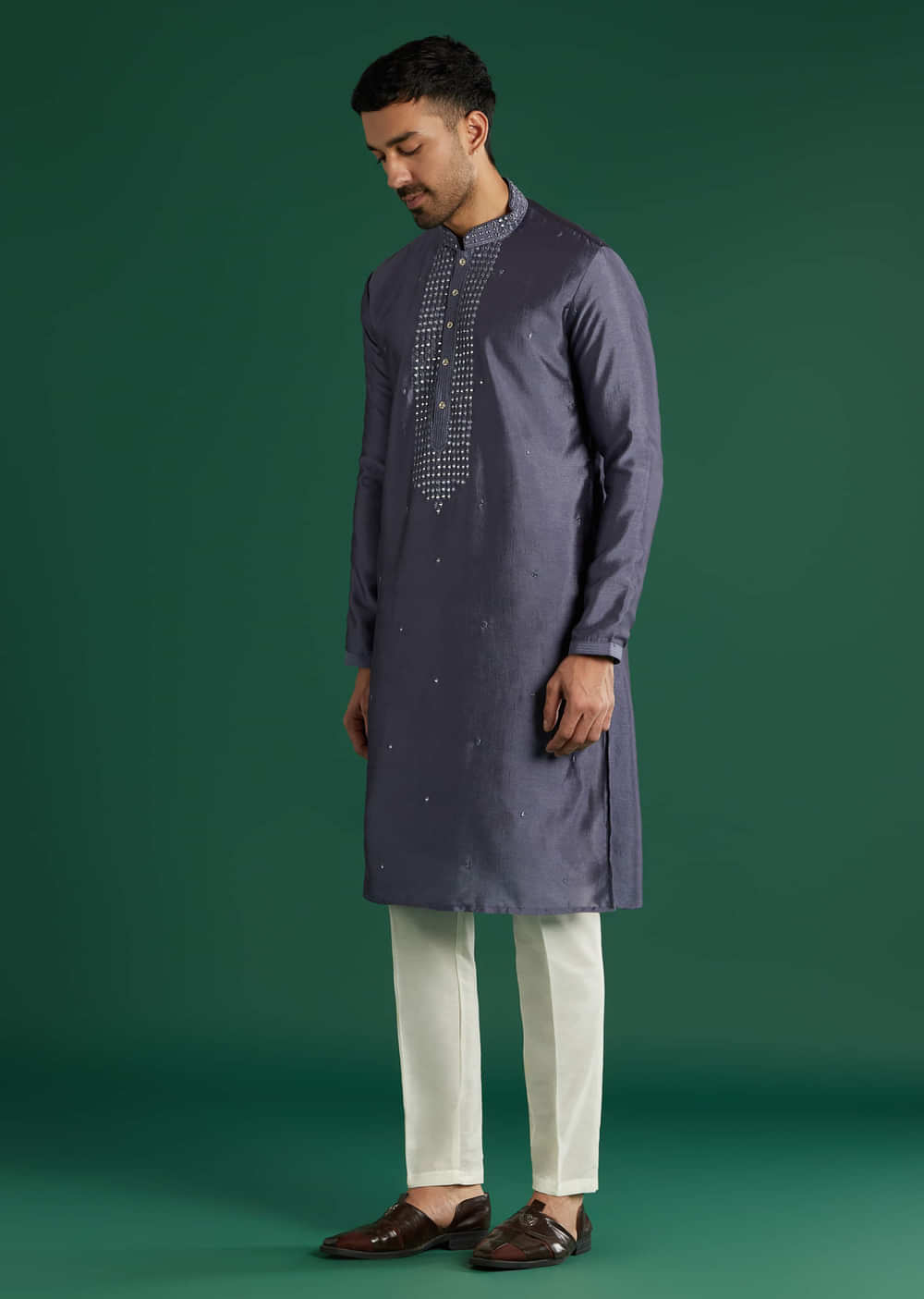 Charcoal Grey Silk Kurta Set For Men With Mirror Work