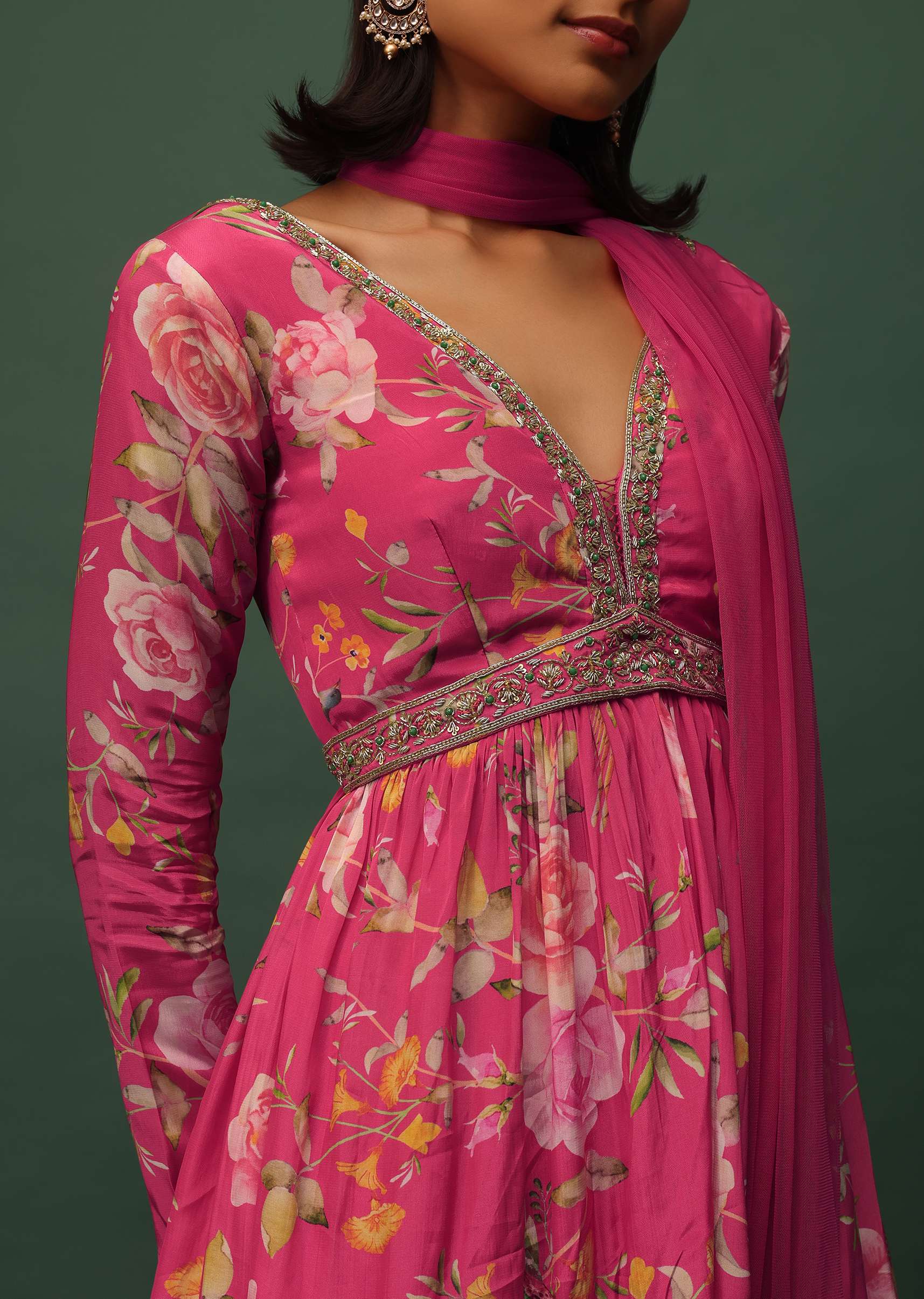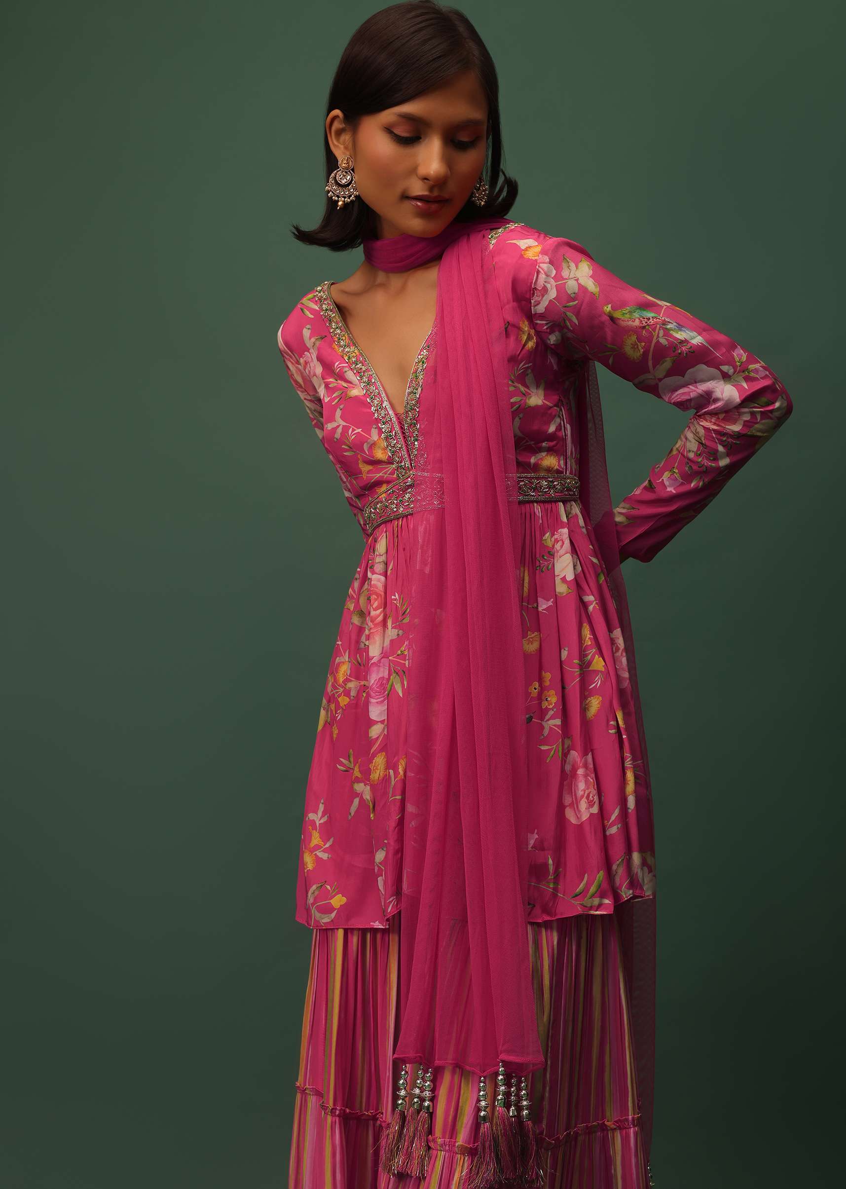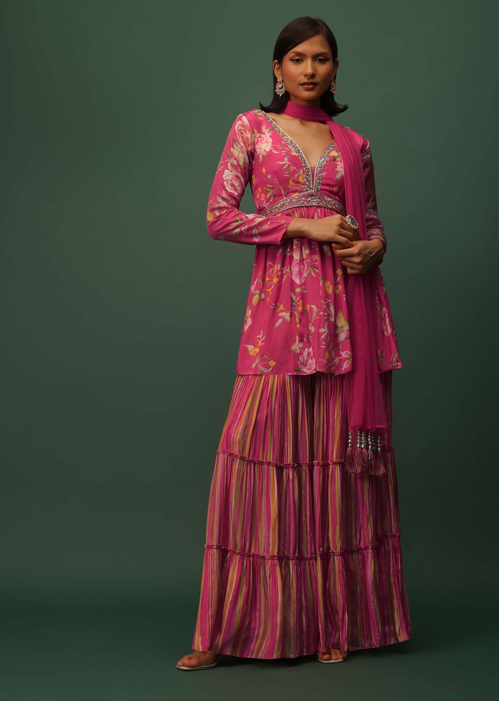 Elevate your style with our stunning pink peplum top and sharara set in satin with a mesmerizing floral print. The top features a flattering V-neckline and 3/4th sleeves creating an... More Product Details