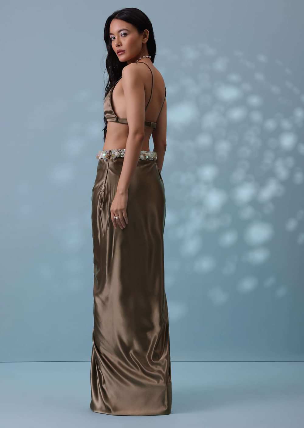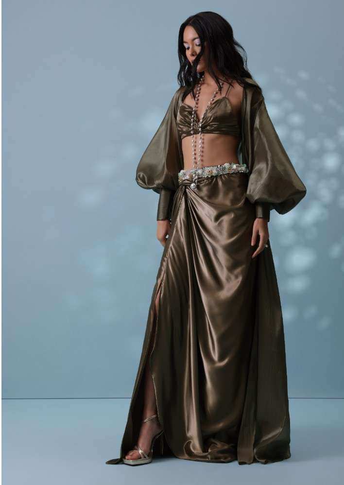 This opulent ensemble is a celebration of elegance and sophistication.The cowl pleated skirt has a 3d embroidered waistband.The strappy bustier blouse comes cinched in the front with a sweetheart neckline.The outfit is further complemented with a long shrug in bishop sleeves.EVENT - Perfect for any chic festive event or cocktail party. Awarded as the Most Trusted Brand, we're delivering styles you love, just as promised.